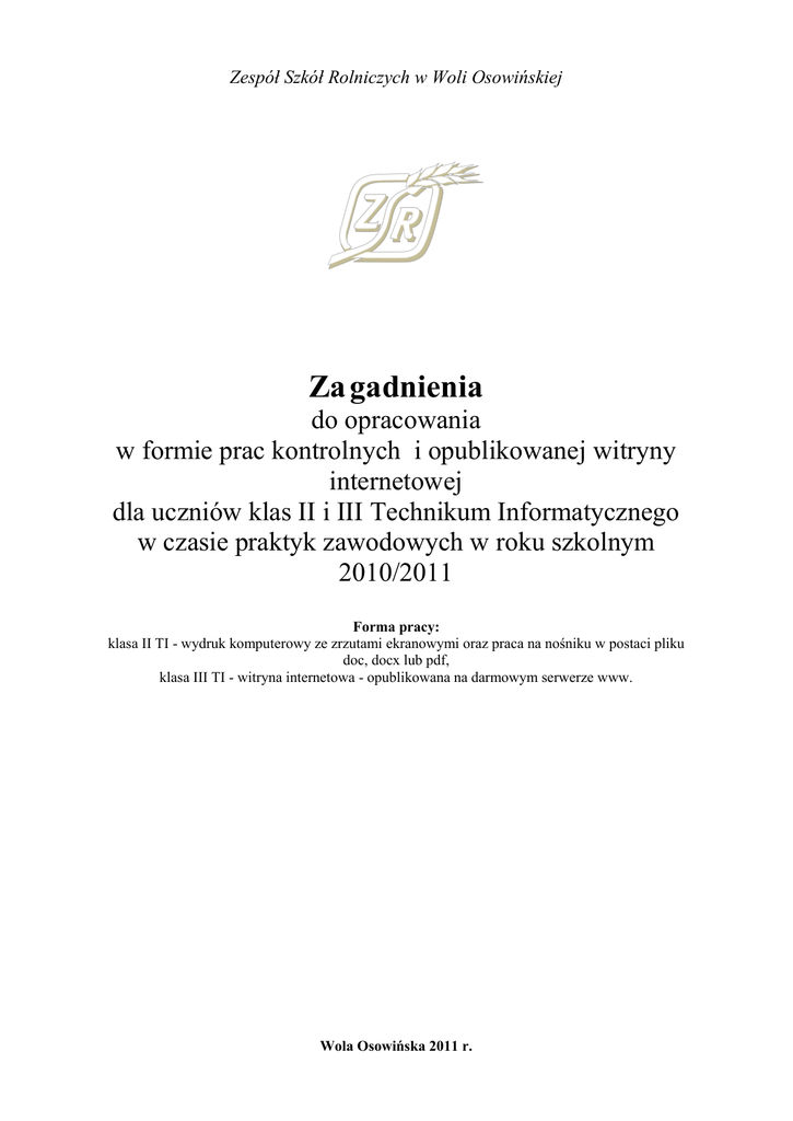 Zespół Szkół Rolniczych w Woli Osowińskiej Za gadnienia do opracowania w formie prac kontrolnych i opublikowanej witryny internetowej dla uczniów klas II i III Technikum Informatycznego w czasie praktyk zawodowych w roku szkolnym 2010/2011 Forma pracy: klasa II TI - wydruk komputerowy ze zrzutami ekranowymi oraz praca na nośniku w postaci pliku doc, docx lub pdf, klasa III TI - witryna internetowa - opublikowana na darmowym serwerze www. Wola Osowińska 2011 r. Zagadnienia dla klasy II Technikum Informatycznego: Temat pracy: Poprawa bezpieczeństwa systemu komputerowego Dział: Zagadnienia szczegółowe: I. Ochrona antywirusowa: II. Ochrona firewall: III. Ochrona przed oprogramowaniem szpiegującym: IV. Inne formy ochrony systemu: Instalacja, konfiguracja i praca z programem antywirusowym Instalacja, konfiguracja i praca z programem tupu firewall Aktywacja i praca z systemowym firewallem MS Windows XP Instalacja i konfiguracja programu do walki ze złośliwym oprogramowaniem Wyłączanie systemowych kont Zastępowanie systemowych programów innymi Konwersja systemu plików z FAT32 na NTFS Aktualizacja systemu- instalacja SP, konfiguracja aktualizacji automatycznych Archiwizacja danych Tworzenie kopii bezpieczeństwa Uwagi do realizacji pracy kontrolnej: W pracy kontrolnej należy opracować cztery zagadnienia szczegółowe (do wyboru po jednym z każdego działu) Opisywane czynności należy dokumentować zrzutami ekranowymi Czynności realizować poprzez wykorzystanie narzedzi systemowych lub jeżeli to uzasadnione - programów typu freeware dostępnych w sieci Internet Pracę należy złożyć po zakończeniu praktyk najpóźniej w dniu 24 maja 2011 r. nauczycielowi/opiekunowi praktyk Zagadnienia dla klasy III Technikum Informatycznego: Temat pracy: Wykonanie witryny internetowej: "LINUX - alternatywa dla systemu operacyjnego MS Windows" Założenia pracy kontrolnej: Witryna wykonana w html, zawierająca następujące informacje: historia rozwoju Linuxa, charakterystyka systemu - cechy, dystrybucje, zalety i wady systemu, interfejs tekstowy i graficzny, uprawnienia do zasobów, oznaczenia dysków, systemy plików, popularne programy narzędziowe i użytkowe w Linuksie. Grafika na stronach zoptymalizowana, kodowanie strony i znaczniki meta, słowa kluczowe, wyszukiwarka, skrypty JavaScript (min. 15 ze stu przykładowych) umieszczone na stronach. Dokumentacja witryny według wzoru. Witryna opublikowana na darmowym serwerze www. Adres strony według wzoru: http://www.inicjaly_linux_ti.domena_hostingowa Uwagi do realizacji pracy kontrolnej: Strona ma być opublikowana do dnia 30 maja 2011 r
