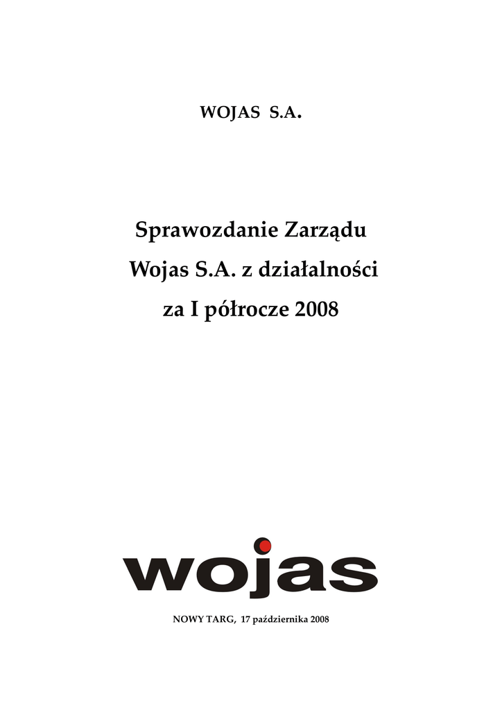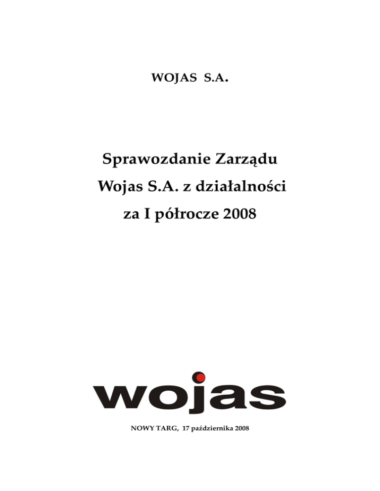 WOJAS S.A. Sprawozdanie Zarządu Wojas S.A. z działalności za I półrocze 2008 NOWY TARG, 17 października 2008 Sprawozdanie Zarządu Wojas SA z działalności za I półrocze 2008 r. SPRAWOZDANIE ZARZĄDU WOJAS S.A. Z DZIAŁALNOŚCI 1. Informacje o Emitencie Nazwa (firma): Forma prawna Emitenta: Kraj siedziby Emitenta: Siedziba i adres: Numer telefonu: Numer faksu: Adres e-mail: Strona internetowa: Numer REGON: Numer NIP: Numer KRS: WOJAS Spółka Akcyjna spółka akcyjna Rzeczpospolita Polska ul. Ludźmierska 29, 34-300 Nowy Targ +48 18 264 92 10 +48 18 264 97 47 +48 18 264 92 11 [email protected] www.wojas.com.pl 120415969 735-26-91-202 0000276622 Skład Zarządu na dzień 17.10.2008 roku przedstawia się następująco: • Wiesław Wojas Prezes Zarządu • Kazimierz Ostatek Wiceprezes Zarządu Skład Rady Nadzorczej na dzień 17.10.2008 roku przedstawia się następująco: • Jan Rybicki Przewodniczący Rady Nadzorczej • Agnieszka Wojas Wiceprzewodniczący Rady Nadzorczej • Barbara Mazur Sekretarz Rady Nadzorczej • Kazimierz Nowakowski Członek Rady Nadzorczej • Konieczny Jacek Członek Rady Nadzorczej Prokurenci: • Barbara Kubacka • Andrzej Podgórski Data utworzenia Emitenta i czas na jaki został utworzony Emitent został utworzony jako spółka WOJAS Spółka Akcyjna z siedzibą w Nowym Targu, na podstawie aktu założycielskiego z dnia 14.02.2007 roku, podpisanego w formie aktu notarialnego, sporządzonego przez notariusza Izabelę Górnik, prowadzącą Kancelarię Notarialną w Nowym Targu przy ul. Kolejowej 5 (Repertorium A numer 1044/2007) przez jedynego założyciela, jakim był Wiesław Wojas. Spółka akcyjna WOJAS S.A. została zarejestrowana w dniu 2 kwietnia 2007 r. w Sądzie Rejonowym dla Krakowa – Śródmieścia w Krakowie, XII Wydział Gospodarczy Krajowego Rejestru Sądowego, (sygnatura akt: KR.XII NSREJ.KRS/1650/07/303). Kapitał zakładowy w dniu rejestracji wynosił 10 000 tys. zł i dzielił się na 10 000 tys. akcji o wartości nominalnej 1,00 zł każda. Wszystkie akcje objął Wiesław Wojas w zamian za wniesiony aport 1 w postaci zorganizowanej części przedsiębiorstwa w rozumieniu art. 55 Kodeksu Cywilnego, obejmującej zespół składników majątkowych i niemajątkowych tworzących zakład produkcji obuwia Zakładów Produkcyjno Handlowych Wojas położonych w Nowym Targu przy ulicy Ludźmierskiej 29. Aport obejmował w szczególności następujące składniki: • nieruchomość gruntową wraz z wybudowanymi na niej budynkami produkcyjnymi i biurowymi, dla której założona jest księga wieczysta NS1T/00077944/3 prowadzona przez Wydział V Ksiąg Wieczystych w Sądzie Rejonowym w Nowym Targu, jak również związane z tą nieruchomością prawa rzeczowe, • maszyny i urządzenia do produkcji obuwia, • materiały, towary i wyroby • prawa wynikające z umów najmu i dzierżawy 2 Sprawozdanie Zarządu Wojas SA z działalności za I półrocze 2008 r. • • • • • • prawa wynikające z zawartych umów handlowych, wierzytelności, prawa z papierów wartościowych i środki pieniężne, licencje i zezwolenia, znaki towarowe i inne prawa wynikające z własności przemysłowej, tajemnice przedsiębiorstwa, księgi i dokumenty związane z prowadzeniem działalności gospodarczej. Zgodnie ze Statutem, czas trwania spółki jest nieograniczony. Podstawowym przedmiotem działalności Spółki jest Produkcja obuwia – PKD 19.30. Ponadto Spółka może świadczyć działalność: • Sprzedaż detaliczna obuwia i wyrobów skórzanych – PKD 52.43 • Sprzedaż hurtowa odzieży i obuwia – PKD 51.42 • Sprzedaż hurtowa wyrobów skórzanych –PKD 51.47 • Sprzedaż detaliczna odzieży – PKD 52.42 • Sprzedaż detaliczna pamiątek i wyrobów rzemieślniczych 52.48 • Sprzedaż detaliczna dowolnych towarów wysłanych do zamawiającego na podstawie wyboru dokonanego w oparciu o ogłoszenia, katalogi, modele i inne środki reklamy, zamieszczane na stronach internetowych sprzedającego, zamawianych za pośrednictwem internetu – PKD 52.61. Istotne zdarzenia w rozwoju działalności gospodarczej Emitenta Po utworzeniu spółki akcyjnej, mając na względzie jej dalszy intensywny rozwój, zarząd podjął decyzję o wprowadzeniu akcji Emitenta do obrotu na rynku regulowanym prowadzonym przez Giełdę Papierów Wartościowych w Warszawie oraz przeprowadzeniu oferty publicznej akcji nowej emisji. W dniu 31 października 2007 r. Nadzwyczajne Walne Zgromadzenie Emitenta podjęło decyzję o podwyższeniu kapitału zakładowego poprzez publiczną emisję akcji serii B. W dniu 25 lutego 2008 r. Komisja Nadzoru Finansowego zatwierdziła prospekt emisyjny Emitenta i od tego dnia Emitent stał się spółką publiczną. Publiczna subskrypcja akcji serii B przeprowadzona była w okresie od 13 do 20 marca 2008 r., a debiut Spółki WOJAS S.A. na Giełdzie Papierów Wartościowych w Warszawie nastąpił dnia 02 kwietnia 2008 r. Podwyższenie kapitału akcyjnego zostało zarejestrowane przez Sąd Rejonowy KRS dla Krakowa-Śródmieście w dniu 30 kwietnia 2008 r. WOJAS S.A. kontynuuje działalność prowadzoną przez jedynego założyciela Wiesława Wojasa od roku 1990 w formie jednoosobowej działalności gospodarczej ZPH WOJAS. W początkowym okresie działalności firma funkcjonowała jako niewielki zakład produkcyjny, który zatrudniał kilkanaście osób i produkował kilkadziesiąt tysięcy par obuwia rocznie. W 1994 r. ZPH WOJAS nabyły część majątku dawnych Nowotarskich Zakładów Przemysłu Skórzanego „PODHALE”. W kolejnych latach systematycznie rozwijano firmę poprzez zakup nowych urządzeń, wzrost zatrudnienia oraz zdobywanie nowych rynków sprzedaży. Do 01 kwietnia 2007 r. przedsiębiorstwo działało pod nazwą Zakłady Produkcyjno-Handlowe WOJAS Wiesław Wojas. Pierwszy sklep firmowy WOJAS powstał już w 1991 r. W roku 1996 r. z ZPH WOJAS wyodrębniła się spółka handlowa WOJAS Trade sp. z o.o., która przeję