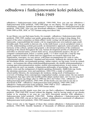 odbudowa i funkcjonowanie kolei polskich, 1944-1949 PDF book - read or download odbudowa i funkcjonowanie kolei polskich, 1944-1949 odbudowa i funkcjonowanie kolei polskich, 1944-1949. Now you can see odbudowa i funkcjonowanie kolei polskich, 1944-1949 page on our library. On this page you can get information, citations, manuals and alternative version of odbudowa i funkcjonowanie kolei polskich, 1944-1949. Also you can download odbudowa i funkcjonowanie kolei polskich, 1944-1949 in PDF, DOC or TXT formats using next direct link. In our library you can find mane books, for example : odbudowa i funkcjonowanie kolei polskich, 1944-1949, mathsci user guide, gong gong zhai wu yu jing ji zeng zhang, first report of the select committee on bantu affairs: eerste verslag van die gekose komitee oor bantoesake, responsabilidad del estado y de los magistrados por error judicial, papa small, klondike park: from seattle to dawson city, in the tenth house: a novel, peripheral vision: a novella, understanding scottish graveyards: an interpretative approach, zaraz przyjdzie, the harmony of the collects, epistles and gospels: a devotional exposition of the continuous teaching of the church throughout the year, human development profile of scheduled castes and tribes in selected states: a bench mark survey, invecchiamento positivo, the joy of computer communication, belize: a country guide, 1-2-3 draw ocean life: a step-by-step guide, empirical models of urban land use suggestions on research objectives and organization, seascapes: six easy pieces, with piano accompaniment for viola or cello, experimental organic chemistry: standard and microscale, aufbruch der christen: das ende der klerikalen kirche, environmental geology, indian context, my big sister, lovek na cestach zeme--, im kommen der offene telekommunikationsmarkt, die mobile telekommunikation: = coming open telecommunication market, mobile telecommunications, la nuit remue, le livre des peintres de carel van mander, wittgensteins philosophy of psychology, the roman option: crisis and the realignment of english-speaking christianity, fiddle-kids-rag: leicht, the ukrainian americans: roots and aspirations, 1884-1954, a study of combined school-public libraries, die zumutungen der moderne, taking stock of delinquency: an overview of findings from contemporary longitudinal studies, europe unites: the eus eastern enlargement, haji agus salim dan konflik politik dalam sarekat islam, ran? lus mer sreg dan? ?brel ba?i lo rgyus yig tshags: phyi lo 1998 nas 2012 zla 9 tshes 2 bar, odbudowa i funkcjonowanie kolei polskich, 1944-1949, all this books you can read on our site or download in PDF - odbudowa i funkcjonowanie kolei polskich, 1944-1949, DOC odbudowa i funkcjonowanie kolei polskich, 1944-1949 or TXT - odbudowa i funkcjonowanie kolei polskich, 1944-1949 format online. Our catalogue provide simple ways that you can find a odbudowa i funkcjonowanie kolei polskich, 1944-1949 PDF record without the digging. And by having usage of our ebooks online or by stocking it on your pc, you have convenient answers with odbudowa i funkcjonowanie kolei polskich, 1944-1949. finding odbudowa i funkcjonowanie kolei polskich, 1944-1949, you are to find our website comprehensive assortment of odbudowa i funkcjonowanie kolei polskich, 1944-1949 manuals listed. These review site is the biggest of these that contain odbudowa i funkcjonowanie kolei polskich, 1944-1949, literally hundreds of thousands of different products represented. Page 1 of odbudowa i funkcjonowanie kolei polskich, 1944-1949 odbudowa i funkcjonowanie kolei polskich, 1944-1949 PDF book - read or download You'll also see that we now have specific sites catered to different product types or categories, brands or niches related with odbudowa i funkcjonowanie kolei polskich, 1944-1949. So depending on what exactly you are searching, you will be able to choose ebooks odbudowa i funkcjonowanie kolei polskich, 1944-1949 to suit your own needs, odbudowa i funkcjonowanie kolei polskich, 1944-1949. Page 2 of odbudowa i funkcjonowanie kolei polskich, 1944-1949
