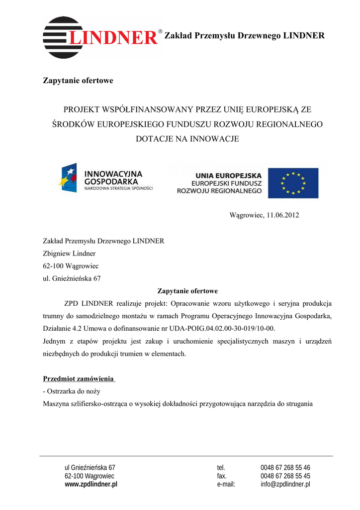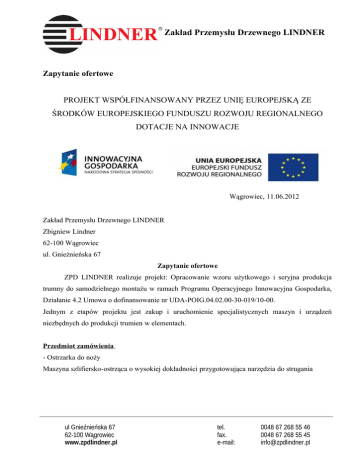 Zakład Przemysłu Drzewnego LINDNER Zapytanie ofertowe PROJEKT WSPÓŁFINANSOWANY PRZEZ UNIĘ EUROPEJSKĄ ZE ŚRODKÓW EUROPEJSKIEGO FUNDUSZU ROZWOJU REGIONALNEGO DOTACJE NA INNOWACJE Wągrowiec, 11.06.2012 Zakład Przemysłu Drzewnego LINDNER Zbigniew Lindner 62-100 Wągrowiec ul. Gnieźnieńska 67 Zapytanie ofertowe ZPD LINDNER realizuje projekt: Opracowanie wzoru użytkowego i seryjna produkcja trumny do samodzielnego montażu w ramach Programu Operacyjnego Innowacyjna Gospodarka, Działanie 4.2 Umowa o dofinansowanie nr UDA-POIG.04.02.00-30-019/10-00. Jednym z etapów projektu jest zakup i uruchomienie specjalistycznych maszyn i urządzeń niezbędnych do produkcji trumien w elementach. Przedmiot zamówienia - Ostrzarka do noży Maszyna szlifiersko-ostrząca o wysokiej dokładności przygotowująca narzędzia do strugania ul Gnieźnieńska 67 62-100 Wągrowiec www.zpdlindner.pl tel. fax. e-mail: 0048 67 268 55 46 0048 67 268 55 45 [email protected] Zakład Przemysłu Drzewnego LINDNER Opis przedmiotu zamówienia Maszyna do ostrzenia noży o różnych profilach , Możliwość ostrzenia noży w cyklu automatycznym, - bezdotykowy pomiar promienia i wysokości narzędzia z możliwością wyświetlania danych na elektronicznym wyświetlaczu Możliwość wykrawania nowych profili wg wzornika. Uchwyt dla narzędzi szybko wymiennych w czasie 5 sek. Adapter do mocowania konwencjonalnych narzędzi. Projektor do optycznej ewidencji wymiarów , Karta pomiarowa do ręcznego wprowadzania pozycji narzędzia i przygotowania do podłączenia modemu PC Minimalne parametry techniczne : długość narzędzi 355 mm. kąt przyłożenia: - promieniowy 10-25 stopni - boczny 0-15stopni - głowice proste 60 stopni Obroty ściernicy 4 stopniowe (lewe i prawe) 1500 -2000-2400-3000/ min. Kryteria wyboru KRYTERIA WYBORU Cena netto oferty PUNKTACJA 50 pkt. OCENA KRYTERIUM C min Cena = ------------- * 50 Cr C min – cena oferty minimalnej Cr – cena oferty rozpatrywanej Parametry techniczne 30 pkt. Za każdy wymagany element przyznane zostanie odpowiednio pkt. 1. Możliwość stosowania narzędzi szybkiego montażu - 10 pkt. ul Gnieźnieńska 67 62-100 Wągrowiec www.zpdlindner.pl tel. fax. e-mail: 0048 67 268 55 46 0048 67 268 55 45 [email protected] Zakład Przemysłu Drzewnego LINDNER 2. Bezdotykowy pomiar narzędzia po ostrzeniu - 10 pkt. 3. Możliwość wykonywania i ostrzenia noży w cyklu automatycznym - 5 pkt. 4. Obroty ściernicy 4 stopniowe-5 pkt. W przypadku braku parametru przyznanych zostanie 0 pkt. Gwarancja na sprzęt 20 pkt. Punkty 0-20 przyznawane na podstawie danych zawartych w ofercie według zasad: gwarancja do 12 m-cy gwarancja 13-24 m-cy - 0 pkt. - 10 pkt. gwarancja powyżej 25 m-cy - 20 pkt. Maksymalna ilość pkt. do zdobycia – 100 pkt. Miejsce i sposób składania ofert - Za pośrednictwem poczty elektronicznej na adres : [email protected] - Wysyłka na nasz adres pocztowy firmy : Zakład Przemysłu Drzewnego LINDNER Zbigniew Lindner 62-100 Wągrowiec ul. Gnieźnieńska 67 Dodatkowe wymagania formalne - Termin składania ofert – do 26.06.2012 - Okres ważności oferty – do końca roku 2012 - Oferta powinna być sporządzona na papierze firmowym oferenta lub opatrzona pieczątką firmową i podpisem. - Wartość netto określona w walucie PLN lub EUR Informacje dotyczące zapytania ofertowego udziela: ul Gnieźnieńska 67 62-100 Wągrowiec www.zpdlindner.pl tel. fax. e-mail: 0048 67 268 55 46 0048 67 268 55 45 [email protected] Zakład Przemysłu Drzewnego LINDNER - Zakład Przemysłu Drzewnego LINDNER – Krzysztof Bromberek – Kierownik Produkcji - Kontakt telefoniczny – 67 268 55 46 lub 601 954 627 - adres e-mail - [email protected] ul Gnieźnieńska 67 62-100 Wągrowiec www.zpdlindner.pl tel. fax. e-mail: 0048 67 268 55 46 0048 67 268 55 45 [email protected]