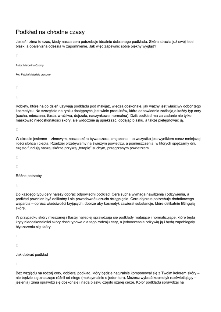 Podkład na chłodne czasy Jesień i zima to czas, kiedy nasza cera potrzebuje idealnie dobranego podkładu. Skóra straciła już swój letni blask, a opalenizna odeszła w zapomnienie. Jak więc zapewnić sobie piękny wygląd? Autor: Marcelina Czorny Fot. Fotolia/Materiały prasowe Kobiety, które na co dzień używają podkładu pod makijaż, wiedzą doskonale, jak ważny jest właściwy dobór tego kosmetyku. Na szczęście na rynku dostępnych jest wiele produktów, które odpowiednio zadbają o każdy typ cery (sucha, mieszana, tłusta, wrażliwa, dojrzała, naczynkowa, normalna). Dziś podkład ma za zadanie nie tylko maskować niedoskonałości skóry, ale widocznie ją upiększać, dodając blasku, a także pielęgnować ją. W okresie jesienno – zimowym, nasza skóra bywa szara, zmęczona – to wszystko jest wynikiem coraz mniejszej ilości słońca i ciepła. Rzadziej przebywamy na świeżym powietrzu, a pomieszczenia, w których spędzamy dni, często fundują naszej skórze przykrą „terapię” suchym, przegrzanym powietrzem. Różne potrzeby Do każdego typu cery należy dobrać odpowiedni podkład. Cera sucha wymaga nawilżenia i odżywienia, a podkład powinien być delikatny i nie powodować uczucia ściągnięcia. Cera dojrzała potrzebuje dodatkowego wsparcia – oprócz właściwości kryjących, dobrze aby kosmetyk zawierał substancje, które delikatnie liftingują skórę. W przypadku skóry mieszanej i tłustej najlepiej sprawdzają się podkłady matujące i normalizujące, które będą kryły niedoskonałości skóry dość typowe dla tego rodzaju cery, a jednocześnie odżywią ją i będą zapobiegały błyszczeniu się skóry. Jak dobrać podkład Bez względu na rodzaj cery, dobieraj podkład, który będzie naturalnie komponował się z Twoim kolorem skóry – nie będzie się znacząco różnił od niego (maksymalnie o jeden ton). Możesz wybrać kosmetyk rozświetlający – jesienią i zimą sprawdzi się doskonale i nada blasku często szarej cerze. Kolor podkładu sprawdzaj na wewnętrznej stronie nadgarstka. Nakładanie podkładu nie jest trudne, jeśli pamiętasz o tym, aby nie użyć go za dużo. Nadmiar będzie się „mazał” na twarzy, pozostawiając nierównomiernie rozsmarowane smugi. Zbyt duża ilość utrudnia też uzyskanie naturalnie wyglądającego makijażu i sprawia, że na twarzy powstanie maska. Staraj się dokładnie rozsmarować podkład w miejscach styku z uszami i szyją, aby kolor płynnie komponował się ze skórą na reszcie ciała. Do nakładania podkładu możesz użyć palców i delikatnie wklepywać kosmetyk. Sprawdzają się też gąbki i pędzle. Polecamy Długotrwały podkład matujący Smashbox Studio Skin 15 Hour Wear Foundation sprawia, że skóra jest nieskazitelnie gładka i matowa nawet do 15 godzin. Jego lekka, beztłuszczowa formuła zapewnia naturalny makijaż, a dzięki antyoksydantom i witaminom (A, C i E) skóra otrzymuje doatkową porcję pielęgnacji. Zawiera filtr SPF 10. Dostępny w 8 odcieniach. Cena: 195 zł Firma Wibo opracowała rozjaśniający fluid Illuminating, w czterech odcieniach, który idealnie wygładza skórę, dodając jej niepowtarzalnego blasku. Podkład został stworzony z myślą o delikatnej i suchej cerze. Dzięki obecności aktywnego kompleksu z naturalnych węglowodanów Pentavihinu®, odpowiednio nawilża skórę, utrzymując właściwy poziom wilgotności. Ma dobre właściwości kryjące, a jednocześnie daje naturalny wygląd. Cera jest gładka i rozświetlona, dzięki czemy wygląda świeżo i promiennie. Cena: 10 zł Podkład Oriflame Beauty Studio Artist, z pierwszej serii profesjonalnych kosmetyków do makijażu, poradzi sobie z każdym światłem, dzięki zawartości kompleksu Illuma Flair™, który rozprasza światło rozświetla cerę i nadaje jej doskonały, naturalny wygląd, przy bardzo dobrych właściwościach kryjących. Ogromnym plusem kosmetyku jest jego lekka formuła, która wspaniale sprawdza się na skórze i sprawia, że jest ona nawilżona promienna oraz się nie błyszczy. Podkład zawiera filtr SPF 15. Dostępny w 5 odcieniach. Cena: 46,90 zł Light Touch Natural Radiant Make-Up marki IsaDora nadaje cerze nieskazitelny, naturalny wygląd oraz promienny blask. Lekka, kremowa konsystencja sprawia, że podkład idealnie stapia się ze skórą zapewniając średni stopień krycia. Składniki aktywne zawarte w podkładzie (mi.in. ekstrakt z nasion Vigna Aconitifolia – alternatywa dla retinolu, ekstrakt z soi) chronią komórki przed szkodliwym działaniem czynników zewnętrznych, intensywnie je nawilżają oraz minimalizują oznaki starzenia się skóry. SPF 15 zabezpiecza przed promieniowaniem UV. Podkład jest dostępny w 6 odcieniach. Cena: 79,50 zł