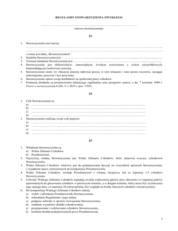 REGULAMIN STOWARZYSZENIA ZWYKŁEGO ……………………………………………………………………………………. (nazwa stowarzyszenia) §1. 1. 2. 3. 4. 5. 6. 7. Stowarzyszenie nosi nazwę: ...………………………………..…………………………………………………………………………………….. ………………………………………………………………………………………………….…………………….. i zwane jest dalej „Stowarzyszeniem”. Siedzibą Stowarzyszenia jest ……………………………........................................................................................... Terenem działania Stowarzyszenia jest ……………………………………………………………........................... Stowarzyszenie jest dobrowolnym, samorządnym, trwałym zrzeszeniem o celach niezarobkowych, nieposiadającym osobowości prawnej. Stowarzyszenie może we własnym imieniu nabywać prawa, w tym własność i inne prawa rzeczowe, zaciągać zobowiązania, pozywać i być pozywane. Stowarzyszenie opiera swoją działalność na społecznej pracy członków. Podstawą działania są postanowienia niniejszego regulaminu oraz przepisów ustawy z dn. 7 kwietnia 1989 r. Prawo o stowarzyszeniach (Dz. U z 2015 r. poz. 1393). §2. 1. 2. Cele Stowarzyszenia to: a) ……………………………............................................................................................................ b) ………………………………………………………………………………………..………….. c) ……………………………………………………………….…………………………………... d) …………………………………………………………………..……………………………….. Stowarzyszenie realizuje swoje cele poprzez: a) ……………………………………………………………………….…………………………… b) ……………………………………………………………………………….…………………… c) …………………………………………………………………………….……………………… d) ………………………………………………………………………………………………….… §3. 1. 2. 3. 4. 5. 6. Władzami Stowarzyszenia są: a) Walne Zebranie Członków, b) Przedstawiciel. Najwyższą władzą Stowarzyszenia jest Walne Zebranie Członków, które stanowią wszyscy członkowie Stowarzyszenia. Walne Zebranie Członków właściwe jest do podejmowania decyzji we wszystkich sprawach Stowarzyszenia, z wyjątkiem spraw zastrzeżonych do kompetencji Przedstawiciela. Walne Zebranie Członków zwołuje Przedstawiciel z własnej inicjatywy lub co najmniej 1/3 członków Stowarzyszenia. Uchwały Walnego Zebrania Członków zapadają zwykłą większością głosów przy obecności co najmniej połowy uprawnionych do głosowania członków w pierwszym terminie, a w drugim terminie, który może być wyznaczony tego samego dnia, co najmniej 30 minut później, bez względu na liczbę obecnych członków stowarzyszenia. Do kompetencji Walnego Zebrania Członków należą: a) wybór i odwołanie Przedstawiciela Stowarzyszenia, b) uchwalanie Regulaminu i jego zmian, c) podjęcie uchwały w sprawie rozwiązania Stowarzyszenia, d) ustalanie wysokości składki członkowskiej, e) przyjmowanie i wykluczanie członków Stowarzyszenia, f) kontrola działań podejmowanych przez Przedstawiciela, 1 g) ……………………………………………………………….., h) ………………………………………………………………… 8. Do kompetencji i obowiązków Przedstawiciela należy: a) reprezentowanie Stowarzyszenia na zewnątrz i działanie w jego imieniu, b) wykonywanie uchwał Walnego Zebrania Członków, c) kierowanie bieżącą działalnością Stowarzyszenia, d) zarządzanie środkami finansowymi Stowarzyszenia, zgodnie z obowiązującymi przepisami prawa, niniejszym Regulaminem oraz uchwałami Walnego Zebrania Członków, e) informowanie organu nadzorującego o zdarzeniach uzasadniających zmianę wpisu w ewidencji stowarzyszeń zwykłych (w terminie 7 dni od dnia wystąpienia zdarzenia) oraz o zmianie swojego miejsca zamieszkania, f) …………………………………………………………., g) …………………………………………………………. 9. Podejmowanie przez Przedstawiciela czynności przekraczających zakres zwykłego zarządu wymaga uprzedniej zgody wszystkich członków stowarzyszenia zwykłego oraz udzielenia przez nich pełnomocnictwa do dokonania tych czynności. 10. Czynnościami przekraczającymi zakres zwykłego zarządu są w szczególności: a) nabycie oraz zbycie nieruchomości lub prawa użytkowania wieczystego, b) ustanowienie ograniczonego prawa rzeczowego, c) zawarcie umowy kredytu albo pożyczki, d) przejęcie długu, uznanie długu, zwolnienie z długu, przystąpienie do długu, zawarcie umowy poręczenia lub zawarcie innej podobnej umowy, e) zaciągnięcie innych zobowiązań przekraczających wartość 10000 zł. §4. 1. 2. 3. 4. Członkiem stowarzyszenia może być osoba fizyczna posiadająca obywatelstwo polskie (lub cudzoziemiec mający w Polsce miejsce zamieszkania) posiadająca pełną zdolność do czynności prawnych i niepozbawiona praw publicznych, która złoży Przedstawicielowi pisemną deklarację o przystąpieniu do Stowarzyszenia oraz akceptacji jego Regulaminu. Uchwałę o nadaniu członkostwa podejmuje Walne Zebranie Członków. Członkostwo w Stowarzyszeniu ustaje na skutek: a) wykluczenia członka przez Walne Zebranie Członków, b) pisemnej rezygnacji złożonej Przedstawicielowi Stowarzyszenia, c) utraty praw obywatelskich na mocy prawomocnego wyroku sądu, d) śmierci członka. Członkowie Stowarzyszenia mają praw