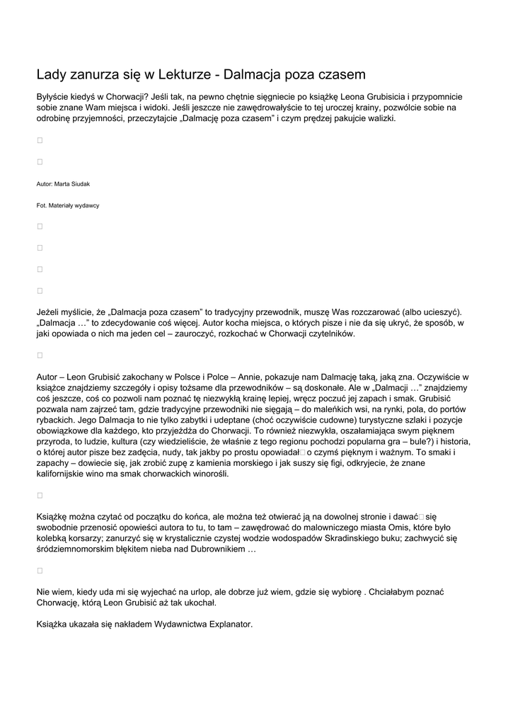 Lady zanurza się w Lekturze - Dalmacja poza czasem Byłyście kiedyś w Chorwacji? Jeśli tak, na pewno chętnie sięgniecie po książkę Leona Grubisicia i przypomnicie sobie znane Wam miejsca i widoki. Jeśli jeszcze nie zawędrowałyście to tej uroczej krainy, pozwólcie sobie na odrobinę przyjemności, przeczytajcie „Dalmację poza czasem” i czym prędzej pakujcie walizki. Autor: Marta Siudak Fot. Materiały wydawcy Jeżeli myślicie, że „Dalmacja poza czasem” to tradycyjny przewodnik, muszę Was rozczarować (albo ucieszyć). „Dalmacja …” to zdecydowanie coś więcej. Autor kocha miejsca, o których pisze i nie da się ukryć, że sposób, w jaki opowiada o nich ma jeden cel – zauroczyć, rozkochać w Chorwacji czytelników. Autor – Leon Grubisić zakochany w Polsce i Polce – Annie, pokazuje nam Dalmację taką, jaką zna. Oczywiście w książce znajdziemy szczegóły i opisy tożsame dla przewodników – są doskonałe. Ale w „Dalmacji …” znajdziemy coś jeszcze, coś co pozwoli nam poznać tę niezwykłą krainę lepiej, wręcz poczuć jej zapach i smak. Grubisić pozwala nam zajrzeć tam, gdzie tradycyjne przewodniki nie sięgają – do maleńkich wsi, na rynki, pola, do portów rybackich. Jego Dalmacja to nie tylko zabytki i udeptane (choć oczywiście cudowne) turystyczne szlaki i pozycje obowiązkowe dla każdego, kto przyjeżdża do Chorwacji. To również niezwykła, oszałamiająca swym pięknem przyroda, to ludzie, kultura (czy wiedzieliście, że właśnie z tego regionu pochodzi popularna gra – bule?) i historia, o której autor pisze bez zadęcia, nudy, tak jakby po prostu opowiadał o czymś pięknym i ważnym. To smaki i zapachy – dowiecie się, jak zrobić zupę z kamienia morskiego i jak suszy się figi, odkryjecie, że znane kalifornijskie wino ma smak chorwackich winorośli. Książkę można czytać od początku do końca, ale można też otwierać ją na dowolnej stronie i dawać się swobodnie przenosić opowieści autora to tu, to tam – zawędrować do malowniczego miasta Omis, które było kolebką korsarzy; zanurzyć się w krystalicznie czystej wodzie wodospadów Skradinskiego buku; zachwycić się śródziemnomorskim błękitem nieba nad Dubrownikiem … Nie wiem, kiedy uda mi się wyjechać na urlop, ale dobrze już wiem, gdzie się wybiorę . Chciałabym poznać Chorwację, którą Leon Grubisić aż tak ukochał. Książka ukazała się nakładem Wydawnictwa Explanator.