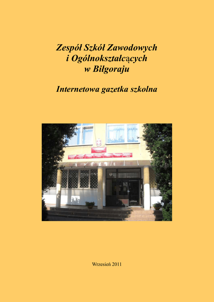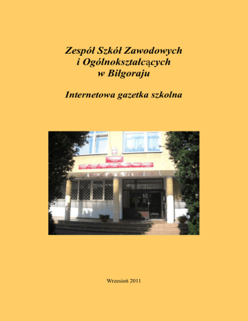 Zespół Szkół Zawodowych i Ogólnokształcących w Biłgoraju Internetowa gazetka szkolna Wrzesień 2011 W bieżącym numerze publikujemy zdjęcia klas pierwszych Liceum Ogólnokształcącego. Klasa I A wychowawca: Pani Ewa Pintal Klasa I B Wychowawca: Pani Agnieszka Ferenc-Cieślak Klasa I C Wychowawca: Pani Zofia Małek Klasa I LU Wychowawca: Pani Paulina Lal W kolejnym numerze zdjęcia klas technikum Wywiad z Panią Jadwigą Garą– wicedyrektorem ZSZiO przeprowadzony dnia 19 września 2011r. przez uczennice naszej szkoły. Redakcja: Ile lat pracuje Pani w szkole, a ile na stanowisku zastępcy dyrektora? Pani: W szkole pracuję już 17 lat. Stanowisko zastępcy dyrektora objęłam w 2005 roku. Redakcja: Czy praca na stanowisku wicedyrektora jest bardzo stresująca? Pani: Praca na tym stanowisku jest stresująca, ponieważ wiąże się z odpowiedzialnością. Na początku, musiałam się wielu rzeczy nauczyć, niektóre obowiązki były dla mnie zupełnie nowe. Myślę, że z roku na rok jest mi coraz łatwiej, gdyż mogę wykorzystać nabyte przez lata doświadczenia. Jednak w dalszym ciągu muszę się doskonalić, aby wykonywać swoje obowiązki jak najlepiej, z pożytkiem dla całej szkoły. Redakcja: Będąc na tym stanowisku, jakie ma Pani obowiązki i przydzielone zadania? Pani: Zajmuję się sprawami wychowawczymi szkoły, profilaktyką, egzaminami potwierdzającymi kwalifikacje zawodowe oraz sprawami kadrowymi. Nadzoruję pracę zespołów przedmiotowych działu odzieżowego, mechanicznego, ekonomicznego i gastronomiczno – hotelarskiego. Moim zadaniem jest również organizowanie pomocy stypendialnej dla uczniów. Redakcja: Jakich przedmiotów uczyła Pani i uczy w naszej szkole? Pani: Z wykształcenia jestem inżynierem włókiennikiem, uczę przedmiotów tj. podstawy projektowania odzieży, pracownia modelowania odzieży oraz organizowanie procesów produkcyjnych. Redakcja: Jakie działania profilaktyczne są podejmowane w naszej szkole? Pani: W naszej szkole jest prowadzonych wiele takich działań. Organizujemy spotkania profilaktyczne ze specjalistami, odbywają się spektakle teatralno – profilaktyczne, realizujemy programy profilaktyczne. Prowadzone są również działania promujące zdrowy styl życia. Profilaktyką zajmują się nie tylko pani pedagog i psycholog, wychowawcy klas, ale także wszyscy nauczyciele. Staramy się, aby działania te były prowadzone jak najlepiej i z jak najlepszym skutkiem. Redakcja: Jakie problemy wychowawcze są w naszej szkole i jakie działania są podejmowane w celu ich rozwiązania? Pani: Jesteśmy dużą szkołą, więc problemów wychowawczych w naszej szkole nigdy nie brakuje, a podejmowanie działań pomagających w ich rozwiązywaniu jest wyjątkowo ważne. Pani pedagog i psycholog odgrywają szczególną rolę w rozwiązywaniu trudnych problemów wychowawczych. Poprzez rozmowy z uczniami, starają się wpływać na zachowanie młodych ludzi. Problemem jest absencja uczniów na zajęciach lekcyjnych, agresja oraz nikotynizm wśród młodzieży. Zawsze staramy się szybko reagować na niepokojące nas sygnały. Redakcja: Dziękujemy bardzo za wywiad i życzymy satysfakcji z wykonywanej pracy. Credo życiowe: Podstawą owocnej pracy, sukcesów jest współpraca z ludźmi. Ulubiona książka: Lubię czytać książki, które pozwalają na odrobinę relaksu np. kryminały. Ulubiona potrawa: Naleśniki pod wszelką postacią. Ulubiona muzyka: Rozrywkowa Ulubiony sposób spędzania wolnego czasu: Przebywanie na świeżym powietrzu i spacery, na które niestety nie mam zbyt wiele czasu. Wywiad przeprowadziły: Kasia i Brygida „Co dobre szybko się kończy” – „Czas wolności, czas odpoczynku…” - już niestety za nami. Skończyły się wakacje, spanie do 1200, czy powroty nad ranem. Od 1 września wróciła nasza szkoła, szara rzeczywistość. Czy będzie aż tak źle? Zapewne nie! Musimy tylko całkiem spokojnie i racjonalnie podejść do nieodłącznej dziedziny naszego nastoletniego życia, jaką jest szkoła! Najważniejsze, aby potraktować ją nie jako karę, ale obowiązek. Powinniśmy przyjąć do świadomości, iż kolejne lata edukacji wcale nas nie krzywdzą – są one przepustką do lepszego życia. Nie jest ważne, do jakiej szkoły chodzimy. Liczy się tylko to, ile sami z niej wyniesiemy. „A wakacje? Przecież powinny być dłuższe!” – powie większość. Jako tegoroczna maturzystka zdecydowanie poprę tę tezę. Jednak zastanówmy się przez chwilę – czy długo byśmy tak wytrzymali? Czy w życiu na pewno chodzi tylko o imprezy, letnie romanse, czy złudne marzenia? Wydaje mi się, że nie! Nasze życie nie jest długie. Nie warto go przespać! Wręcz nie można! Zachęcam Was gorąco do pogłębiania wiedzy, wychodząc z założenia, iż lepiej pouczyć się przez te kilka lat, niż w kolejnych etapach życia martwić się, czy zdołamy zarobić na czynsz itp. Jeżeli przez cały ten rok solidnie będziemy się uczyć, to w nagrodę już za 9 miesięcy będą znowu zasłużone wakacje. Diana W tym numerze prezentujemy wiersze naszej uczennicy Patrycji Turczyńskiej z kl. IV TG Jak iskra ognia, niezauważana zostawiasz ślad. Ja z bólem zostaję poparzona do końca swych lat. Leczyć bliznę staram się, zniechęcona i wali się mój świat. Bo Ty, jak iskra ognia rozpalona, zostawiasz po sobie ślad. Tak to jesień, skończyło się lato kochany, tyle jeszcze planów miałeś lecz „trudno” mówisz, za rok znów zaświeci słońce a ścieżki którymi chodziłeś znów zazieleni młoda trawa, zerwiesz garść maków(…) „nie martw się” mówisz za rok znowu łąka porośnie kwiatami i strumyk który tak cicho szeptał słowo „kochany” do twego ucha znów popłynie, by ożywić tą polanę, gdzie już nigdy nie będziesz mnie gonił, mówisz „wrócę”, choć sam tego nie wiesz, słyszę tylko „żegnaj”, lecz wierzę, że jeszcze usłyszę słowo powitania z twych ust j