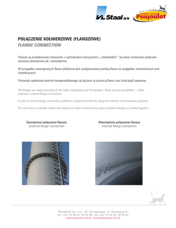 POŁĄCZENIE KOŁNIERZOWE (FLANSZOWE) FLANGE CONNECTION Flansze są produkowane stosownie z wyliczeniami statycznymi i „standardem”. Są dwie możliwości połączeń zarówno zewnętrzne jak i wewnętrzne. W przypadku wewnętrznych flansz platforma jest umiejscowiona poniżej flansz ze względów montażowych oraz inspekcyjnych. Przewody spalinowe komina dwupowłokowego są łączone za pomocą flansz oraz śrub bądź spawane. The flanges are made according to the static calculations and VL-standard. There are two possibilities – either external or internal flange connections. In case of internal flange connection a platform is placed beneath the flange for erection and inspection purposes. The inner liners of double walled steel stacks are either connected by means of bolted flanges or welded together. Zewnętrzne połączenie flanszy External flange connection Wewnętrzne połączenie flanszy Internal flange connection POUJOULAT Sp. z o.o. - 05-120 Legionowo - ul. Olszankowa 45 tel.: (22) 774 06 25, 767 97 66 - fax: (22) 774 45 50, 767 97 67 www.poujoulat.com.pl - [email protected] Zewnętrzne połączenie flanszy External flange connection Powłoka nośna Outer shell Połączenie z przewodem spalinowym Connection of the inner liner Połączenie kołnierza na powłoce nośnej Flange connection of the outer shell Nylonowa powierzchnia Nylon gliding surface Prowadnica Guidance Izolacja Insulation Wewnętrzne połączenie flanszy Internal flange connection Przewód spalinowy Inner liner Powłoka nośna Outer shell Połączenie z przewodem spalinowym Connection of the inner liner Połączenie kołnierza na powłoce nośnej Flange connection of the outer shell Platforma Platform Nylonowa powierzchnia Nylon gliding surface Prowadnica Guidance Izolacja Insulation Przewód spalinowy Inner liner POUJOULAT Sp. z o.o. - 05-120 Legionowo - ul. Olszankowa 45 tel.: (22) 774 06 25, 767 97 66 - fax: (22) 774 45 50, 767 97 67 www.poujoulat.com.pl - [email protected]