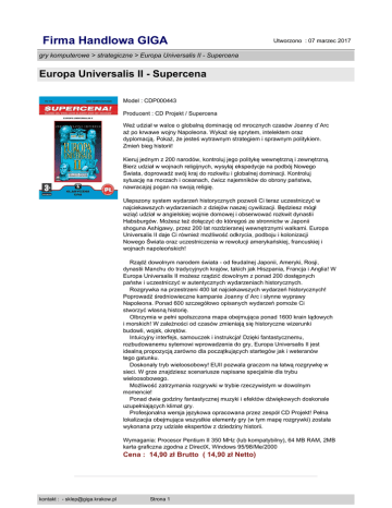 Firma Handlowa GIGA Utworzono : 07 marzec 2017 gry komputerowe > strategiczne > Europa Universalis II - Supercena Europa Universalis II - Supercena Model : CDP000443 Producent : CD Projekt / Supercena Weź udział w walce o globalną dominację od mrocznych czasów Joanny d`Arc aż po krwawe wojny Napoleona. Wykaż się sprytem, intelektem oraz dyplomacją. Pokaż, że jesteś wytrawnym strategiem i sprawnym politykiem. Zmień bieg historii! Kieruj jednym z 200 narodów, kontroluj jego politykę wewnętrzną i zewnętrzną. Bierz udział w wojnach religijnych, wysyłaj ekspedycje na podbój Nowego Świata, doprowadź swój kraj do rozkwitu i globalnej dominacji. Kontroluj sytuację na morzach i oceanach, ćwicz najemników do obrony państwa, nawracajaj pogan na swoją religię. Ulepszony system wydarzeń historycznych pozwoli Ci teraz uczestniczyć w najciekawszych wydarzeniach z dziejów naszej cywilizacji. Będziesz mógł wziąć udział w angielskiej wojnie domowej i obserwować rozkwit dynastii Habsburgów. Możesz też dołączyć do któregoś ze stronnictw w Japonii shoguna Ashigawy, przez 200 lat rozdzieranej wewnętrznymi walkami. Europa Universalis II daje Ci również możliwość odkrycia, podboju i kolonizacji Nowego Świata oraz uczestniczenia w rewolucji amerykańskiej, francuskiej i wojnach napoleońskich! Rządź dowolnym narodem świata - od feudalnej Japonii, Ameryki, Rosji, dynastii Manchu do tradycyjnych krajów, takich jak Hiszpania, Francja i Anglia! W Europa Universalis II możesz rządzić dowolnym z ponad 200 dostępnych państw i uczestniczyć w autentycznych wydarzeniach historycznych. Rozgrywka na przestrzeni 400 lat najciekawszych wydarzeń historycznych! Poprowadź średniowieczne kampanie Joanny d`Arc i słynne wyprawy Napoleona. Ponad 600 szczegółowo opisanych wydarzeń pomoże Ci stworzyć własną historię. Olbrzymia w pełni spolszczona mapa obejmująca ponad 1600 krain lądowych i morskich! W zależności od czasów zmieniają się historyczne wizerunki budowli, wojsk, okrętów. Intuicyjny interfejs, samouczek i instrukcja! Dzięki fantastycznemu, rozbudowanemu sytemowi wprowadzenia do gry, Europa Universalis II jest idealną propozycją zarówno dla początkujących startegów jak i weteranów tego gatunku. Doskonały tryb wieloosobowy! EUII pozwala graczom na łatwą rozgrywkę w sieci. W grze znajdziesz scenariusze napisane specjalnie dla trybu wieloosobowego. Możliwość zatrzymania rozgrywki w trybie rzeczywistym w dowolnym momencie! Ponad dwie godziny fantastycznej muzyki i efektów dźwiękowych doskonale uzupełniających klimat gry. Profesjonalna wersja językowa opracowana przez zespół CD Projekt! Pełna lokalizacjia obejmująca wszystkie elementy gry (w tym mapę rozgrywki) została wykonana przy udziale ekspertów z dziedziny historii. Wymagania: Procesor Pentium II 350 MHz (lub kompatybilny), 64 MB RAM, 2MB karta graficzna zgodna z DirectX, Windows 95/98/Me/2000 Cena : 14,90 zł Brutto ( 14,90 zł Netto) kontakt : - [email protected] Strona 1