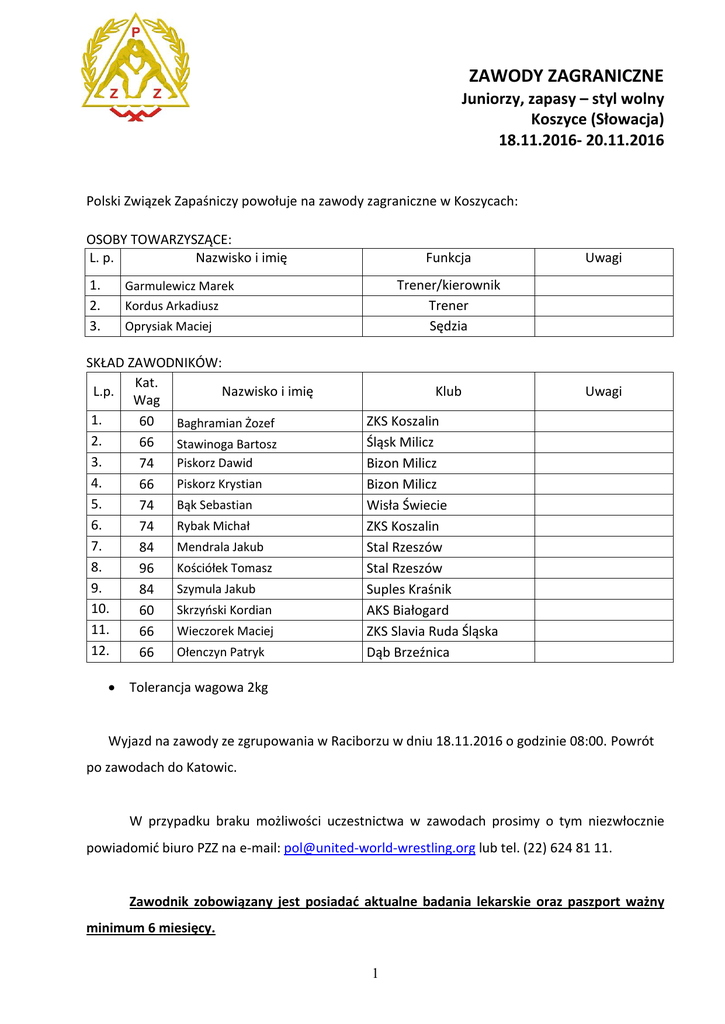 ZAWODY ZAGRANICZNE Juniorzy, zapasy – styl wolny Koszyce (Słowacja) 18.11.2016- 20.11.2016 Polski Związek Zapaśniczy powołuje na zawody zagraniczne w Koszycach: OSOBY TOWARZYSZĄCE: L. p. Nazwisko i imię 1. 2. 3. Funkcja Trener/kierownik Trener Sędzia Garmulewicz Marek Kordus Arkadiusz Oprysiak Maciej SKŁAD ZAWODNIKÓW: Kat. L.p. Nazwisko i imię Wag 1. 60 Baghramian Żozef 2. 66 Stawinoga Bartosz 3. Piskorz Dawid 74 4. Piskorz Krystian 66 5. Bąk Sebastian 74 6. Rybak Michał 74 7. Mendrala Jakub 84 8. Kościółek Tomasz 96 9. Szymula Jakub 84 10. Skrzyński Kordian 60 11. Wieczorek Maciej 66 12. Ołenczyn Patryk 66 Uwagi Klub Uwagi ZKS Koszalin Śląsk Milicz Bizon Milicz Bizon Milicz Wisła Świecie ZKS Koszalin Stal Rzeszów Stal Rzeszów Suples Kraśnik AKS Białogard ZKS Slavia Ruda Śląska Dąb Brzeźnica Tolerancja wagowa 2kg Wyjazd na zawody ze zgrupowania w Raciborzu w dniu 18.11.2016 o godzinie 08:00. Powrót po zawodach do Katowic. W przypadku braku możliwości uczestnictwa w zawodach prosimy o tym niezwłocznie powiadomić biuro PZZ na e-mail: [email protected] lub tel. (22) 624 81 11. Zawodnik zobowiązany jest posiadać aktualne badania lekarskie oraz paszport ważny minimum 6 miesięcy. 1 Przysługuje zwrot kosztów podróży (PKP II kl. posp. lub PKS) na podstawie załączonego biletu (bez kosztów diety i dojazdów) przesłanego zgodnie z obowiązującymi przepisami do biura PZZ w Warszawie w terminie nieprzekraczającym 14 dni od dnia zakończenia akcji. Wiza, przepisy wjazdowe Obywatele polscy korzystają z prawa do swobodnego przepływu osób w ramach Unii Europejskiej. Dokumentem podróży uprawniającym do bezwizowego wjazdu i pobytu (niezależnie od jego celu) na terytorium Republiki Słowackiej do 90 dni jest paszport bądź dowód osobisty. Przed wyjazdem należy się upewnić, czy dokument jest w wystarczająco dobrym stanie technicznym i pozwala na stwierdzenie tożsamości. Po wejściu Polski i Słowacji do obszaru Schengen zniesione zostały kontrole graniczne na polskosłowackich przejściach granicznych, jednak nie zwalnia to z obowiązku posiadania przy sobie podczas podróży na Słowację dokumentu tożsamości – paszportu lub dowodu osobistego. 2