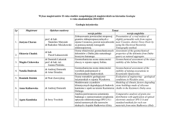 Wykaz magistrantów II roku studiów uzupełniających magisterskich na kierunku Geologia w roku akademickim 2014/2015 Geologia inżynierska Lp Magistrant 1. Justyna Charun 2. Oktawia Chudek Opiekun naukowy prof. dr hab. Stanisław Matysiak dr Radosław Mieszkowski dr hab. Paweł Łukaszewski 3. Magda Cichowska dr Dominik Łukasiak prof. dr hab. inż. Joanna Pinińska 4. Natalia Dmitruk dr Andrzej Domonik dr Artur Dziedzic 5. Dominik Dziełak dr Piotr Zawrzykraj 6. Anna Kalinowska dr Andrzej Domonik 7. Agata Kamińska dr Jerzy Trzciński Temat wersja polska Zobrazowanie powierzchni stropowej gruntów słaboprzepuszczalnych z rejonu Czosnowa, powiat nowodworski za pomocą metody tomografii elektrooporowej. Ocena właściwości geomechanicznych dolomitów z Dubia jako naturalnego kruszywa łamanego. Geomechaniczna ocena stateczności zboczy w rejonie zapory Solina. wersja angielska Presentation of a roof surface of slightly permeable soils from region near Czosnów, district Nowy Dwór by using the Electrical Resistivity Tomography method. Assessment of the geomechanical properties of the dolomite from Dubie quarry as natural aggregate. Geomechanical assessment of the slope stability of the Solina Dam. Geomechaniczna ocena stateczności wyrobisk podziemnych w Krzemionkach Opatowskich. Ocena warunków geologicznoinżynierskich w rejonie Wyszkowa. Modelowanie czynników klimatycznych degradujących budowle kamienne z opok na terenie Kazimierza Dolnego. Analiza porównawcza uziarnienia badanego z zastosowaniem urządzenia optyczno-elektronicznego IPS U/A i metod normowych dla surowców skalnych z kopalni Radkowice (Góry Geomechanical assessment of the stability of mining excavations in Krzemionki Opatowskie. Evaluation of engineering - geological conditions in Wyszków area. Modeling of climatic factors degrading stone buildings made of siliceous chalks in the Kazimierz Dolny area. Comparative analysis of grain-size distribution with application of optical electronic analyzer IPS U/A and standard methods for rock raw materials from mine Radkowice (Holy 8. Olga Karczewska 9. Martyna Kozak 10. Alicja Leszczyńska 11. Paweł Linka 12. Marcelina Malec 13. Rafał Mroczkiewicz 14. Monika Niemyjska 15. Filip Praczyk 16. Piotr Rybacki 17. Paweł Stajszczak Świętokrzyskie) używanych w budownictwie drogowym. Ocena warunków geologicznodr Ireneusz Gawriuczenkow inżynierskich okolic Grudziądza. dr hab. Właściwości geomechaniczne gabra z Paweł Łukaszewski Nowej Rudy-Słupca i ich wykorzystanie jako kruszywo łamane. Ocena warunków geologicznodr Ireneusz Gawriuczenkow inżynierskich okolic Chmielna /k Kartuz. Ocena warunków geologicznoinżynierskich w rejonie projektowanej dr Anna Bąkowska obwodnicy Pułtuska (okolice węzła "Moszyn"). Modelowanie czynników klimatycznych degradujących elementy dr Andrzej Domonik kamienne w Miejskim Ogrodzie Zoologicznym w Warszawie. Ocena warunków geologicznodr Anna Bąkowska inzynierskich w rejonie projektowanej drogi S17 (okolice węzła "Ząbki"). dr Dorota Izdebska-Mucha Wpływ struktury na pęcznienie iłów dr Emilia Wójcik neogeńskich. prof. dr hab. Ocena stanu technicznego wału Stanisław Matysiak przeciwpowodziowego rz. Wisły w dr Radosław Mieszkowski rejonie Otwocka. dr Dominik Łukasiak Geomechaniczna charakterystyka dr hab. procesu deterioracji piaskowców Paweł Łukaszewski gadulskich. Ocena warunków geologicznodr Piotr Zawrzykraj inżynierskich występujących w rejonie dr Dorota Izdebska-Mucha Miedniewic k/ Żyrardowa. Cross Mountains) used in road construction. Evaluation of engineering - geological conditions from Grudziądz area. Geomechanical properties of gabbro from Nowa Ruda-Słupiec and its use as natural aggregate. Evaluation of engineering- geological conditions from Chnielno area near Kartuzy. Evaluation of engineering - geological conditions in the area of the planned Pułtusk bypass (near "Moszyn" junction"). Modeling of climatic factors degrading historic stone elements in the City Zoological Garden in Warsaw. Evaluation of engineering - geological conditions in the area of the planned S17 road (near "Ząbki" junction). Influence of soil structure on swelling of Neogene clays. Evaluation of a technical condition of levees of Wisła river near Otwock. Geomechanical characterization of the deterioration process of the Godula sandstones. Evaluation of geological engineering conditions in the Miedniewice area near Żyrardów. 18. Izabela Szczepańska dr hab. Maciej Bąbel dr hab., prof. UW Paweł Dobak 19. Tomasz Szyszło dr Tomasz Szczepański 20. Bartosz Wierzbicki dr Tomasz Szczepański 21. Przemysław Wilczyński dr Andrzej Domonik 22. Martyna Woźniak dr Tomasz Szczepański 23. Jan Wysocki dr Radosław Mieszkowski dr hab. Jan Wierchowiec 24. Martyna Zdunek 25. Grzegorz Złotkowski dr Andrzej Domonik dr hab. Paweł Łukaszewski dr Dorota Izdebska-Mucha dr Emilia Wójcik Wykorzystanie modelowania 3D w geologiczno–inżynierskiej analizie przemieszczeń w strefie wietrzenia anhydrytów w kamieniołomie Piski (okolice Lwowa). Studium zmienności prędkości fali poprzecznej w zależności od stanu skonsolidowania wybranych gruntów. Wytrzymałość maksymalna i rezydualna gliny lodowcowej w rejonie skarpy ursynowskiej - zmienność i wpływ na stateczność zbocza. Analiza porównawcza struktur geometrycznych powierzchni pozniszczeniowych uzyskanych w trakcie badań geomechanicznych na przykładzie wybranych skał osadowych i magmowych. Geologiczno – inżynierskie warunki lokalizacji elektrowni wiatrowych na Pobrzeżu Kaszubskim. Rozpoznanie złoża siarczków cynku i ołowiu, na wybranym fragmencie terenu, w okolicach Siewierza (k/Zawiercia) metodą polaryzacji wzbudzonej. Analiza stateczności wybranego odsłonięcia skał węglanowych w Małopolskim Przełomie Wisły. Wpływ struktury na pęcznienie iłów warwowych. Application of 3D modeling in the engineering–geological analysis of the displacements in the weath