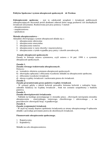 Polityka Społeczna i system ubezpieczeń społecznych dr Perdeus