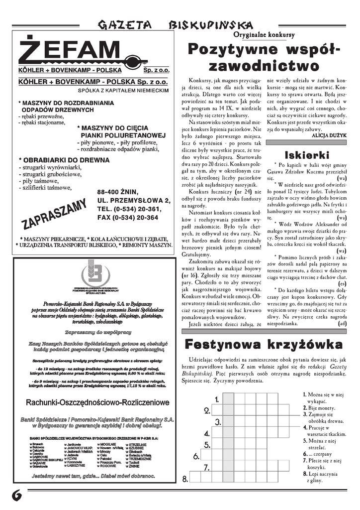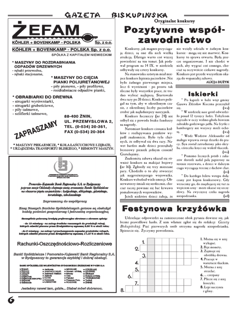 Oryginalne konkursy Pozytywne współ− zawodnictwo Konkursy, jak magnes przyciąga− ją dzieci, są one dla nich wielką atrakcją. Dlatego warto coś więcej powiedzieć na ten temat. Jak poda− wał program na 14 IX, w niedzielę odbywały się cztery konkursy. Na stanowisku szóstym miał mie− jsce konkurs lepienia paciorków. Nie było żadnego pierwszego miejsca, lecz 6 wyróżnień − po prostu tak śliczne były wszystkie prace, że tru− dno wybrać najlepszą. Startowało dwa razy po 20 dzieci. Konkurs pole− gał na tym, aby w określonym cza− sie, z określonej liczby paciorków zrobić jak najładniejszy naszyjnik. Konkurs łuczniczy (nr 24) nie odbył się z powodu braku funduszy na nagrody. Natomiast konkurs ciosania koł− ków i rozłupywania pieńków wy− padł znakomicie. Było tylu chęt− nych, że odbywał się dwa razy. Na− wet bardzo małe dzieci przerąbały brzozowy pieniek jednym ciosem! Gratulujemy. Znakomitą zabawą okazał się ró− wnież konkurs na makijaż bojowy (nr 16). Zgłosiły się trzy mieszane pary. Chodziło o to aby stworzyć jak najgroźniejszego wojownika. Konkurs wzbudzał wiele emocji. Ob− serwatorzy śmiali się serdecznie, cho− ciaż raczej powinni się bać krwawo pomalowanych wojowników. Jeżeli niektóre dzieci żałują, że nie wzięły udziału w żadnym kon− kursie − mogą się nie martwić. Kon− kursy to sprawa otwarta. Będą jesz− cze organizowane. I nie chodzi w nich, aby wygrać coś cennego, cho− ciaż są oczywiście ciekawe nagrody. Konkurs jest przede wszystkim oka− zją do wspaniałej zabawy. ALICJA DUŻYK Iskierki * Po kąpieli w balii wójt gminy Gąsawa Zdzisław Kuczma przeziębił się. (wa) * W niedzielę nasz gród odwiedzi− ło ponad 12 tysięcy ludzi. Tubylcom zajrzało w oczy widmo głodu bowiem zabrakło godziwego jadła. Na frytki i hamburgery nie wszyscy mieli ocho− tę. (wa) * Wódz Wodzów Aleksander od małego wprawia swoje dziatki do pra− cy. Syn został zatrudniony jako skry− ba, córeczka kręci się wokół tkaczek. (wa) * Pomimo licznych próśb i zaka− zów dorośli nadal palą papierosy na terenie rezerwatu, a dzieci w dalszym ciągu wyciągają trzcinę z dachów chat. (es) * Do każdego biletu wstępu dołą− czany jest kupon konkursowy. Gdy wrzucimy go, do znajdującej się tuż za wejściem urny − może okazać się szczę− śliwy. Na zwycięzcę czeka nagroda niespodzianka. (ad) Festynowa krzyżówka Udzielając odpowiedzi na zamieszczone obok pytania dowiesz się, jak brzmi prawidłowe hasło. Z nim właśnie zgłoś się do redakcji Gazety Biskupińskiej. Pięć pierwszych osób otrzyma nagrodę niespodziankę. Spieszcie się. Życzymy powodzenia. 1. Można się w niej wykąpać. 2. Bije monety. 3. Zajmuje się obróbką drewna. 4. Pracuje w warsztacie tkackim. 5. Można z niej strzelać. 6. ... czerpany 7. Plecie się z niej koszyki. 8. Lepi naczynia z gliny.