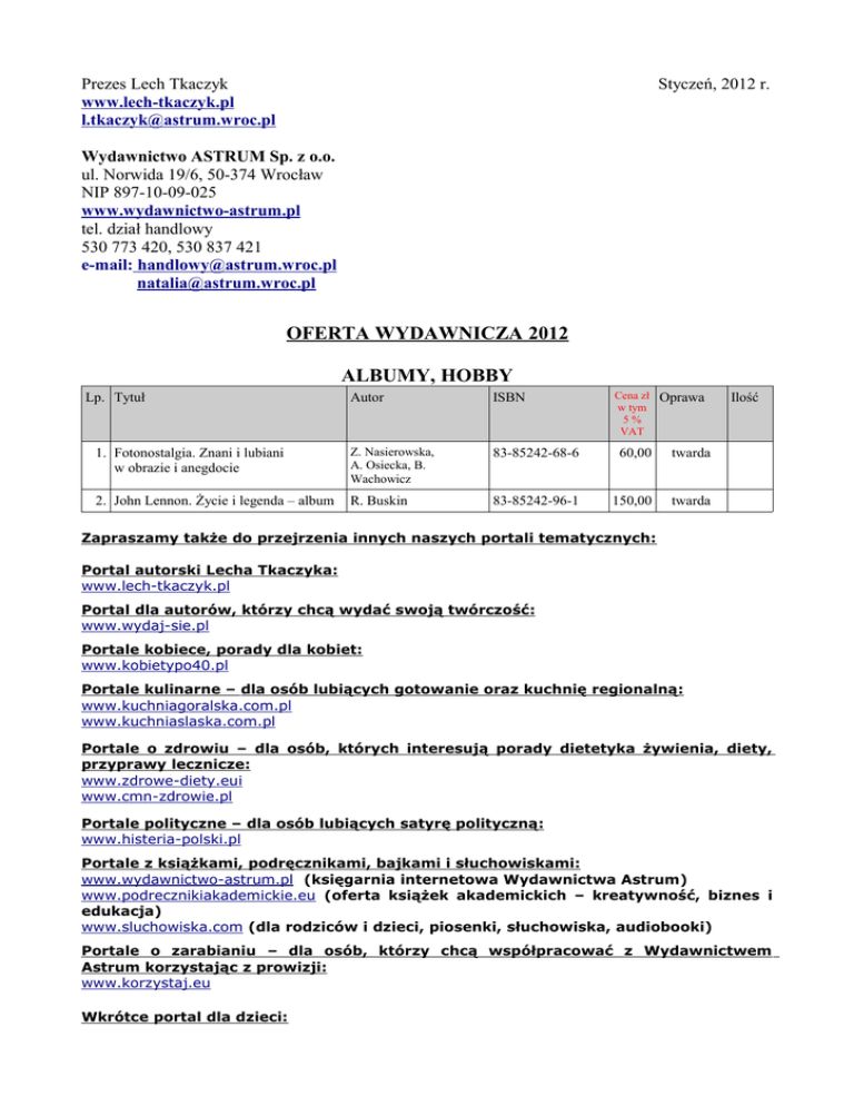 Prezes Lech Tkaczyk www.lech-tkaczyk.pl [email protected] Styczeń, 2012 r. Wydawnictwo ASTRUM Sp. z o.o. ul. Norwida 19/6, 50-374 Wrocław NIP 897-10-09-025 www.wydawnictwo-astrum.pl tel. dział handlowy 530 773 420, 530 837 421 e-mail: [email protected] [email protected] OFERTA WYDAWNICZA 2012 ALBUMY, HOBBY Lp. Tytuł Cena zł w tym 5% VAT Autor ISBN Oprawa 1. Fotonostalgia. Znani i lubiani w obrazie i anegdocie Z. Nasierowska, A. Osiecka, B. Wachowicz 83-85242-68-6 60,00 twarda 2. John Lennon. Życie i legenda – album R. Buskin 83-85242-96-1 150,00 twarda Ilość Zapraszamy także do przejrzenia innych naszych portali tematycznych: Portal autorski Lecha Tkaczyka: www.lech-tkaczyk.pl Portal dla autorów, którzy chcą wydać swoją twórczość: www.wydaj-sie.pl Portale kobiece, porady dla kobiet: www.kobietypo40.pl Portale kulinarne – dla osób lubiących gotowanie oraz kuchnię regionalną: www.kuchniagoralska.com.pl www.kuchniaslaska.com.pl Portale o zdrowiu – dla osób, których interesują porady dietetyka żywienia, diety, przyprawy lecznicze: www.zdrowe-diety.eui www.cmn-zdrowie.pl Portale polityczne – dla osób lubiących satyrę polityczną: www.histeria-polski.pl Portale z książkami, podręcznikami, bajkami i słuchowiskami: www.wydawnictwo-astrum.pl (księgarnia internetowa Wydawnictwa Astrum) www.podrecznikiakademickie.eu (oferta książek akademickich – kreatywność, biznes i edukacja) www.sluchowiska.com (dla rodziców i dzieci, piosenki, słuchowiska, audiobooki) Portale o zarabianiu – dla osób, którzy chcą współpracować z Wydawnictwem Astrum korzystając z prowizji: www.korzystaj.eu Wkrótce portal dla dzieci: www.alfabetbajka.pl Nasze produkty cyfrowe w postaci e-booków (PDF, EPUB) i audiobooków (MP3) są dostępne na platformach cyfrowych, współpracujących z Wydawnictwem Astrum: - Virtualo, - Nexto, - Zixo, - Gandalf, - ALEKSANDRIA Zapraszamy też do obejrzenia filmików, klipów reklamowych a także relacji z koncertów poezji śpiewanej, wykładów, spotkań autorskich z dziećmi, akcji prowadzonych przez Wydawnictwo Astrum: www.astrum.wroc.pl/filmiki.php