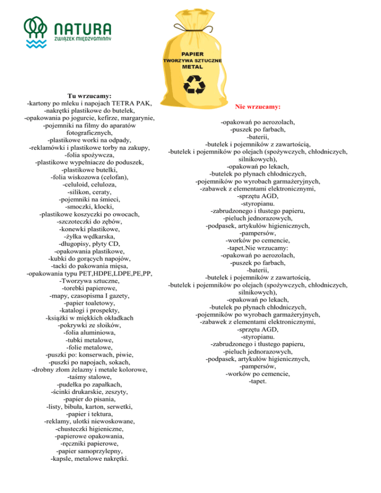 Tu wrzucamy: -kartony po mleku i napojach TETRA PAK, -nakrętki plastikowe do butelek, -opakowania po jogurcie, kefirze, margarynie, -pojemniki na filmy do aparatów fotograficznych, -plastikowe worki na odpady, -reklamówki i plastikowe torby na zakupy, -folia spożywcza, -plastikowe wypełniacze do poduszek, -plastikowe butelki, -folia wiskozowa (celofan), -celuloid, celuloza, -silikon, ceraty, -pojemniki na śmieci, -smoczki, klocki, -plastikowe koszyczki po owocach, -szczoteczki do zębów, -konewki plastikowe, -żyłka wędkarska, -długopisy, płyty CD, -opakowania plastikowe, -kubki do gorących napojów, -tacki do pakowania mięsa, -opakowania typu PET,HDPE,LDPE,PE,PP, -Tworzywa sztuczne, -torebki papierowe, -mapy, czasopisma I gazety, -papier toaletowy, -katalogi i prospekty, -książki w miękkich okładkach -pokrywki ze słoików, -folia aluminiowa, -tubki metalowe, -folie metalowe, -puszki po: konserwach, piwie, -puszki po napojach, sokach, -drobny złom żelazny i metale kolorowe, -taśmy stalowe, -pudełka po zapałkach, -ścinki drukarskie, zeszyty, -papier do pisania, -listy, bibuła, karton, serwetki, -papier i tektura, -reklamy, ulotki niewoskowane, -chusteczki higieniczne, -papierowe opakowania, -ręczniki papierowe, -papier samoprzylepny, -kapsle, metalowe nakrętki. Nie wrzucamy: -opakowań po aerozolach, -puszek po farbach, -baterii, -butelek i pojemników z zawartością, -butelek i pojemników po olejach (spożywczych, chłodniczych, silnikowych), -opakowań po lekach, -butelek po płynach chłodniczych, -pojemników po wyrobach garmażeryjnych, -zabawek z elementami elektronicznymi, -sprzętu AGD, -styropianu. -zabrudzonego i tłustego papieru, -pieluch jednorazowych, -podpasek, artykułów higienicznych, -pampersów, -worków po cemencie, -tapet.Nie wrzucamy: -opakowań po aerozolach, -puszek po farbach, -baterii, -butelek i pojemników z zawartością, -butelek i pojemników po olejach (spożywczych, chłodniczych, silnikowych), -opakowań po lekach, -butelek po płynach chłodniczych, -pojemników po wyrobach garmażeryjnych, -zabawek z elementami elektronicznymi, -sprzętu AGD, -styropianu. -zabrudzonego i tłustego papieru, -pieluch jednorazowych, -podpasek, artykułów higienicznych, -pampersów, -worków po cemencie, -tapet.