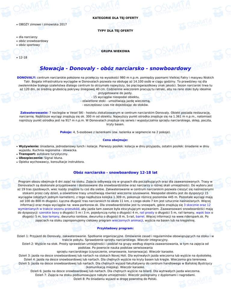 KATEGORIE DLA TEJ OFERTY ● OBOZY zimowe i zimowiska 2017 TYPY DLA TEJ OFERTY ● ● ● dla narciarzy obóz snowboardowy obóz sportowy GRUPA WIEKOWA ● 12-18 Słowacja - Donovaly - obóz narciarsko - snowboardowy DONOVALY: centrum narciarskie położone na przełęczy na wysokości 980 m n.p.m. pomiędzy pasmami Vielkiej Fatry i masywu Niskich Tatr. Bogata infrastruktura wyciągów w Donovalach pozwala na obsługę aż 14.100 osób w ciągu godziny. To prawdziwy raj dla zwolenników białego szaleństwa dlatego centrum to otrzymało najwyższy, bo pięciogwiazdkowy znak jakości. Sezon narciarski trwa tu aż 120 dni, ze średnią grubością pokrywy śniegowej 40 cm. Codziennie wieczorem pracują tu ratraki, aby na rano stoki były idealnie przygotowane do jazdy. - 15 wyciągów nieopodal obiektu, - oświetlone stoki - umożliwiają jazdę wieczorną, - oszczędzasz czas nie dojeżdżając do stoków. Zakwaterowanie: 7 noclegów w Vesel SKI - hostelu zlokalizowanym w centrum narciarskim Donovaly. Obiekt posiada restaurację, narciarnię. Najbliższe wyciągi znajdują się ok. 300 m od obiektu. Najwyższy punkt ośrodka znajduje się na 1.361 m n.p.m., natomiast najniższy punkt ośrodka jest na 917 m n.p.m. W Donovalach znajduje się serwis i wypożyczalnia sprzętu narciarskiego, sklep, poczta, kryty basen. Pokoje: 4, 5-osobowe z łazienkami (ew. łazienka w segmencie na 2 pokoje). Cena obejmuje: ● ● ● ● Wyżywienie: śniadania, jednodaniowy lunch i kolacje. Pierwszy posiłek: kolacja w dniu przyjazdu, ostatni posiłek: śniadanie w dniu wyjazdu. Kuchnia regionalna - słowacka. Transport: autokare turystyczny. Ubezpieczenie: Signal Iduna. Opieka wychowawcy, konsultacje instruktora. Obóz narciarsko - snowboardowy 12-18 lat Program obozu obejmuje 6 dni zajęć na stoku. Zajęcia odbywają się w grupach dla początkujących oraz dla zaawansowanych. Trasy w Donovalach są doskonale przygotowane i dostosowane dla snowboardzistów oraz narciarzy o różnej skali umiejętności. Do wyboru jest aż 19 tras zjazdowych, wiec każdy znajdzie tu coś dla siebie. Zakwaterowanie w centrum narciarskim pozwala cieszyć się naśnieżanymi stokami przez cały dzień, a oświetlone trasy umożliwiają również wieczorne szusowanie. Nieopodal obiektu jest do dyspozycji 15 wyciągów (objętych jednym karnetem), z tego najdłuższa kolejka 1.309 m, pokonuje różnicę poziomów 445 m. Pozostałe wyciągi mają od 100 do 800 m długości. Łączna długość tras narciarskich to około 11 km, z czego około 7 km jest sztucznie naśnieżanych. Więcej informacji oraz mapa wyciągów na: www.parksnow.sk. Dla snowboardzistów jest tu snowpark, gdzie znajdują się 3 skocznie oraz 12 wymienianych w trakcie sezonu przeszkód, aby jazda tam zawsze była ekscytującym wyzwaniem. Zaawansowani snowboardziści mają do dyspozycji: szerokie boxy o długości 5 m i 3 m, pojedynczą rurkę o długości 4 m, rail prosty o długości 5 m, rail łamany, wąski box o długości 5 m, box łamany, dwururka rainbow, dwururka o długości 8 m, S-rail, barrel. Więcej informacji na www.riderspark.sk. Po zajęciach na stoku zaproponujemy ciekawy program wieczornych animacji, wyjścia na basen lub na kręgielnię. Przykładowy program: Dzień 1: Przyjazd do Donovaly, zakwaterowanie. Spotkanie organizacyjne. Omówienie zasad i regulaminów obowiązujących na stoku i w trakcie pobytu. Sprawdzenie sprzętu narciarskiego. Wieczór integracyjny. Dzień 2: Wyjście na stok. Prosty sprawdzian umiejętności i podział na grupy według stopnia zaawansowania, w tym na zajęcia od podstaw. Po powrocie nauka podstaw serwisowania sprzętu narciarskiego (czyszczenie, smarowanie, konserwacja). Wieczór karaoke. Dzień 3: Jazda na desce snowboardowej lub nartach na stokach Novej Holi. Dla wytrwałych jazda wieczorna lub wyjście na dyskotekę. Dzień 4: Jazda na desce snowboardowej lub nartach. Dla chętnych wyjście na kryty basen lub kręgle. Wieczorna gra terenowa. Dzień 5: Jazda na desce snowboardowej lub nartach. Dla chętnych wyjazd fakultatywny do centrum handlowego w Bańskiej Bystrzycy (komunikacją miejską). Wieczór karaoke. Dzień 6: Jazda na desce snowboardowej lub nartach. Dla chętnych wyjście na bilard. Dla wytrwałych jazda wieczorna. Dzień 7: Zajęcia na stoku podsumowujące nabyte umiejętności. Wieczór pożegnalny z dyplomami i nagrodami. Dzień 8: Po śniadaniu wyjazd w drogę powrotną do Polski. Program fakultatywny: ● ● ● ● ● wyjście na basen - ok. 8 EUR, kręgielnia - ok. 10 EUR, wyjazd do Bańskiej Bystrzycy (komunikacja miejska) - ok. 8 EUR, dyskoteka - 5 EUR, wyjazd na baseny termalne - ok. 30 EUR (przy odpowiedniej liczbie chętnych). Informacje praktyczne: Każdy uczestnik musi obowiązkowo posiadać i używać kask ochronny. Należy zabrać paszport lub dowód osobisty. Przy zakwaterowaniu pobierana jest kaucja 15 EUR, która jest zwracana w dniu wyjazdu, o ile nie zostaną wyrządzone szkody. Cena karnetu 6-dniowego: ok. 90 EUR (do lat 18) + kaucja za skipass ok. 3 EUR. Powyżej 18 lat ok. 135 EUR. Rekomendujemy wyrobienie Europejskiej Karty Zdrowia. Prosimy o podpisanie bagażu oraz sprzętu narciarskiego. Obowiązują warunki uczestnictwa organizatora Cena nie obejmuje: ● ● dopłat za transport z miast podanych w planie podróży. Wypożyczenie sprzętu narciarskiego lub snowboardowego: ok. 80 EUR (6 dni). Ciepły posiłek na stoku: 5-8 EUR. Możliwe terminy wyjazdu Lp. Data początku Data końca Cena Wolne miejsca 1. 14-01-2017 21-01-2017 1399 zł termin jest niedostępny 2. 21-01-2017 28-01-2017 1399 zł termin jest niedostępny 3. 28-01-2017 04-02-2017 1399 zł termin jest niedostępny 4. 04-02-2017 11-02-2017 1399 zł termin jest niedostępny 5. 11-02-2017 18-02-2017 1399 zł termin jest niedostępny 6. 18-02-2017 25-02-2017 1399 zł termin jest niedostępny Możliwe miejsca wyjazdu Lp. Miasto Adres 1. Katowice ul. Piotra Skargi 4, Dworzec Autobusowy, stanowiska 1-4 (ob