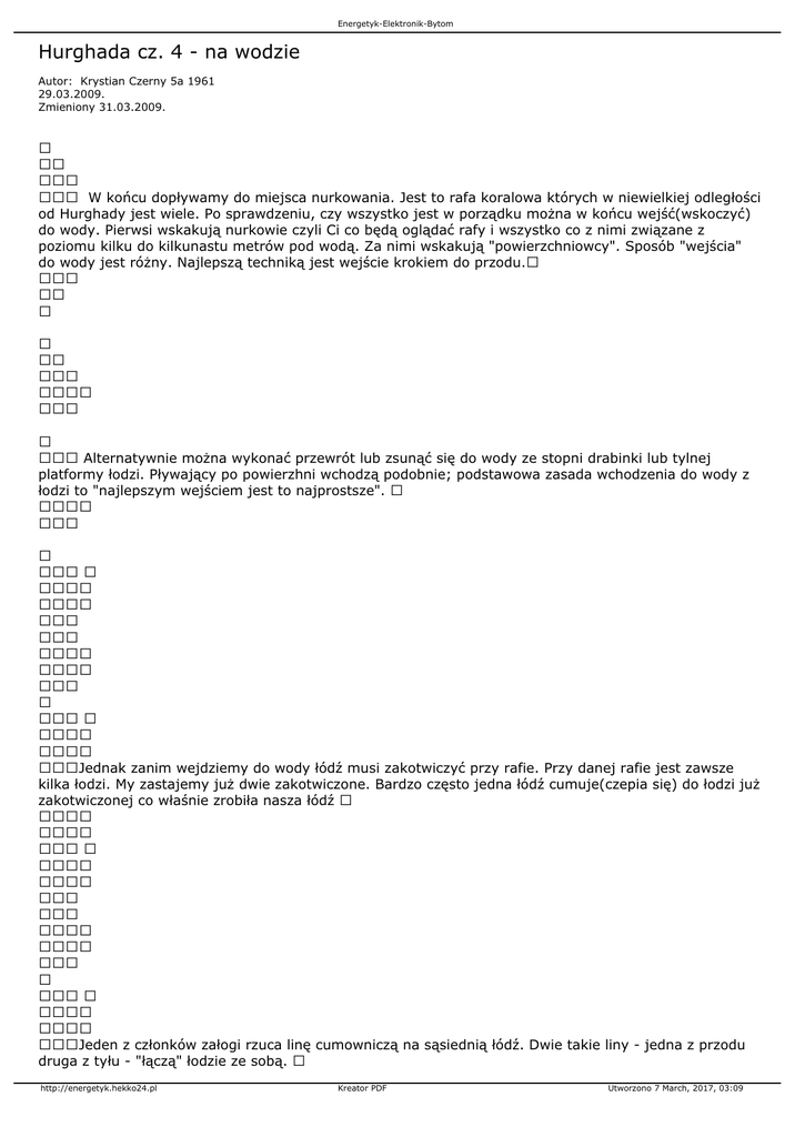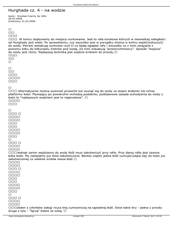 Energetyk-Elektronik-Bytom Hurghada cz. 4 - na wodzie Autor: Krystian Czerny 5a 1961 29.03.2009. Zmieniony 31.03.2009. W końcu dopływamy do miejsca nurkowania. Jest to rafa koralowa których w niewielkiej odległości od Hurghady jest wiele. Po sprawdzeniu, czy wszystko jest w porządku można w końcu wejść(wskoczyć) do wody. Pierwsi wskakują nurkowie czyli Ci co będą oglądać rafy i wszystko co z nimi związane z poziomu kilku do kilkunastu metrów pod wodą. Za nimi wskakują "powierzchniowcy". Sposób "wejścia" do wody jest różny. Najlepszą techniką jest wejście krokiem do przodu. Alternatywnie można wykonać przewrót lub zsunąć się do wody ze stopni drabinki lub tylnej platformy łodzi. Pływający po powierzhni wchodzą podobnie; podstawowa zasada wchodzenia do wody z łodzi to "najlepszym wejściem jest to najprostsze". Jednak zanim wejdziemy do wody łódź musi zakotwiczyć przy rafie. Przy danej rafie jest zawsze kilka łodzi. My zastajemy już dwie zakotwiczone. Bardzo często jedna łódź cumuje(czepia się) do łodzi już zakotwiczonej co właśnie zrobiła nasza łódź Jeden z członków załogi rzuca linę cumowniczą na sąsiednią łódź. Dwie takie liny - jedna z przodu druga z tyłu - "łączą" łodzie ze sobą. http://energetyk.hekko24.pl Kreator PDF Utworzono 7 March, 2017, 03:09 Energetyk-Elektronik-Bytom A tak wygląda miejsce nurkowania. Na pierwszym planie mamy spokojną wodę przed rafą, głębokość w tym miejscu to 8 - 12 metrów(niebieska woda). Na drugim planie właściwa rafa. Rafa to po prostu korale wyrastające na wysokość tuż pod powierzchnią wody(zielonkawo-brązowy kolor). Daleko za rafą otwarte morze(granatowy kolor). Tak wygląda miejsce styku otwartego morza z rafą. Widzimy tutaj fale rozbijające się o rafę. Łódzie zawsze kotwiczą od strony zawietrznej dziobem skierowanym w kierunku wiatru. W ten sposób łódź jest zawsze pchana wiatrem od rafy a lina cumownicza jest lekko naprężona i w ten sposób łódź pewnie stoi na swoim miejscu... Woda w tym miejscu jest spokojna i można swobodnie wejść do wody popływać i nurkować. http://energetyk.hekko24.pl Kreator PDF Utworzono 7 March, 2017, 03:09 Energetyk-Elektronik-Bytom A tak wygląda fragment rafy widziany z łodzi. Wejście do wody... krokiem do przodu! Ci którzy już są w wodzie czekają na pozostałych z grupy nurkujących Teraz kolej na pływających po powierzchni z maską i fajką! http://energetyk.hekko24.pl Kreator PDF Utworzono 7 March, 2017, 03:09 Energetyk-Elektronik-Bytom Już w komplecie? No to można popłynąć w kierunku rafy, która jest w odległości kilkunastu metrów! Pływanie po powierzchni i obserwowanie tego co pod nami. A jest co oglądać!! Po wyjściu z wody trzeba podzielić się wrażeniami; co kto widział, jak przebiegło nurkowanie, jakie zwierzątka się spotkało itd Nie nurkujący zawsze z ciekawością słuchają opowiadań nurkujących. http://energetyk.hekko24.pl Kreator PDF Utworzono 7 March, 2017, 03:09 Energetyk-Elektronik-Bytom Po zdjęciu sprzętu i ubiorów(skafandrów) czas na ... posiłek. Wszyscy sobie świetnie radzą i z ochotą konsumują potrawy przygotowane przez pokładowego kucharza. Każda łódź ma swój specyficzny - odmienny - zestaw potraw. Można sobie nakładać dowolne i bez ograniczeń ilościowych potrawy z "szwedzkiego"(tutaj egipskiego) stołu. Potrawy nie tylko apetycznie wyglądają, ale też są naprawdę bardzo smaczne. Ja podchodziłem do stołu ... trzy razy(o boże!) Po powrocie muszę się koniecznie zważyć! Po posiłku i odpoczynku płynie się na kolejne miejsce(rafę) i cała procedura powtarza się od nowa. Z jednym wyjątkiem; nie ma już posiłku. Natomiast można się napić herbaty, kawy, coca-coli lub wody mineralnej. Posiłek i wymienione napoje płacimy osobno załodze. Kosztuje to razem 30 EF(egipskich funtów). 1 Euro = 7,50 EF. Czyli taki posiłek plus napoje kosztuje 4 Euro. Dużo? Przeliczcie!! http://energetyk.hekko24.pl Kreator PDF Utworzono 7 March, 2017, 03:09 Energetyk-Elektronik-Bytom Wraca się do bazy o godz. 16:00 - 16:30. Czas zarzucić linę cumowniczą! Po wypłukaniu sprzętu w słodkiej wodzie(koniecznie!!) i zdaniu go do w magazynu powraca się do domu(hotelu) Niejedna z tych osób powróci tu jutro, aby znowu wypłynąć łodzią po kolejną przygodę! a wielu z nich przyjedzie tutaj poraz kolejny. Bo można się "zarazić" nurkowaniem i stanie się to pasją, z której trudno się potem wycofać. Więcej zdjęć w galerii TUTAJ cdn Krystian Czerny 5a 1961 http://energetyk.hekko24.pl Kreator PDF Utworzono 7 March, 2017, 03:09