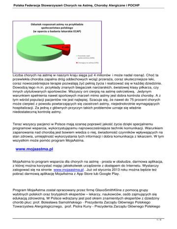 Polska Federacja Stowarzyszeń Chorych na Astmę, Choroby Alergiczne i POCHP Liczba chorych na astmę w naszym kraju sięga już 4 milionów i może nadal rosnąć. Choć ta przewlekła choroba zapalna dróg oddechowych wciąż przeraża, coraz skuteczniejsze leki, coraz nowocześniejsze terapie pozwalają żyć pełnią życia i realizować się w każdej dziedzinie. Dowodzą tego m.in. przykłady znanych biegaczek narciarskich, światowej klasy piłkarza, czy innych utytułowanych sportowców. Wszyscy oni cierpią na astmę oskrzelową. Jedynym warunkiem spełnienia nawet sportowych marzeń mimo astmy jest dobra kontrola choroby. A z tym wśród populacji pacjentów nie jest najlepiej. Szacuje się, że nawet do 75 procent chorych może cierpieć z powodu powtarzających się zaostrzeń astmy, niejednokrotnie wymagających hospitalizacji. Za jedną z głównych przyczyn takich problemów uznaje się właśnie niedostateczną kontrolę astmy. Teraz wszyscy pacjenci w Polsce mają szansę poprawić jakość życia dzięki specjalnemu programowi wsparcia, wykorzystującemu najnowocześniejsze techniki komunikacji. Warunkiem zapanowania nad chorobą jest bowiem wiedza o niej, świadomość czynników wpływających na stan zdrowia, umiejętność wykorzystania tych informacji i dobra komunikacja z lekarzem. W tym wszystkim może pomóc program MojaAstma. www.mojaastma.pl MojaAstma to program wsparcia dla chorych na astmę - prosta w obsłudze, darmowa aplikacja, z której można korzystać mając jakiekolwiek urządzenie z dostępem do Internetu. Wystarczy zalogować się na stronie www.mojaastma.pl . Już od stycznia 2013 roku można będzie też pobrać darmową aplikację MojaAstma z App Store lub Google Play. Program MojaAstma został opracowany przez firmę GlaxoSmithKline z pomocą grupy wybitnych polskich oraz brytyjskich ekspertów – lekarzy, naukowców, osób zajmujących się edukacją zdrowotną. W Polsce wdrażany jest pod okiem znamienitych ekspertów z dziedziny chorób płuc: prof. Bolesława Samolińskiego - Prezydenta Zarządu Głównego Polskiego Towarzystwa Alergologicznego, prof. Piotra Kuny - Prezydenta Zarządu Głównego Polskiego 1/4 Polska Federacja Stowarzyszeń Chorych na Astmę, Choroby Alergiczne i POCHP Towarzystwa Alergologicznego w latach 2006-2009 oraz dr Piotra Dąbrowieckiego Przewodniczącego Polskiej Federacji Stowarzyszeń Chorych na Astmę, Alergię i POChP. Program jest przeznaczony dla wszystkich chorych na astmę, którzy ukończyli 12 lat. Informacja zawsze i wszędzie Stały i szybki dostęp do wiedzy o astmie dla każdej osoby cierpiącej na tę chorobę jest bezcenny. Informacja daje władzę – także nad chorobą. W ciągłym pośpiechu nie mamy czasu na studiowanie broszur i naukowych publikacji. Potrzebnych nam wiadomości szukamy dziś najczęściej w Internecie, lecz „Doktor Google” czasem bardziej szkodzi niż pomaga. Tymczasem program MojaAstma zapewnia błyskawiczny dostęp przez Internet do informacji przydatnych w codziennym życiu, ale też rzetelnych, przygotowanych przez specjalistów. Dzięki takiej wiedzy nie tylko łatwiej dbać o siebie, zapobiegać sytuacjom, które mogą zaostrzyć objawy astmy, ale też lepiej je interpretować i reagować odpowiednio do skali problemu. Pod adresem www.mojaastma.pl każdy znajdzie informacje pomagające lepiej rozumieć chorobę i przyczyny nasilania się jej objawów, wskazówki ułatwiające samokontrolę astmy, a nawet lokalne (dla wielu różnych miast w Polsce) informacje o pogodzie, pyleniu roślin i zanieczyszczeniu powietrza, czyli czynnikach mogących zaostrzać jej przebieg. Program „MojaAstma” zawiera wiele przydatnych funkcji, zapewnia także interaktywność. Na przykład dzięki odpowiedzi na kilka sprofilowanych pytań dotyczących przestrzegania zaleceń lekarskich, pacjent może bezpośrednio na swój adres e-mail lub na telefon komórkowy otrzymać porady dobrane indywidualnie do jego potrzeb. Test Kontroli Astmy 2/4 Polska Federacja Stowarzyszeń Chorych na Astmę, Choroby Alergiczne i POCHP Jedną z istotniejszych funkcji on-line programu jest Test Kontroli Astmy (ACT), oceniający m.in. nasilenie objawów i pozwalający na bieżąco monitorować poziom kontroli choroby. Pacjent, logując się na stronie www programu lub korzystając z aplikacji mobilnej, odpowiada w teście na pięć pytań odzwierciedlających najczęstsze problemy – duszność, dolegliwości nocne, spadek wydolności fizycznej i konieczność sięgania po leki działające doraźnie. Swoje samopoczucie pacjent ocenia w skali od 1 do 5, a suma punktów daje obraz ogólnej kondycji. Im mniej punktów, tym gorzej. Takiej samooceny każdy pacjent powinien dokonać przynajmniej raz w miesiącu. Dzięki programowi MojaAstma nikt nie musi już prowadzić papierowego dzienniczka objawów – co zresztą i tak niewielu robi. Wystarczy z programu wydrukować gotowe raporty (wykorzystujące zanotowane przez chorego obserwacje), a potem przekazać je lekarzowi podczas wizyty w gabinecie. Jeśli między wizytami suma punktów z testu kontroli astmy okaże się niska, pacjent otrzymuje sygnał, iż powinien wcześniej odwiedzić lekarza. Co więcej, zarówno wyniki testu z ostatnich trzech miesięcy, jak i wykres samopoczucia z kilku tygodni obserwacji pacjent może w każdym momencie przesłać lekarzowi w wersji elektronicznej pod wskazany adres e-mailowy, umożliwiając mu szybszą reakcję na pojawiające się problemy. Bilans zysków Program MojaAstma to: - wiedza, 3/4 Polska Federacja Stowarzyszeń Chorych na Astmę, Choroby Alergiczne i POCHP - wskazówki ułatwiające samoopiekę i codzienne życie z astmą, - samokontrola i aktywne uczestnictwo w procesie leczenia, - możliwość regularnego informowania lekarza o samopoczuciu, z każdego miejsca i o każdej porze, czyli: większa odpowiedzialność za własne zdrowie. Jeśli ktoś sam zatroszczy się o siebie – a dzięki programowi MojaAstm