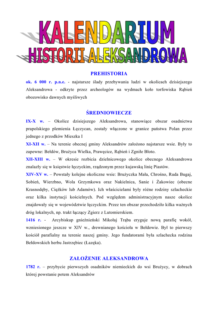 PREHISTORIA ok. 6 000 r. p.n.e. - najstarsze ślady przebywania ludzi w okolicach dzisiejszego Aleksandrowa - odkryte przez archeologów na wydmach koło torfowiska Rąbień obozowisko dawnych myśliwych ŚREDNIOWIECZE IX-X w. – Okolice dzisiejszego Aleksandrowa, stanowiące obszar osadnictwa prapolskiego plemienia Łęczycan, zostały włączone w granice państwa Polan przez jednego z przodków Mieszka I XI-XII w. – Na terenie obecnej gminy Aleksandrów założono najstarsze wsie. Były to zapewne: Bełdów, Brużyca Wielka, Prawęcice, Rąbień i Zgniłe Błoto. XII-XIII w. – W okresie rozbicia dzielnicowego okolice obecnego Aleksandrowa znalazły się w księstwie łęczyckim, rządzonym przez kujawską linię Piastów. XIV-XV w. – Powstały kolejne okoliczne wsie: Brużyczka Mała, Chrośno, Ruda Bugaj, Sobień, Wierzbno, Wola Grzymkowa oraz Nakielnica, Sanie i Żakowiec (obecne Krasnodęby, Ciężków lub Adamów). Ich właścicielami były różne rodziny szlacheckie oraz kilka instytucji kościelnych. Pod względem administracyjnym nasze okolice znajdowały się w województwie łęczyckim. Przez ten obszar przechodziło kilka ważnych dróg lokalnych, np. trakt łączący Zgierz z Lutomierskiem. 1416 r. - Arcybiskup gnieźnieński Mikołaj Trąba eryguje nową parafię wokół, wzniesionego jeszcze w XIV w., drewnianego kościoła w Bełdowie. Był to pierwszy kościół parafialny na terenie naszej gminy. Jego fundatorami była szlachecka rodzina Bełdowskich herbu Jastrzębiec (Łazęka). ZAŁOŻENIE ALEKSANDROWA 1782 r. – przybycie pierwszych osadników niemieckich do wsi Brużycy, w dobrach której powstanie potem Aleksandrów ok. 1816 r. – właściciel dóbr brużyckich – polski szlachcic Rafał Bratoszewski - założył nową osadę miejską na południe od tej wsi, na nieurodzajnym, zalesionym piaszczystym wzgórzu – jest to przyszły Aleksandrów; wytyczono wtedy prostokątny Rynek i kilka prostopadłych ulic 1816-1818 r. – Bratoszewski ufundował kościół parafialny św. Rafała 22 III 1822 r. – nowa osada otrzymała prawa miejskie i nazwę Aleksandrów ku czci ówczesnego cara Rosji i króla Polski zarazem – Aleksandra I oraz herb utworzony od jego inicjału OKRES ŚWIETNOŚCI 1822 r. - w Aleksandrowie było już 3086 mieszkańców, czyli ponad trzy razy tyle, co w ówczesnej Łodzi; pierwsi mieszkańcy miasta to głównie rzemieślnicy – tkacze, produkujący w przydomowych warsztatach sukno wełniane; byli oni w większości narodowości niemieckiej i wyznania ewangelickiego (luterańskiego), oprócz nich w Aleksandrowie osiedlali się też Polacy wyznania katolickiego i Żydzi wyznający religię mojżeszową 1824 r. – powstał budynek Ratusza przeznaczony dla władz miasta, czyli Magistratu, oraz park – ogród angielski 6 XII 1824 r. - zmarł założyciel Aleksandrowa – Rafał Bratoszewski i nowe miasteczko przeszło na własność rodziny Kossowskich V 1825 r. – miasto wizytował car Aleksander I 1825 lub 1829 r. – zbudowano Jatki Miejskie – ciąg sklepików piekarskich i rzeźniczych przylegający do Ratusza 1828 r. – powstał drugi aleksandrowski kościół – ewangelicki, dla aleksandrowian tego wyznania 1830-1831 r. – mieszkańcy miasta, z burmistrzem Gedeonem Goedelem na czele, poparli powstanie listopadowe, m.in. tkając bandaże i mundury dla armii powstańczej 1845 r. - Aleksandrów osiągnął największą w tym okresie liczbę mieszkańców – 4605; odtąd miasteczko zaczęło gospodarczo podupadać i wyludniać się OKRES UPADKU I PONOWNEGO ROZWOJU 1863-1864 r. - powstanie styczniowe 1863-1864 r. – w walkach powstańczych uczestniczyło kilku aleksandrowian, a oddziały powstańcze wkraczały do miasteczka 1869 r. – podupadły gospodarczo Aleksandrów utracił prawa miejskie ukazem władz rosyjskich 1858-1860 r. – wytyczenie szosy do Łodzi 1888 r. – założenie pierwszej mechanicznej fabryki pończoch, której właścicielem był niemiecki fabrykant Juliusz Paschke; była to pierwsza z wielu podobnych fabryk powstałych w tym okresie w Aleksandrowie 1903 r. – utworzenie Ochotniczej Straży Pożarnej 1907 r. – powstanie Towarzystwa Śpiewaczego „Lutnia” - pierwszej polskiej organizacji społecznej w mieście 1910 r. – otwarcie linii tramwajowej do Łodzi, noszącej po ostatniej wojnie numer 44 1914-1918 r. – w czasie I wojny światowej miasto zajmują wojska niemieckie 1915 r. – założenie szpitala w Aleksandrowie, który funkcjonował do 1933 r. 1916 r. – otwarcie przez okupacyjne władze niemieckie pierwszej elektrowni w Aleksandrowie, początki elektryfikacji miasta 1917 r. – aleksandrowscy Polacy angażują się w działalność patriotyczną, m.in. stawiają pomnik Tadeusza Kościuszki w Rynku i walczą w Legionach OKRES MIĘDZYWOJENNY 1921 r. – Aleksandrów liczy 8236 mieszkańców, w tym 37% Niemców, 34 % Polaków i 29 % Żydów, dla których jest ważnym ośrodkiem religijnym – siedzibą sławnych rabinów chasydzkich – cadyków z dynastii Danziger 1924 r. – ponownie uprzemysłowiony Aleksandrów odzyskał prawa miejskie; bywa odtąd określany jako Łódzki, a nie, jak dawniej - Łęczycki lub Fabryczny 1927 r. – otwarcie nowej szkoły dla dzieci polskich przy ulicy Bankowej - obecnie Sportowa Szkoła Podstawowa nr 3 1928 r. – budowa remizy straży pożarnej przy ulicy Lutomierskiej - obecnie 11 Listopada 1939 r. – w chwili wybuchu II wojny światowej Aleksandrów liczył już 13 424 mieszkańców II WOJNA ŚWIATOWA 7 IX 1939 r. – do Aleksandrowa wkroczyły pierwsze oddziały niemieckie 14 IX 1939 r. - okupanci rozstrzelali na cmentarzu żydowskim 5 Polaków aleksandrowskich i 26 Żydów 9 XI 1939 r. - Aleksandrów wraz z Łodzią znalazł się na terenach wcielonych do Rzeszy; wprowadzono niemieckie nazwy ulic i placów 27 XII 1939 r. - przymusowo wysiedlono do Generalnej Guberni wszystkich aleksandrowskich Żydów, gdzie parę lat później prawie wszyscy z