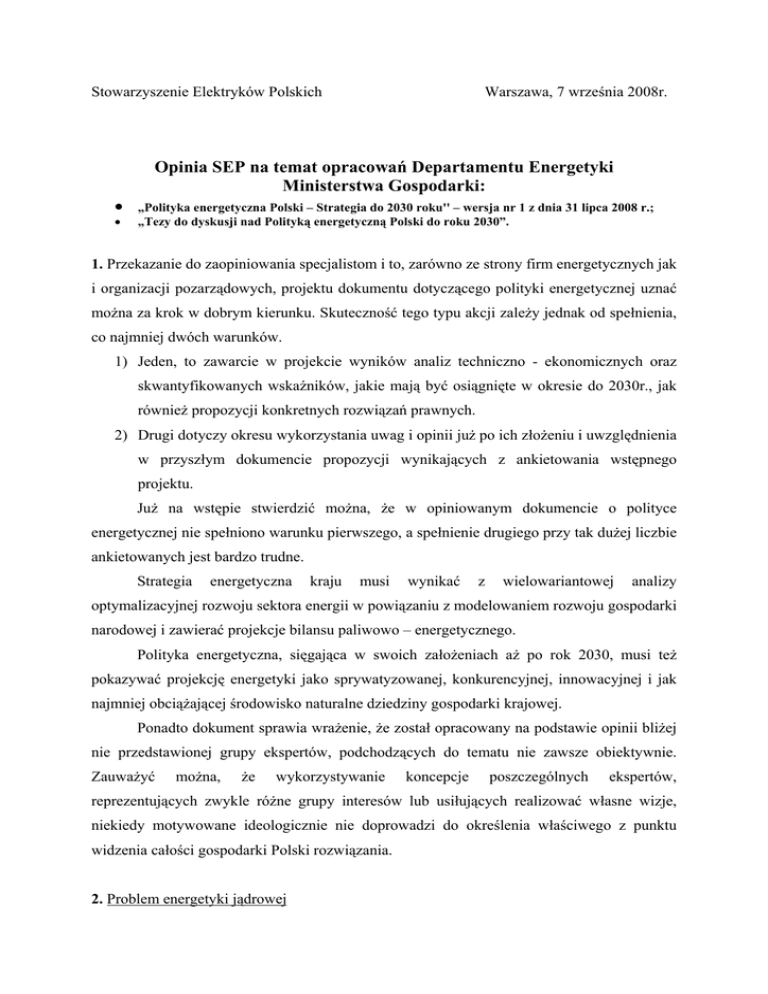 Stowarzyszenie Elektryków Polskich • • Warszawa, 7 września 2008r. Opinia SEP na temat opracowań Departamentu Energetyki Ministerstwa Gospodarki: „Polityka energetyczna Polski – Strategia do 2030 roku'' – wersja nr 1 z dnia 31 lipca 2008 r.; „Tezy do dyskusji nad Polityką energetyczną Polski do roku 2030”. 1. Przekazanie do zaopiniowania specjalistom i to, zarówno ze strony firm energetycznych jak i organizacji pozarządowych, projektu dokumentu dotyczącego polityki energetycznej uznać można za krok w dobrym kierunku. Skuteczność tego typu akcji zależy jednak od spełnienia, co najmniej dwóch warunków. 1) Jeden, to zawarcie w projekcie wyników analiz techniczno - ekonomicznych oraz skwantyfikowanych wskaźników, jakie mają być osiągnięte w okresie do 2030r., jak również propozycji konkretnych rozwiązań prawnych. 2) Drugi dotyczy okresu wykorzystania uwag i opinii już po ich złożeniu i uwzględnienia w przyszłym dokumencie propozycji wynikających z ankietowania wstępnego projektu. Już na wstępie stwierdzić można, że w opiniowanym dokumencie o polityce energetycznej nie spełniono warunku pierwszego, a spełnienie drugiego przy tak dużej liczbie ankietowanych jest bardzo trudne. Strategia energetyczna kraju musi wynikać z wielowariantowej analizy optymalizacyjnej rozwoju sektora energii w powiązaniu z modelowaniem rozwoju gospodarki narodowej i zawierać projekcje bilansu paliwowo – energetycznego. Polityka energetyczna, sięgająca w swoich założeniach aż po rok 2030, musi też pokazywać projekcję energetyki jako sprywatyzowanej, konkurencyjnej, innowacyjnej i jak najmniej obciążającej środowisko naturalne dziedziny gospodarki krajowej. Ponadto dokument sprawia wrażenie, że został opracowany na podstawie opinii bliżej nie przedstawionej grupy ekspertów, podchodzących do tematu nie zawsze obiektywnie. Zauważyć można, że wykorzystywanie koncepcje poszczególnych ekspertów, reprezentujących zwykle różne grupy interesów lub usiłujących realizować własne wizje, niekiedy motywowane ideologicznie nie doprowadzi do określenia właściwego z punktu widzenia całości gospodarki Polski rozwiązania. 2. Problem energetyki jądrowej 2.1 Większość wykonanych w ostatnich latach analiz optymalizacyjnych wykazała konieczność wprowadzenia w Polsce energetyki jądrowej już w pespektywie 2020r. W szczególności analizy wykonane przez ARE, jeszcze przed ogłoszeniem przez Komisję Europejską szczegółowych założeń pakietu energetyczno- klimatycznego, wykazały potrzebę uruchomienia w 2021r. EJ o mocy 1500 MW, a do 2030r. o mocy 7500 MW. Niewątpliwie, po ogłoszeniu przez KE propozycji ze stycznia 2008 r. wprowadzających znacznie wyższe koszty pozwoleń na redukcję lub emisję CO2 konieczna stała się aktualizacja tych analiz. Jest jednak oczywiste, że po uwzględnieniu tych nowych danych (kosztów) wyniki analiz wskażą na konieczność przyspieszenia budowy elektrowni jądrowych. Zwrócić można jednak uwagę, że uruchomienie EJ od roku 2020 wymaga już obecnie szybkiego podjęcia działań tworzących odpowiednie warunki dla inwestycji w elektrownie jądrowe. Konieczne jest dostosowanie oprzyrządowania prawnego, a także stworzenie instytucji i infrastruktury, które mogłyby zapewnić właściwą gospodarkę paliwem jądrowym i odpadami radioaktywnymi. Niezbędne staje się także z jednej strony podjęcie intensywnej akcji uświadamiającej społeczeństwo o znaczącym wzroście poziomu bezpieczeństwa nowoczesnych instalacji jądrowych, a z drugiej stworzenie przepisów mogących skutecznie zabezpieczyć przed efektywnymi protestami uniemożliwiającymi realizację już uzgodnionych projektów. 2.2 Dokument strategii na okres dwudziestu lat nie może zawierać sformułowań „...zasadne jest rozważenie wprowadzenia opcji energetyki jądrowej w Polsce” czy „Polska będzie też przygotowywać się do ... ewentualnego wprowadzenia energetyki jądrowej....” To są sformułowania wskazujące, że w okresie trwających ponad dwa lata prac nad nim nie dokonano żadnych rozważań pozwalających na powiedzenie czegoś więcej niż " ...zasadne jest rozważenie ...". Jak stwierdzały uchwały wielu sympozjów i konferencji organizowanych przez Stowarzyszenie Elektryków Polskich, w Polsce należy niezwłocznie podjąć działania dla zbudowania pierwszej, a potem dalszych elektrowni jądrowych [17]. Każdy rok opóźnienia to rok poważnych strat gospodarczych. Mówimy dziś o uruchomieniu pierwszej elektrowni jądrowej w 2021 roku, ale tylko dlatego, że nie jest to wcześniej możliwe. Jeżeli jednak będziemy zwlekać, minie i rok 2021 i następne lata – a elektrowni jądrowych nadal nie będzie. I będziemy nadal ponosić straty gospodarcze, których można było uniknąć. 2.3 Najpilniejsze w chwili obecnej to powołanie – umocowanej pod Premierem RP – jednostki, na przykład Agencji Wdrażania Energetyki Jądrowej, do której będzie należało skoordynowanie przygotowań do wdrożenia energetyki jądrowej w Polsce oraz stworzenie 2 niezbędnych podstaw prawnych i organizacyjnych dla jej skutecznego wdrożenia. W pierwszej kolejności zespół ten powinien przygotować materiały do dyskusji społecznej na temat budowy energetyki jądrowej w Polsce, zorganizować tę dyskusję i doprowadzić do podjęcia przez Parlament RP uchwały o wykorzystaniu energetyki jądrowej w Polsce. 3. Problem tzw. okresu przejściowego. Należy zwrócić uwagę, że przy obecnie występujących opóźnieniach inwestycyjnych w elektrowniach (zarówno o charakterze odtworzeniowym jak i nowych mocy) oraz w sieciach elektroenergetycznych, może zagrażać odbiorcom w Polsce ograniczenie dostaw mocy i energii elektrycznej po 2011 roku. Zagrożenie to potęguje wiele niebezpiecznych symptomów występujących w sektorze, a także w stosunku rządu do problemów sektora, a wśród nich: • brak poważnych inwestyc