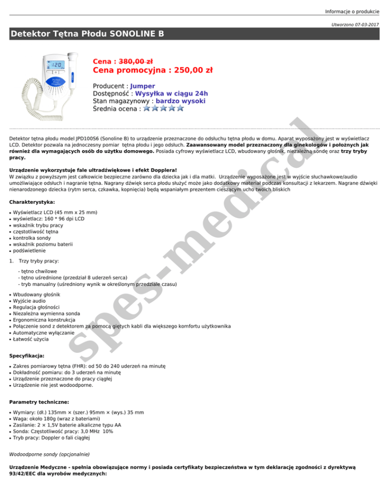 Informacje o produkcie Utworzono 07-03-2017 Detektor Tętna Płodu SONOLINE B Cena : 380,00 zł Cena promocyjna : 250,00 zł Producent : Jumper Dostępność : Wysyłka w ciągu 24h Stan magazynowy : bardzo wysoki Średnia ocena : al Detektor tętna płodu model JPD100S6 (Sonoline B) to urządzenie przeznaczone do odsłuchu tętna płodu w domu. Aparat wyposażony jest w wyświetlacz LCD. Detektor pozwala na jednoczesny pomiar tętna płodu i jego odsłuch. Zaawansowany model przeznaczony dla ginekologów i położnych jak również dla wymagających osób do użytku domowego. Posiada cyfrowy wyświetlacz LCD, wbudowany głośnik, niezależną sondę oraz trzy tryby pracy. ic Urządzenie wykorzystuje fale ultradźwiękowe i efekt Dopplera! W związku z powyższym jest całkowicie bezpieczne zarówno dla dziecka jak i dla matki. Urządzenie wyposażone jest w wyjście słuchawkowe/audio umożliwiające odsłuch i nagranie tętna. Nagrany dźwięk serca płodu służyć może jako dodatkowy materiał podczas konsultacji z lekarzem. Nagrane dźwięki nienarodzonego dziecka (rytm serca, czkawka, kopnięcia) będą wspaniałym prezentem cieszącym ucho twoich bliskich ● ● ● ● ● ● Wyświetlacz LCD (45 mm x 25 mm) wyświetlacz: 160 * 96 dpi LCD wskaźnik trybu pracy częstotliwość tętna kontrolka sondy wskaźnik poziomu baterii podświetlenie 1. Trzy tryby pracy: -m ● ed Charakterystyka: ● ● ● ● ● ● ● ● sp es - tętno chwilowe - tętno uśrednione (przedział 8 uderzeń serca) - tryb manualny (uśredniony wynik w określonym przedziale czasu) Wbudowany głośnik Wyjście audio Regulacja głośności Niezależna wymienna sonda Ergonomiczna konstrukcja Połączenie sond z detektorem za pomocą giętych kabli dla większego komfortu użytkownika Automatyczne wyłączanie Łatwość użycia Specyfikacja: ● ● ● ● Zakres pomiarowy tętna (FHR): od 50 do 240 uderzeń na minutę Dokładność pomiaru: do 3 uderzeń na minutę Urządzenie przeznaczone do pracy ciągłej Urządzenie nie jest wodoodporne. Parametry techniczne: ● ● ● ● ● Wymiary: (dł.) 135mm × (szer.) 95mm × (wys.) 35 mm Waga: około 180g (wraz z bateriami) Zasilanie: 2 × 1,5V baterie alkaliczne typu AA Sonda: Częstotliwość pracy: 3,0 MHz 10% Tryb pracy: Doppler o fali ciągłej Wodoodporne sondy (opcjonalnie) Urządzenie Medyczne - spełnia obowiązujące normy i posiada certyfikaty bezpieczeństwa w tym deklarację zgodności z dyrektywą 93/42/EEC dla wyrobów medycznych: ZAWARTOŚĆ ZESTAWU: - monitor tętna płodu - sonda - żel USG do badania sp es -m ed ic al Gwarancja: 12 miesięcy