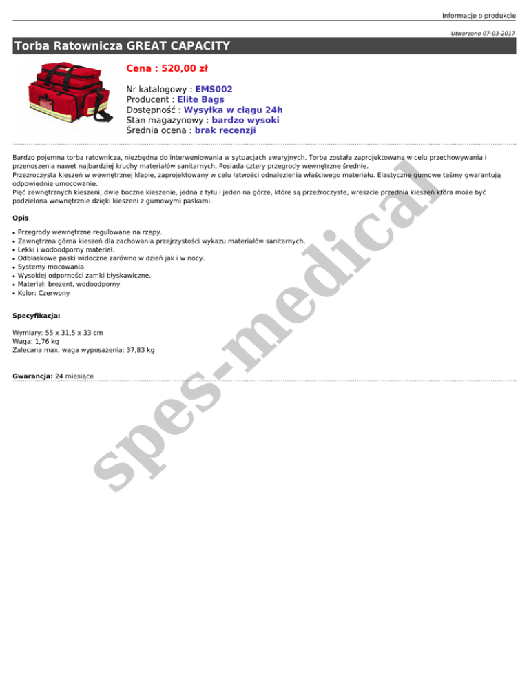 Informacje o produkcie Utworzono 07-03-2017 Torba Ratownicza GREAT CAPACITY Cena : 520,00 zł Nr katalogowy : EMS002 Producent : Elite Bags Dostępność : Wysyłka w ciągu 24h Stan magazynowy : bardzo wysoki Średnia ocena : brak recenzji Opis ● ● ● ● ● ● Przegrody wewnętrzne regulowane na rzepy. Zewnętrzna górna kieszeń dla zachowania przejrzystości wykazu materiałów sanitarnych. Lekki i wodoodporny materiał. Odblaskowe paski widoczne zarówno w dzień jak i w nocy. Systemy mocowania. Wysokiej odporności zamki błyskawiczne. Materiał: brezent, wodoodporny Kolor: Czerwony ic ● ed ● al Bardzo pojemna torba ratownicza, niezbędna do interweniowania w sytuacjach awaryjnych. Torba została zaprojektowana w celu przechowywania i przenoszenia nawet najbardziej kruchy materiałów sanitarnych. Posiada cztery przegrody wewnętrzne średnie. Przezroczysta kieszeń w wewnętrznej klapie, zaprojektowany w celu łatwości odnalezienia właściwego materiału. Elastyczne gumowe taśmy gwarantują odpowiednie umocowanie. Pięć zewnętrznych kieszeni, dwie boczne kieszenie, jedna z tyłu i jeden na górze, które są przeźroczyste, wreszcie przednia kieszeń która może być podzielona wewnętrznie dzięki kieszeni z gumowymi paskami. Wymiary: 55 x 31,5 x 33 cm Waga: 1,76 kg Zalecana max. waga wyposażenia: 37,83 kg sp es Gwarancja: 24 miesiące -m Specyfikacja: