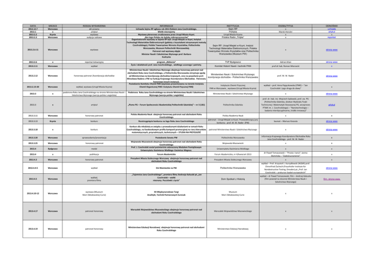 DATA MIEJSCE RODZAJ WYDARZENIA 2012.12.7 2013.1 2013.2.2 2013.2.3 Warszawa x Kcynia Warszawa akt prawny artykuł wystawa audycja radiowa 2013.2.6-11 Warszawa wystawa 2013.2.6 x reportaż telewizyjny 2013.2.11 Warszawa wykład 2013.2.12 Warszawa honorowy patronat /koordynacja obchodów 2013.2.15-20 Warszawa wykład, wystawa (Urząd Miasta Kcynia) x podstrona Roku Jana Czochralskiego na stronie Ministerstwa Nauki i Szkolnictwa Wyższego (wersja polska i angielska) 2013.3 INFORMACJE INSTYTUCJA OSOBA/TYTUŁ ODNOŚNIKI x Marek Henzler x x uchwała artykuł x reportaż x strona www TVP Bydgoszcz Adrian Kilan strona www Komitet Historii Nauki i techniki PAN prof.dr hab. Roman Mierzecki x prof. M. W. Nader strona www wykład – prof. Anna Pajączkowska (ITME) – "Jan Czochralski i jego droga do sławy" x Ministerstwo Nauki i Szkolnictwa Wyższego x strona www Politechnika Gdańska prof. dr. hab. inż. Wojciech Sadowski, prof. zw. PG (Politechnika Gdańska, dziekan Wydziału Fizyki Technicznej i Matematyki Stosowanej PG, wiceprezes PTWK im. J. Czochralskiego) – "Nanotechnologia – badania interdyscyplinarne, źródło innowacji" artykuł Uchwała Sejmu RP ogłasza rok 2013 Rokiem Jana Czochralskiego. Sejm RP Wielki nieznajomy Polityka Wystawa plenerowa zrealizowana przez Urząd Miasta Kcyni. Urząd Miasta Kcynia „Bez tego Polaka nie byłoby mikroprocesorów” Polskie Radio „Trójka” Organizatorami wystawy w Sejmie RP byli: Urząd Miejski w Kcyni, Instytut Technologii Materiałów Elektronicznych (gabloty z kryształami otrzymanymi metodą Czochralskiego), Polskie Towarzystwo Wzrostu Kryształów, Politechnika Sejm RP, Urząd Miejski w Kcyni, Instytut Warszawska, Muzeum Politechniki Warszawskiej. Technologii Materiałów Elektronicznych, Polskie Towarzystwo Wzrostu Kryształów oraz Politechnika Patronat nad wystawą objęła Warszawska (Muzeum PW) Minister Nauki i Szkolnictwa Wyższego prof. Barbara Kudrycka program „Zbliżenia” Życie i działalność prof. Jana Czochralskiego , wielkiego uczonego i patrioty. Ministerstwo Nauki i Szkolnictwa Wyższego obejmuje honorowy patronat nad obchodami Roku Jana Czochralskiego, a Politechnika Warszawska otrzymuje zgodę Ministerstwo Nauki i Szkolnictwa Wyższego; od Ministerstwa na koordynację obchodów krajowych, oraz na powołanie prof. koordynacja obchodów - Politechnika Warszawska Mirosława Nadera z PW na funkcję Krajowego Koordynatora Obchodów. Patronaty honorowe innych instytucji. Posiedzenie Komitetu Chemii PAN (wystawa prezentowana na terenie Instytutu Instytucie Chemii Fizycznej Chemii Organicznej PAN i Instytutu Chemii Fizycznej PAN) PAN w Warszawie , wystawa-(Urząd Miasta Kcynia) Podstrona Roku Jana Czochralskiego na stronie Ministerstwa Nauki i Szkolnictwa Wyższego (wersja polska i angielska) 2013.3 x artykuł „Pismo PG – Forum Społeczności Akademickiej Politechniki Gdańskiej” – nr 3 (181) 2013.3.11 Warszawa honorowy patronat Polska Akademia Nauk obejmuje honorowy patronat nad obchodami Roku Czochralskiego Polska Akademia Nauk x x 2013.3.13 Kcynia konkurs Rozstrzygnięcie konkursu na logo Roku Jana Czochralskiego patronat – Urząd Miejski w Kcyni. Przewodniczący jury konkursu - prof. M. W. Nader (PW) laureat – Mariusz Koszuta strona www 2013.3.18 x konkurs Konkurs dla młodzieży w związku z prowadzonymi działaniami w ramach Roku Czochralskiego, na facebookowym profilu kampanii promocyjnej na rzecz kierunków matematycznych, przyrodniczych, technicznych – STUDIA NA PRZYSZŁOŚĆ patronat Ministerstwa Nauki i Szkolnictwa Wyższego x strona www 2013.3.20 Warszawa sprawozdanie/prezentacja Posiedzenie Senatu PW Politechnika Warszawska Informacja Krajowego Koordynatora Obchodów Roku Jana Czochralskiego - prof. M. W. Nader x 2013.3.25 Warszawa honorowy patronat Wojewoda Mazowiecki x x 2013.4 Bydgoszcz medal Uniwersytetu Kazimierza Wielkiego x x 2013.4 x publikacja Forum Akademickie Forum Akademickie, nr 4/kwiecień 2013 dr Paweł Tomaszewski – "Prosta i tania"; Janina Słomińska – "Zadośćuczynienie" x 2013.4.3 Warszawa honorowy patronat Prezydent Miasta Stołecznego Warszawy obejmuje honorowy patronat nad obchodami Roku Czochralskiego Prezydent Miasta Stołecznego Warszawy x x Politechnika Warszawska wykład – Prof. Krzysztof J. Kurzydłowski (NCBiR) prof. Ehrenfried Zschech (Fraunhofer Institute for Nondestructive Testing, Dresden) pt.„Prof. Jan Czochralski – prekursor badań europejskich” strona www Dom Spotkań z Historią wykład – dr Paweł Tomaszewski, film – Andrzej Kałuszko (film powstał na zlecenie Ministerstwa Nauki i Szkolnictwa Wyższego) film, strona www. Wojewoda Mazowiecki obejmuje honorowy patronat nad obchodami Roku Czochralskiego Prof. J. Czochralski został pośmiertnie odznaczony Medalem Pamiątkowym Uniwersytetu Kazimierza Wielkiego Casimirus Magnus. 2013.4.4-5 Warszawa wykład Dni Niemieckie na PW 2013.4.5 Warszawa wykład, premiera filmu „Tajemnice Jana Czochralskiego”, premiera filmu Andrzeja Kałuszki pt.„Jan Czochralski – wielki nieznany. Pocztówki z życia” 2013.4.10-12 Warszawa wystawa (Muzeum Marii Skłodowskiej-Curie) XII Międzynarodowe Targi Analityki, Technik Pomiarowych EuroLab Muzeum Marii Skłodowskiej-Curie x x 2013.4.17 Warszawa patronat honorowy Marszałek Województwa Mazowieckiego obejmuje honorowy patronat nad obchodami Roku Czochralskiego Marszałek Województwa Mazowieckiego x x 2013.4.19 Warszawa patronat honorowy Ministerstwo Edukacji Narodowej obejmuje honorowy patronat nad obchodami Roku Czochralskiego Ministerstwo Edukacji Narodowej x x Wystawa 60 ROCZNICA ŚMIERCI PROF. JANA CZOCHRALSKIEGO. Na wystawie prezentowane były materiały będące w posiadaniu Muzeum PW i Biblioteki Głównej PW, materiały prof. M. W. Nadera, jak również wystawa planszowa będąca własnością Urzędu Miasta Kcyni. Na stanowisku multimedialnym zaprezentowano dwa filmy "Jan Czochralski Wielki Nieznany. Pocztówki z życia" w reż. Andrzeja Kałusz
