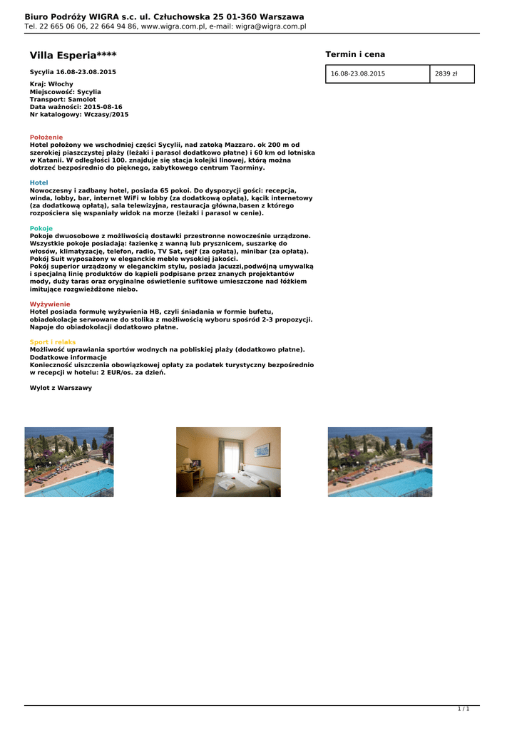 Biuro Podróży WIGRA s.c. ul. Człuchowska 25 01-360 Warszawa Tel. 22 665 06 06, 22 664 94 86, www.wigra.com.pl, e-mail: [email protected] Villa Esperia**** Termin i cena Sycylia 16.08-23.08.2015 16.08-23.08.2015 2839 zł Kraj: Włochy Miejscowość: Sycylia Transport: Samolot Data ważności: 2015-08-16 Nr katalogowy: Wczasy/2015 Położenie Hotel położony we wschodniej części Sycylii, nad zatoką Mazzaro. ok 200 m od szerokiej piaszczystej plaży (leżaki i parasol dodatkowo płatne) i 60 km od lotniska w Katanii. W odległości 100. znajduje się stacja kolejki linowej, którą można dotrzeć bezpośrednio do pięknego, zabytkowego centrum Taorminy. Hotel Nowoczesny i zadbany hotel, posiada 65 pokoi. Do dyspozycji gości: recepcja, winda, lobby, bar, internet WiFi w lobby (za dodatkową opłatą), kącik internetowy (za dodatkową opłatą), sala telewizyjna, restauracja główna,basen z którego rozpościera się wspaniały widok na morze (leżaki i parasol w cenie). Pokoje Pokoje dwuosobowe z możliwością dostawki przestronne nowocześnie urządzone. Wszystkie pokoje posiadają: łazienkę z wanną lub prysznicem, suszarkę do włosów, klimatyzację, telefon, radio, TV Sat, sejf (za opłatą), minibar (za opłatą). Pokój Suit wyposażony w eleganckie meble wysokiej jakości. Pokój superior urządzony w eleganckim stylu, posiada jacuzzi,podwójną umywalką i specjalną linię produktów do kąpieli podpisane przez znanych projektantów mody, duży taras oraz oryginalne oświetlenie sufitowe umieszczone nad łóżkiem imitujące rozgwieżdżone niebo. Wyżywienie Hotel posiada formułę wyżywienia HB, czyli śniadania w formie bufetu, obiadokolacje serwowane do stolika z możliwością wyboru spośród 2-3 propozycji. Napoje do obiadokolacji dodatkowo płatne. Sport i relaks Możliwość uprawiania sportów wodnych na pobliskiej plaży (dodatkowo płatne). Dodatkowe informacje Konieczność uiszczenia obowiązkowej opłaty za podatek turystyczny bezpośrednio w recepcji w hotelu: 2 EUR/os. za dzień. Wylot z Warszawy 1/1 Powered by TCPDF (www.tcpdf.org)