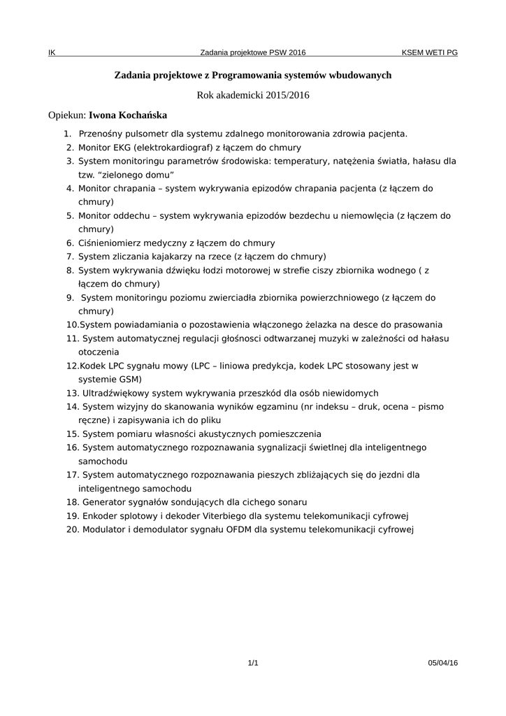 IK Zadania projektowe PSW 2016 KSEM WETI PG Zadania projektowe z Programowania systemów wbudowanych Rok akademicki 2015/2016 Opiekun: Iwona Kochańska 1. Przenośny pulsometr dla systemu zdalnego monitorowania zdrowia pacjenta. 2. Monitor EKG (elektrokardiograf) z łączem do chmury 3. System monitoringu parametrów środowiska: temperatury, natężenia światła, hałasu dla tzw. “zielonego domu” 4. Monitor chrapania – system wykrywania epizodów chrapania pacjenta (z łączem do chmury) 5. Monitor oddechu – system wykrywania epizodów bezdechu u niemowlęcia (z łączem do chmury) 6. Ciśnieniomierz medyczny z łączem do chmury 7. System zliczania kajakarzy na rzece (z łączem do chmury) 8. System wykrywania dźwięku łodzi motorowej w strefie ciszy zbiornika wodnego ( z łączem do chmury) 9. System monitoringu poziomu zwierciadła zbiornika powierzchniowego (z łączem do chmury) 10.System powiadamiania o pozostawienia włączonego żelazka na desce do prasowania 11. System automatycznej regulacji głośnosci odtwarzanej muzyki w zależności od hałasu otoczenia 12.Kodek LPC sygnału mowy (LPC – liniowa predykcja, kodek LPC stosowany jest w systemie GSM) 13. Ultradźwiękowy system wykrywania przeszkód dla osób niewidomych 14. System wizyjny do skanowania wyników egzaminu (nr indeksu – druk, ocena – pismo ręczne) i zapisywania ich do pliku 15. System pomiaru własności akustycznych pomieszczenia 16. System automatycznego rozpoznawania sygnalizacji świetlnej dla inteligentnego samochodu 17. System automatycznego rozpoznawania pieszych zbliżających się do jezdni dla inteligentnego samochodu 18. Generator sygnałów sondujących dla cichego sonaru 19. Enkoder splotowy i dekoder Viterbiego dla systemu telekomunikacji cyfrowej 20. Modulator i demodulator sygnału OFDM dla systemu telekomunikacji cyfrowej 1/1 05/04/16