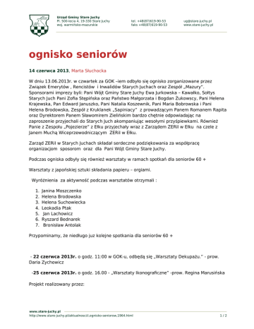 Urząd Gminy Stare Juchy Pl. 500-lecia 4, 19-330 Stare Juchy woj. warmińsko-mazurskie tel. +48(87)619-90-53 faks +48(87)619-90-53 [email protected] www.stare-juchy.pl ognisko seniorów 14 czerwca 2013, Marta Słuchocka W dniu 13.06.2013r. w czwartek za GOK –iem odbyło się ognisko zorganizowane przez Związek Emerytów , Rencistów i Inwalidów Starych Juchach oraz Zespół „Mazury”. Sponsorami imprezy byli: Pani Wójt Gminy Stare Juchy Ewa Jurkowska – Kawałko, Sołtys Starych Juch Pani Zofia Stępińska oraz Państwo Małgorzata i Bogdan Żukowscy, Pani Helena Krajewska, Pan Edward Januszko, Pani Natalia Koszewnik, Pani Maria Bobrowska i Pani Helena Brodowska, Zespół z Kruklanek „Sapiniacy” z prowadzącym Panem Romanem Rapita oraz Dyrektorem Panem Sławomirem Zielińskim bardzo chętnie odpowiadając na zaproszenie przyjechali do Starych Juch akompaniując wesołymi przyśpiewkami. Również Panie z Zespołu „Pojezierze” z Ełku przyjechały wraz z Zarządem ZERiI w Ełku na czele z Janem Muchą Wiceprzewodniczącym ZERiI w Ełku. Zarząd ZERiI w Starych Juchach składał serdeczne podziękowania za współpracę organizacjom sposorom oraz dla Pani Wójt Gminy Stare Juchy. Podczas ogniska odbyły się również warsztaty w ramach spotkań dla seniorów 60 + Warsztaty z japońskiej sztuki składania papieru – orgiami. Wyróżnienia za aktywność podczas warsztatów otrzymali : 1. 2. 3. 4. 5. 6. 7. Janina Moszczenko Helena Brodowska Helena Suchowiecka Leokadia Ptak Jan Lachowicz Ryszard Bednarek Bronisław Antolak Przypominamy, że niedługo juz kolejne spotkania dla seniorów 60 + - 22 czerwca 2013r. o godz. 11:00 w GOK-u, odbędą się „Warsztaty Dekupażu.” - prow. Daria Zychowicz -25 czerwca 2013r. o godz. 16.00 - „Warsztaty Ikonograficzne” -prow. Regina Marusińska Projekt realizowany przez: www.stare-juchy.pl http://www.stare-juchy.pl/aktualnosci/i,ognisko-seniorow,1964.html 1/2 Urząd Gminy Stare Juchy Pl. 500-lecia 4, 19-330 Stare Juchy woj. warmińsko-mazurskie tel. +48(87)619-90-53 faks +48(87)619-90-53 [email protected] www.stare-juchy.pl Mazurskie Stowarzyszenie Aktywności Lokalnej 12-250 Orzysz ul. 22 Lipca 15, tel. 768 140 648 www.stare-juchy.pl http://www.stare-juchy.pl/aktualnosci/i,ognisko-seniorow,1964.html 2/2