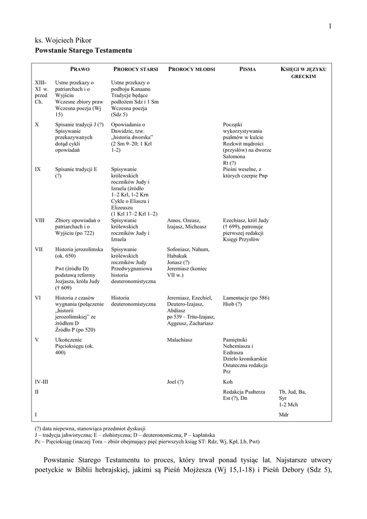 1 ks. Wojciech Pikor Powstanie Starego Testamentu PRAWO PROROCY STARSI XIIIXI w. przed Ch. Ustne przekazy o patriarchach i o Wyjściu Wczesne zbiory praw Wczesna poezja (Wj 15) Ustne przekazy o podboju Kanaanu Tradycje będące podłożem Sdz i 1 Sm Wczesna poezja (Sdz 5) X Spisanie tradycji J (?) Spisywanie przekazywanych dotąd cykli opowiadań Opowiadania o Dawidzie, tzw. „historia dworska” (2 Sm 9‒20; 1 Krl 1-2) IX Spisanie tradycji E (?) VIII Zbiory opowiadań o patriarchach i o Wyjściu (po 722) Spisywanie królewskich roczników Judy i Izraela (źródło 1‒2 Krl, 1-2 Krn Cykle o Eliaszu i Elizeuszu (1 Krl 17‒2 Krl 1‒2) Spisywanie królewskich roczników Judy i Izraela VII Historia jerozolimska (ok. 650) PROROCY MŁODSI PISMA KSIĘGI W JĘZYKU GRECKIM Pwt (źródło D) podstawą reformy Jozjasza, króla Judy († 609) VI Historia z czasów wygnania (połączenie „historii jerozolimskiej” ze źródłem D Źródło P (po 520) V Ukończenie Pięcioksięgu (ok. 400) IV-III II Początki wykorzystywania psalmów w kulcie Rozkwit mądrości (przysłów) na dworze Salomona Rt (?) Pieśni weselne, z których czerpie Pnp Amos, Ozeasz, Izajasz, Micheasz Ezechiasz, król Judy († 699), patronuje pierwszej redakcji Księgi Przysłów Spisywanie królewskich roczników Judy Przedwygnaniowa historia deuteronomistyczna Sofoniasz, Nahum, Habakuk Jonasz (?) Jeremiasz (koniec VII w.) Historia deuteronomistyczna Jeremiasz, Ezechiel, Deutero-Izajasz, Abdiasz po 539 ‒ Trito-Izajasz, Aggeusz, Zachariasz Lamentacje (po 586) Hiob (?) Malachiasz Pamiętniki Nehemiasza i Ezdrasza Dzieło kronikarskie Ostateczna redakcja Prz Joel (?) Koh Redakcja Psałterza Est (?), Dn I Tb, Jud, Ba, Syr 1-2 Mch Mdr (?) data niepewna, stanowiąca przedmiot dyskusji J ‒ tradycja jahwistyczna; E ‒ elohistyczna; D ‒ deuteronomiczna; P ‒ kapłańska Pc ‒ Pięcioksiąg (inaczej Tora ‒ zbiór obejmujący pięć pierwszych ksiąg ST: Rdz, Wj, Kpł, Lb, Pwt) Powstanie Starego Testamentu to proces, który trwał ponad tysiąc lat. Najstarsze utwory poetyckie w Biblii hebrajskiej, jakimi są Pieśń Mojżesza (Wj 15,1-18) i Pieśń Debory (Sdz 5), 2 sięgają prawdopodobnie XII wieku przed Chrystusem. Najpóźniejsze księgi Starego Testamentu spisane w języku hebrajskim ‒ Daniela i Estery ‒ powstały w II wieku przed Chrystusem. Natomiast ostatnie księgi Starego Testamentu powstałe w języku greckim ‒ Druga Księga Machabejska i Księga Mądrości ‒ datowane są na I wiek przed Chrystusem. Podczas tego długiego okresu powstawania Biblii miało miejsce stopniowe łączenie pojedynczych tekstów w zbiory, a następnie w księgi, te zaś w większe dzieła. Przybliżony czas powstawania tekstów Starego Testamentu został przedstawiony schematycznie wyżej. 1. Redakcja Pięcioksięgu Redakcja Tory musiał trwać około dziesięciu wieków. Wydarzenie Wyjścia pierwotnie było przedmiotem przekazu ustnego. Jakieś formy spisane mogły pojawić się dopiero w momencie powstania monarchii na przełomie XI/X wieku przed Chrystusem. By wyjaśnić powstanie Pięcioksięgu, dawniej przyjmowano teorię czterech tradycji (źródeł). Obecnie teoria ta ustępuje przekonaniu, że Tora powstała na bazie niezależnych cykli opowiadań i zbiorów prawnych, które na przestrzeni wieków podlegały nowym relekturom, czyli były odczytywane i redagowane na nowo w zmieniającym się kontekście historycznym. Bez wątpienia wpływ na ostateczny kształt tradycji o Wyjściu miał nurt prorocki rozwijający się w połowie VIII wieku w Królestwie Północnym czy ‒ jeszcze bardziej ‒ doświadczenie niewoli babilońskiej w VI wieku. Kiedy po powrocie z wygnania babilońskiego następuje ostateczna redakcja Pięcioksięgu, nie ma ona już charakteru kompilacyjnego. Istniejący wcześniej zbiór Tory zostaje rozszerzony o narrację i kodyfikację kapłańską, która dokonuje również wielu innych interwencji redakcyjnych. Ich efektem jest obecnie spójny strukturalnie i przemyślany kompozycyjnie zbiór ksiąg stanowiących fundament i zasadę życia wspólnoty żydowskiej. Na przestrzeni wieków zmieniało się spojrzenie na proces powstania Tory, czyli pierwszych pięciu ksiąg Starego Testamentu (tzw. Pięcioksiąg). Do XVII wieku po Chrystusie nie kwestionowano autorstwa Mojżesza, a tym samym zakładano, że Tora powstała w czasie wędrówki Izraelitów przez pustynię po wyzwoleniu z niewoli egipskiej (ok. XIII wieku przed Chrystusem). Rozwój badań literackich nad Pięcioksięgiem podał w wątpliwość takie założenie. W to miejsce zaproponowano teorię czterech dokumentów (źródeł), których kompilacja dała w efekcie znany obecnie tekst Tory. W świetle tej hipotezy, ostatecznie sformułowanej przez Juliusza Wellhausena pod koniec XIX wieku, najstarszym źródłem Pięcioksięgu jest dokument jahwistyczny z IX wieku przed Chrystusem (J ‒ nazywany tak od jej autora, którego nazywano Jahwistą z powodu używania przez niego w odniesieniu do Boga imienia Jahwe). Dokument elohistyczny pochodziłby z VIII wieku przed Chrystusem (E ‒ od Elohisty, który na określenie Boga używał imienia Elohim). W drugiej połowie VII wieku po Chrystusie, w związku z reformami podjętymi przez króla Jozjasza, powstała Księga Powtórzonego Prawa, stanowiąca kolejne źródło Pięcioksięgu (D ‒ deuteronomiczne; od łacińskiej nazwy księgi: Deuteronomium, czyli „drugie Prawo”). W V wieku po Chrystusie powstał ostatni z dokumentów składających się na Torę ‒ źródło kapłańskie (P ‒ skrót od niemieckiej nazwy tego dokumentu: Priesterquelle). Zostało ono dołączone do istniejących wcześniej dokumentów Pięcioksięgu pod koniec V wieku po Chrystusie. Powyższa rekonstrukcja budzi wiele wątpliwości, choć do dzisiaj pozostaje punktem wyjścia w debacie nad genezą i datowaniem Tory. Dyskusyjne są: kwestia istnienia źródła elohistycznego 3 (niektórzy kwestionują jego istnienie),