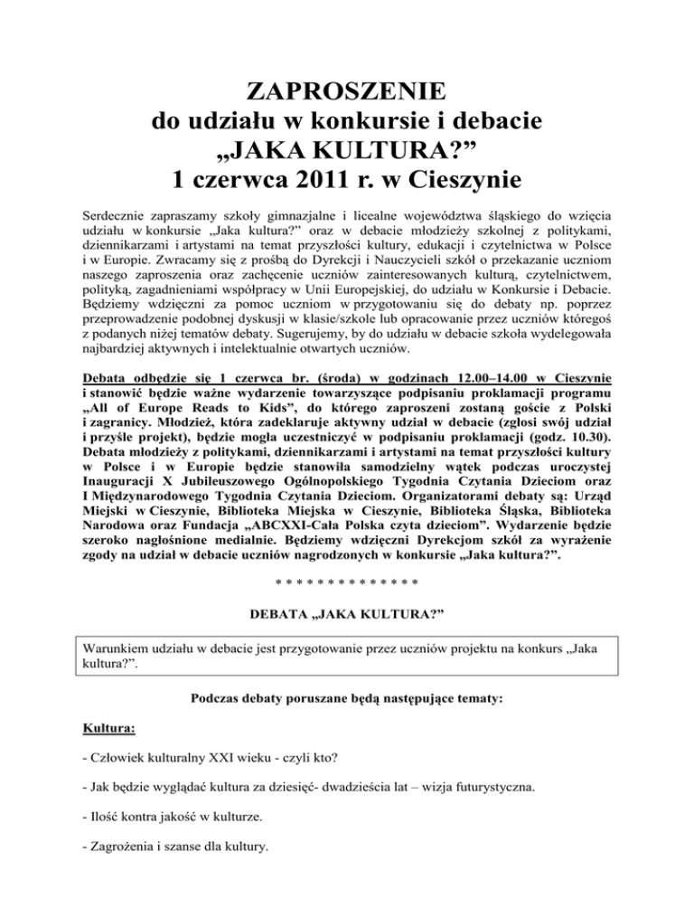ZAPROSZENIE do udziału w konkursie i debacie „JAKA KULTURA?” 1 czerwca 2011 r. w Cieszynie Serdecznie zapraszamy szkoły gimnazjalne i licealne województwa śląskiego do wzięcia udziału w konkursie „Jaka kultura?” oraz w debacie młodzieży szkolnej z politykami, dziennikarzami i artystami na temat przyszłości kultury, edukacji i czytelnictwa w Polsce i w Europie. Zwracamy się z prośbą do Dyrekcji i Nauczycieli szkół o przekazanie uczniom naszego zaproszenia oraz zachęcenie uczniów zainteresowanych kulturą, czytelnictwem, polityką, zagadnieniami współpracy w Unii Europejskiej, do udziału w Konkursie i Debacie. Będziemy wdzięczni za pomoc uczniom w przygotowaniu się do debaty np. poprzez przeprowadzenie podobnej dyskusji w klasie/szkole lub opracowanie przez uczniów któregoś z podanych niżej tematów debaty. Sugerujemy, by do udziału w debacie szkoła wydelegowała najbardziej aktywnych i intelektualnie otwartych uczniów. Debata odbędzie się 1 czerwca br. (środa) w godzinach 12.00–14.00 w Cieszynie i stanowić będzie ważne wydarzenie towarzyszące podpisaniu proklamacji programu „All of Europe Reads to Kids”, do którego zaproszeni zostaną goście z Polski i zagranicy. Młodzież, która zadeklaruje aktywny udział w debacie (zgłosi swój udział i przyśle projekt), będzie mogła uczestniczyć w podpisaniu proklamacji (godz. 10.30). Debata młodzieży z politykami, dziennikarzami i artystami na temat przyszłości kultury w Polsce i w Europie będzie stanowiła samodzielny wątek podczas uroczystej Inauguracji X Jubileuszowego Ogólnopolskiego Tygodnia Czytania Dzieciom oraz I Międzynarodowego Tygodnia Czytania Dzieciom. Organizatorami debaty są: Urząd Miejski w Cieszynie, Biblioteka Miejska w Cieszynie, Biblioteka Śląska, Biblioteka Narodowa oraz Fundacja „ABCXXI-Cała Polska czyta dzieciom”. Wydarzenie będzie szeroko nagłośnione medialnie. Będziemy wdzięczni Dyrekcjom szkół za wyrażenie zgody na udział w debacie uczniów nagrodzonych w konkursie „Jaka kultura?”. ************** DEBATA „JAKA KULTURA?” Warunkiem udziału w debacie jest przygotowanie przez uczniów projektu na konkurs „Jaka kultura?”. Podczas debaty poruszane będą następujące tematy: Kultura: - Człowiek kulturalny XXI wieku - czyli kto? - Jak będzie wyglądać kultura za dziesięć- dwadzieścia lat – wizja futurystyczna. - Ilość kontra jakość w kulturze. - Zagrożenia i szanse dla kultury. Edukacja: - Jakiego człowieka powinna wychowywać i kształcić szkoła? - Jak powinna wyglądać szkoła XXI wieku? - Jaki powinien być nauczyciel XXI wieku? - Portret obywatela Polski, portret obywatela Europy. Czytelnictwo: - Dlaczego czytanie nie jest popularne? - Czy książki są potrzebne? Jeśli tak, to jakie (treść, forma, kanały dotarcia do czytelnika)? - W jaki sposób skutecznie przekonać młodych ludzi do czytania książek? - Jak wychować i utrzymać czytelnika? ZASADY KONKURSU Zgłoszenia zespołów uczniów do udziału konkursie „Jaka kultura?”, podpisane przez Dyrektora szkoły, przyjmowane będą drogą mailową (skan zgłoszenia) na adres: [email protected] do 15 kwietnia 2011 r. Zainteresowane 2-4 osobowe zespoły uczniów proszone są o przygotowanie jednego lub dwóch projektów kampanii/ reklamy społecznej z zakresu tematyki, która będzie poruszana podczas debaty. Projekty mogą być zrealizowane dowolną techniką i w dowolnej formie, np. filmu, nagrania dźwiękowego, plakatu, logo, sloganu, instalacji, rzeźby, płaskorzeźby, happeningu, skeczu, pantomimy itp. Prezentacja jednego projektu podczas debaty nie może przekroczyć 3 minut. Organizatorzy konkursu stawiają na inteligencję, kreatywność, poczucie humoru i pasję uczestników. Treści i obrazy wulgarne, rasistowskie, drastyczne itp. będą dyskwalifikować projekt. Projekty reklamowe: filmy, opisy (max 1 strona), zdjęcia prac plastycznych (max 10 szt.), nagrania audio, prezentacje ppt. itp., przygotowane w wersji elektronicznej (wyłącznie formaty doc, jpg, pdf, ppt) i nagrane na płytach DVD należy przesłać do 10 maja 2011 r. na adres pocztowy (liczy się data stempla pocztowego): Aneta Satława Biblioteka Śląska 40-021 Katowice Plac Rady Europy 1 Z dopiskiem: Projekt na debatę. UWAGA! Do przesyłki z materiałami prezentacyjnymi należy dołączyć podpisany przez Dyrektora szkoły oryginał zgłoszenia. Projekty zostaną ocenione przez Jury złożone ze specjalistów w dziedzinie kultury, mediów i reklamy. Werdykt Jury jest ostateczny. Autorzy najciekawszych projektów zostaną zaproszeni do udziału w debacie i zaprezentowania na niej swych prac. Każdy Autor otrzyma dyplom uznania z podpisami polityków, dziennikarzy i artystów obecnych podczas debaty oraz książkę nagrodzoną w Konkursie Literackim im. Astrid Lindgren. Zwycięskie projekty zostaną również przedstawione na stronach internetowych Biblioteki Śląskiej, Biblioteki Narodowej, Fundacji „ABCXXI – Cała Polska czyta dzieciom” oraz na portalu YouTube. Zostaną też przesłane do Parlamentu Europejskiego. Wyniki konkursu zostaną ogłoszone pod koniec maja br. na stronach www Organizatorów, a Laureaci otrzymają indywidualne powiadomienia drogą mailową. Organizatorzy debaty pokryją Autorom nagrodzonych projektów koszty podróży do i z Cieszyna do miejsca zamieszkania Autorów. Koszt przygotowania projektów ponoszą szkoły/Autorzy projektów. Nauczyciele, którzy zechcą się podjąć pomocy uczniom w przygotowaniach do udziału w debacie, będą mogli również wziąć w niej udział, po jednej osobie z danej szkoły. Szkoły, do których uczęszczają Autorzy najciekawszych projektów, otrzymają dyplomy oraz pakiety książek, w tym książki autorstwa Ireny Koźmińskiej i Elżbiety Olszewskiej: „Wychowanie przez czytanie” oraz „Z dzieckiem w świat wartości”. Kontakt: Aneta Satława: Biblioteka Śląska, Plac Rady Europy 1, 40-021 Katowice,