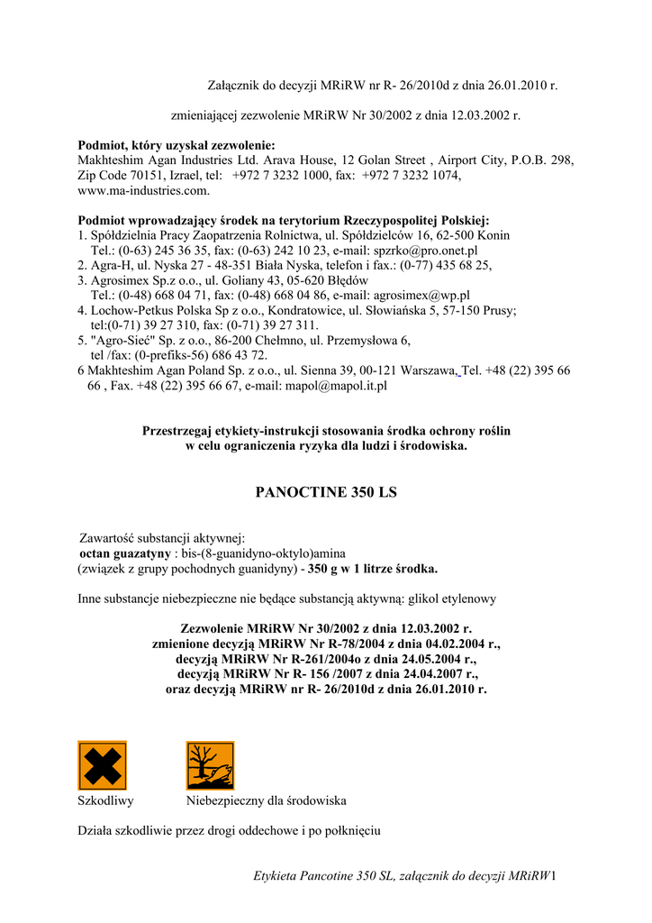 Załącznik do decyzji MRiRW nr R- 26/2010d z dnia 26.01.2010 r. zmieniającej zezwolenie MRiRW Nr 30/2002 z dnia 12.03.2002 r. Podmiot, który uzyskał zezwolenie: Makhteshim Agan Industries Ltd. Arava House, 12 Golan Street , Airport City, P.O.B. 298, Zip Code 70151, Izrael, tel: +972 7 3232 1000, fax: +972 7 3232 1074, www.ma-industries.com. Podmiot wprowadzający środek na terytorium Rzeczypospolitej Polskiej: 1. Spółdzielnia Pracy Zaopatrzenia Rolnictwa, ul. Spółdzielców 16, 62-500 Konin Tel.: (0-63) 245 36 35, fax: (0-63) 242 10 23, e-mail: [email protected] 2. Agra-H, ul. Nyska 27 - 48-351 Biała Nyska, telefon i fax.: (0-77) 435 68 25, 3. Agrosimex Sp.z o.o., ul. Goliany 43, 05-620 Błędów Tel.: (0-48) 668 04 71, fax: (0-48) 668 04 86, e-mail: [email protected] 4. Lochow-Petkus Polska Sp z o.o., Kondratowice, ul. Słowiańska 5, 57-150 Prusy; tel:(0-71) 39 27 310, fax: (0-71) 39 27 311. 5. "Agro-Sieć" Sp. z o.o., 86-200 Chełmno, ul. Przemysłowa 6, tel /fax: (0-prefiks-56) 686 43 72. 6 Makhteshim Agan Poland Sp. z o.o., ul. Sienna 39, 00-121 Warszawa, Tel. +48 (22) 395 66 66 , Fax. +48 (22) 395 66 67, e-mail: [email protected] Przestrzegaj etykiety-instrukcji stosowania środka ochrony roślin w celu ograniczenia ryzyka dla ludzi i środowiska. PANOCTINE 350 LS Zawartość substancji aktywnej: octan guazatyny : bis-(8-guanidyno-oktylo)amina (związek z grupy pochodnych guanidyny) - 350 g w 1 litrze środka. Inne substancje niebezpieczne nie będące substancją aktywną: glikol etylenowy Zezwolenie MRiRW Nr 30/2002 z dnia 12.03.2002 r. zmienione decyzją MRiRW Nr R-78/2004 z dnia 04.02.2004 r., decyzją MRiRW Nr R-261/2004o z dnia 24.05.2004 r., decyzją MRiRW Nr R- 156 /2007 z dnia 24.04.2007 r., oraz decyzją MRiRW nr R- 26/2010d z dnia 26.01.2010 r. Szkodliwy Niebezpieczny dla środowiska Działa szkodliwie przez drogi oddechowe i po połknięciu Etykieta Pancotine 350 SL, załącznik do decyzji MRiRW1 Działa drażniąco na skórę. Ryzyko poważnego uszkodzenia oczu. Może powodować uczulenie w kontakcie ze skórą Działa bardzo toksycznie na organizmy wodne, może powodować długo utrzymujące się niekorzystne zmiany w środowisku wodnym Uwaga! 1. Zabrania się stosowania środka w strefie bezpośredniej ochrony ujęć wody oraz na terenie uzdrowisk, otulin parków narodowych i rezerwatów. 2. Nie zanieczyszczać wód środkiem ochrony roślin lub jego opakowaniem. I. OPIS DZIAŁANIA Środek grzybobójczy w formie roztworu o działaniu kontaktowym przeznaczony do zaprawiania w zaprawiarkach przystosowanych do zapraw ciekłych i zawiesinowych ziarna siewnego pszenicy ozimej i jarej, pszenżyta ozimego i jarego oraz żyta. II. ZAKRES STOSOWANIA I DAWKI 1. ZBOŻA OZIME I JARE A) PSZENICA OZIMA, PSZENICA JARA. -śnieć cuchnąca, śnieć gładka, pleśń śniegowa, zgorzel siewek. B) PSZENŻYTO OZIME, PSZENŻYTO JARE. -zgorzel siewek, pleśń śniegowa. C) ŻYTO. -zgorzel siewek, pleśń śniegowa. Zalecana dawka: 170 ml/100 kg ziarna. Zalecana ilość wody: 400 ml/100 kg ziarna siewnego lub wg instrukcji danej zaprawiarki. III. SPORZĄDZANIE ZAWIESINY DO ZAPRAWIANIA Zaprawę Panoctine 350 LS stosować bez rozcieńczania w zalecanej dawce. W razie potrzeby zwiększenia objętości zaprawy i dostosowania ilości podawanej cieczy użytkowej do wymagań danego typu zaprawiarki można dodać niewielką ilość wody (400 ml/100kg ziarna). Ciecz użytkową do zaprawiania należy sporządzić w zbiorniku zaprawiarki lub w oddzielnym naczyniu. IV. TECHNIKA ZAPRAWIANIA ZIARNA Etykieta Pancotine 350 SL, załącznik do decyzji MRiRW2 Zaprawianie ziarna przeprowadzać w zaprawiarkach mechanicznych o ruchu ciągłym zgodnie z instrukcją obsługi danej zaprawiarki. Zaprawianie wykonywać bez przerw w pracy zaprawiarki, aby uniknąć zasychania zaprawy. UWAGI 1. Nigdy nie mieszać Panoctine 350 LS z innymi zaprawami ani środkami chemicznymi. 2. Nie dodawać środków wspomagających właściwości fizykochemiczne zaprawy Panoctine 350 LS. 3. Zaprawione ziarno wykazuje działanie repelentne (odstraszające) przeciwko ptakom. 4. Zaprawiać tylko dobrze oczyszczone ziarno siewne. 5. Zaprawiać najlepiej na krótko przed siewem. 6. Zaprawione ziarno powinno być dokładnie i równomiernie pokryte środkiem. 7. Zaprawionego materiału siewnego używać wyłącznie do siewu, nie wolno przeznaczać go na cele konsumpcyjne ani na paszę. 8. Nie zaprawiać ziarna o wilgotności powyżej 16 %, ani uprzednio traktowanych inną zaprawą. 9. Zaprawiony materiał siewny przechowywać w chłodnym, suchym i dobrze wietrzonym magazynie. 10. Jeżeli zachodzi konieczność przechowywania ziarna do następnego sezonu, przed wysianiem zbadać zdolność kiełkowania materiału siewnego. V. OKRES KARENCJI okres od dnia ostatniego zabiegu do dnia zbioru przeznaczenia do konsumpcji: NIE DOTYCZY. VI. OKRES PREWENCJI DLA PSZCZÓŁ, LUDZI I ZWIERZĄT okres zapobiegający zatruciu: NIE DOTYCZY. VII. PRZECHOWYWANIE Przechowywać z dala od źródeł ciepła. Przechowywać wyłącznie w oryginalnym opakowaniu w temperaturze nie niższej niż 0ºC i nie wyższej niż 35ºC. Przechowywać pod zamknięciem i chronić przed dziećmi. Nie przechowywać razem z żywnością, napojami i paszami dla zwierząt. VIII. WARUNKI BEZPIECZNEGO STOSOWANIA ŚRODKA OCHRONY ROŚLIN Nie jeść i nie pić oraz nie palić tytoniu podczas stosowania środka. Nie wdychać par cieczy użytkowej. Zanieczyszczone oczy przemyć natychmiast dużą ilością wody i zasięgnąć porady lekarza. Zanieczyszczoną skórę natychmiast przemyć dużą ilością wody. Nosić odpowiednią odzież ochronną, odpowiednie rękawice ochronne i okulary lub ochronę twarzy. W razie połknięcia niezwłocznie zasięgnąć porady lekarza i pokazać mu opakowanie lub etykietę. Resztki cieczy użytkowej oraz wodę użytą do mycia zaprawiarki zużyć do sporządzenia cieczy użytkowej podczas kolejnego zaprawiania; aparaturę dokładnie zgodnie z instru