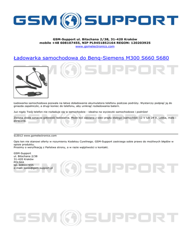 GSM-Support ul. Bitschana 2/38, 31-420 Kraków mobile +48 608107455, NIP PL9451852164 REGON: 120203925 www.gsmelectronics.com Ładowarka samochodowa do Benq-Siemens M300 S660 S680 Ładowarka samochodowa pozwala na łatwe doładowanie akumulatora telefonu podczas podróży. Wystarczy podpiąć ją do gniazda zapalniczki, a drugi koniec do telefonu, aby uniknąć rozładowania baterii. Już nigdy Twój telefon nie rozładuje się w samochodzie - idealna na wycieczki samochodowe i podróże! Zielona dioda oznacza gotowość ładowania. Może być zasilana z sieci prądu stałego (samochód) 12 V lub 24 V. Lekka, mała i poręczna. ©2012 www.gsmelectronics.com Opis ten nie stanowi oferty w rozumieniu Kodeksu Cywilnego. GSM-Support zastrzega sobie prawo do możliwych błędów w opisie produktu. Prosimy o weryfikację z Państwa strony, a w razie wątpliwości o kontakt. GSM-Support ul. Bitschana 2/38 31-420 Kraków POLSKA tel. 608107455 e-mail: [email protected] Powered by TCPDF (www.tcpdf.org)