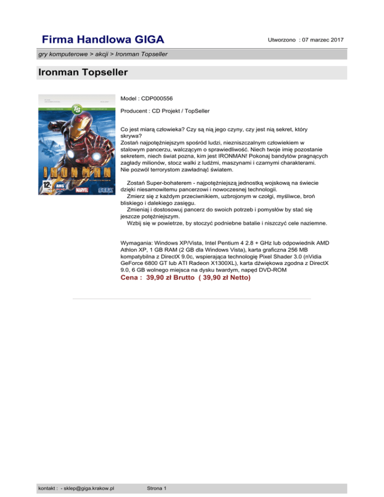 Firma Handlowa GIGA Utworzono : 07 marzec 2017 gry komputerowe > akcji > Ironman Topseller Ironman Topseller Model : CDP000556 Producent : CD Projekt / TopSeller Co jest miarą człowieka? Czy są nią jego czyny, czy jest nią sekret, który skrywa? Zostań najpotężniejszym spośród ludzi, niezniszczalnym człowiekiem w stalowym pancerzu, walczącym o sprawiedliwość. Niech twoje imię pozostanie sekretem, niech świat pozna, kim jest IRONMAN! Pokonaj bandytów pragnących zagłady milionów, stocz walki z ludźmi, maszynami i czarnymi charakterami. Nie pozwól terrorystom zawładnąć światem. Zostań Super-bohaterem - najpotężniejszą jednostką wojskową na świecie dzięki niesamowitemu pancerzowi i nowoczesnej technologii. Zmierz się z każdym przeciwnikiem, uzbrojonym w czołgi, myśliwce, broń bliskiego i dalekiego zasięgu. Zmieniaj i dostosowuj pancerz do swoich potrzeb i pomysłów by stać się jeszcze potężniejszym. Wzbij się w powietrze, by stoczyć podniebne batalie i niszczyć cele naziemne. Wymagania: Windows XP/Vista, Intel Pentium 4 2.8 + GHz lub odpowiednik AMD Athlon XP, 1 GB RAM (2 GB dla Windows Vista), karta graficzna 256 MB kompatybilna z DirectX 9.0c, wspierająca technologię Pixel Shader 3.0 (nVidia GeForce 6800 GT lub ATI Radeon X1300XL), karta dźwiękowa zgodna z DirectX 9.0, 6 GB wolnego miejsca na dysku twardym, napęd DVD-ROM Cena : 39,90 zł Brutto ( 39,90 zł Netto) kontakt : - [email protected] Strona 1