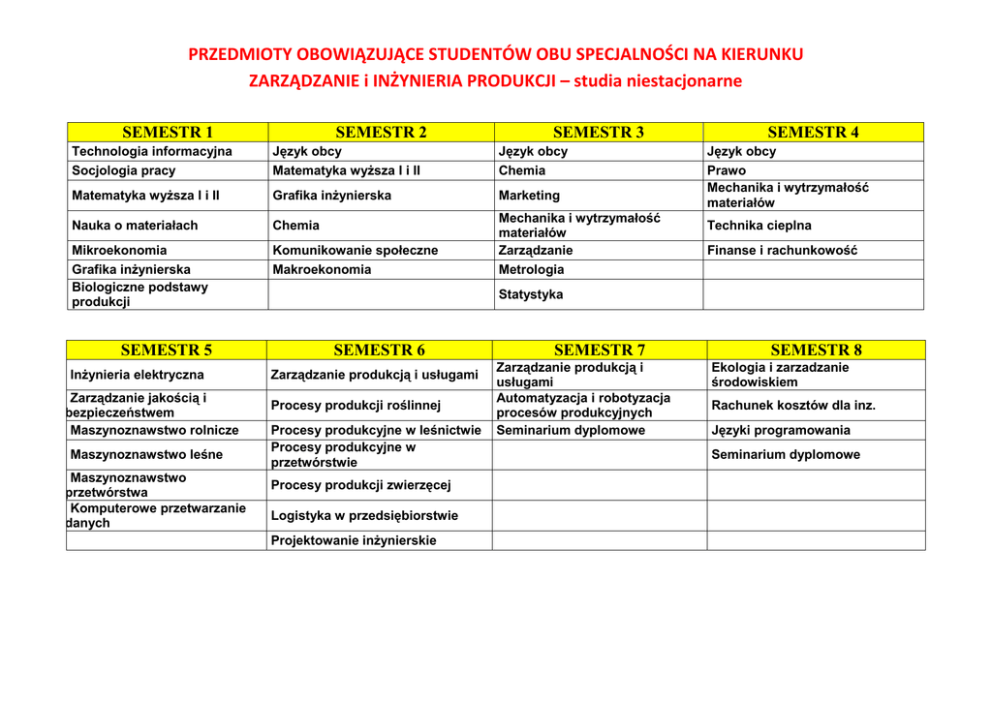 PRZEDMIOTY OBOWIĄZUJĄCE STUDENTÓW OBU SPECJALNOŚCI NA KIERUNKU ZARZĄDZANIE i INŻYNIERIA PRODUKCJI – studia niestacjonarne SEMESTR 1 SEMESTR 2 SEMESTR 3 Technologia informacyjna Socjologia pracy Język obcy Matematyka wyŜsza I i II Język obcy Chemia Matematyka wyŜsza I i II Grafika inŜynierska Marketing Nauka o materiałach Chemia Mikroekonomia Grafika inŜynierska Biologiczne podstawy produkcji Komunikowanie społeczne Makroekonomia SEMESTR 5 InŜynieria elektryczna Zarządzanie jakością i bezpieczeństwem Maszynoznawstwo rolnicze Maszynoznawstwo leśne Maszynoznawstwo przetwórstwa Komputerowe przetwarzanie danych Mechanika i wytrzymałość materiałów Zarządzanie Metrologia SEMESTR 4 Język obcy Prawo Mechanika i wytrzymałość materiałów Technika cieplna Finanse i rachunkowość Statystyka SEMESTR 6 Zarządzanie produkcją i usługami Procesy produkcji roślinnej Procesy produkcyjne w leśnictwie Procesy produkcyjne w przetwórstwie Procesy produkcji zwierzęcej Logistyka w przedsiębiorstwie Projektowanie inŜynierskie SEMESTR 7 Zarządzanie produkcją i usługami Automatyzacja i robotyzacja procesów produkcyjnych Seminarium dyplomowe SEMESTR 8 Ekologia i zarzadzanie środowiskiem Rachunek kosztów dla inz. Języki programowania Seminarium dyplomowe PRZEDMIOTY OBOWIĄZUJĄCE STUDENTÓW NA SPECJALNOŚCIACH ZARZĄDZANIE I ORGANIZACJA PRODUKCJI SEMESTR 7 Ekonometria Systemy informatyczne wspomagania produkcji Rynek maszyn rolniczych i leśnych SEMESTR 8 Rynek energii INŻYNIERIA PRODUKCJI SEMESTR 7 Eksploatacja techniczna InŜynieria systemów Przechowalnictwo SEMESTR 8 Technologie energetyki odnawialnej