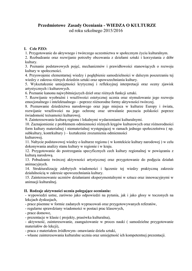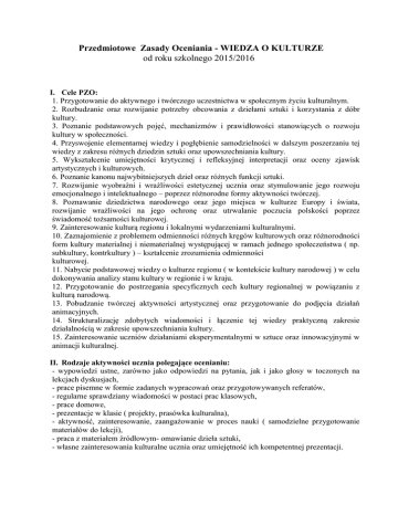 Przedmiotowe Zasady Oceniania - WIEDZA O KULTURZE od roku szkolnego 2015/2016 I. Cele PZO: 1. Przygotowanie do aktywnego i twórczego uczestnictwa w społecznym życiu kulturalnym. 2. Rozbudzanie oraz rozwijanie potrzeby obcowania z dziełami sztuki i korzystania z dóbr kultury. 3. Poznanie podstawowych pojęć, mechanizmów i prawidłowości stanowiących o rozwoju kultury w społeczności. 4. Przyswojenie elementarnej wiedzy i pogłębienie samodzielności w dalszym poszerzaniu tej wiedzy z zakresu różnych dziedzin sztuki oraz upowszechniania kultury. 5. Wykształcenie umiejętności krytycznej i refleksyjnej interpretacji oraz oceny zjawisk artystycznych i kulturowych. 6. Poznanie kanonu najwybitniejszych dzieł oraz różnych funkcji sztuki. 7. Rozwijanie wyobraźni i wrażliwości estetycznej ucznia oraz stymulowanie jego rozwoju emocjonalnego i intelektualnego – poprzez różnorodne formy aktywności twórczej. 8. Poznawanie dziedzictwa narodowego oraz jego miejsca w kulturze Europy i świata, rozwijanie wrażliwości na jego ochronę oraz utrwalanie poczucia polskości poprzez świadomość tożsamości kulturowej. 9. Zainteresowanie kulturą regionu i lokalnymi wydarzeniami kulturalnymi. 10. Zaznajomienie z problemem odmienności różnych kręgów kulturowych oraz różnorodności form kultury materialnej i niematerialnej występującej w ramach jednego społeczeństwa ( np. subkultury, kontrkultury ) – kształcenie zrozumienia odmienności kulturowej. 11. Nabycie podstawowej wiedzy o kulturze regionu ( w kontekście kultury narodowej ) w celu dokonywania analizy stanu kultury w regionie i w kraju. 12. Przygotowanie do postrzegania specyficznych cech kultury regionalnej w powiązaniu z kulturą narodową. 13. Pobudzanie twórczej aktywności artystycznej oraz przygotowanie do podjęcia działań animacyjnych. 14. Strukturalizację zdobytych wiadomości i łączenie tej wiedzy praktyczną zakresie działalnością w zakresie upowszechniania kultury. 15. Zainteresowanie uczniów działaniami eksperymentalnymi w sztuce oraz innowacyjnymi w animacji kulturalnej. II. Rodzaje aktywności ucznia polegające ocenianiu: - wypowiedzi ustne, zarówno jako odpowiedzi na pytania, jak i jako głosy w toczonych na lekcjach dyskusjach, - prace pisemne w formie zadanych wypracowań oraz przygotowywanych referatów, - regularne sprawdziany wiadomości w postaci prac klasowych, - prace domowe, - prezentacje w klasie ( projekty, prasówka kulturalna), - aktywność, zainteresowanie, zaangażowanie w proces nauki ( samodzielne przygotowanie materiałów do lekcji), - praca z materiałem źródłowym- omawianie dzieła sztuki, - własne zainteresowania kulturalne ucznia oraz umiejętność ich kompetentnej prezentacji. III.Sposoby sprawdzania postępów ucznia: - odpowiedzi ustne, - prace pisemne w różnej formie, - aktywność na lekcji, - praca w grupie, - długoterminowe prace projektowe, - prace domowe o różnym charakterze oceniane wyrywkowo, - formy pracy twórczej w domu, - udział ucznia w konkursach i olimpiadach artystycznych (zdobycie jednego z pierwszych miejsc lub przejście do następnego etapu równe jest ocenie celującej, za sam udział w jednej z tych form uczeń uzyskuje ocenę bardzo dobrą), - aktywny udział ucznia w życiu kulturalnym szkoły lub miasta. IV. Kryteria oceniania odpowiedzi ustnej, pisemnej, referatu: Kryteria uzyskiwania poszczególnych ocen : a) niedostateczny uczeń: - nie opanował niezbędnego minimum podstawowych wiadomości i umiejętności określonych programem nauczania wiedzy o kulturze w danej klasie, a braki w wiadomościach uniemożliwiają dalsze zdobywanie wiedzy z tego przedmiotu (klasa z rozszerzeniem), - nie jest w stanie nawet przy pomocy nauczyciela rozwiązać zadania o niewielkim (elementarnym) stopniu trudności, - opuszcza zajęcia lekcyjne - narusza podstawowe normy i zasady kultury, - utrudnia prowadzenie zajęć lekcyjnych nauczycielowi i uczniom. b) dopuszczający uczeń : odpowiada na proste pytania dotyczące historii kultury współczesnych zjawisk współczesnych w kulturze, rozpoznaje okresy w dziejach kultury i zachodzące w nich zmiany, wykazuje się podstawową umiejętnością odczytywania wiadomości ze źródeł. w wypowiedziach pojawiają się błędy merytoryczne c) dostateczny uczeń : wykazuje znajomość i zrozumienie istotnych aspektów kultury w historii Polski i świata w zakresie programu nauczania, wykorzystuje wiedzę w celu opisania zjawisk kulturowych, próbuje wybierać i łączyć informacje pochodzące z różnych źródeł, konstruuje wypowiedzi ustne i pisemne, wewnętrznie uporządkowane, z właściwym informacji i formułuje podstawowe wnioski d) dobry uczeń : wykazuje ogólną wiedzę w ramach programu nauczania, w zakresie niektórych zagadnień prezentuje wiedzę szczegółową i zrozumienie poruszonych problemów, używa swej wiedzy do opisu zjawisk kulturowych, podejmuje próby samodzielnych dociekań, wymagających nieznacznej korekty, stosuje w praktyce zasady sprawnego komunikowania się uczeń w pełni przedstawia temat, wykazuje się poprawnością merytoryczną e) bardzo dobry uczeń : wykazuje wiedzę ogólną i szczegółową w zakresie programu nauczania, wybiera, porządkuje i rozwija informacje w celu skonstruowania dobrze ułożonej wypowiedzi, z wykorzystaniem pojęć kulturowych, odejmuje samodzielne dociekania, ujawnia kreatywność i pomysłowość w prezentacji zjawisk, uczeń wyczerpująco przedstawia temat, wykazuje się szczegółowością w prezentowaniu faktów i wydarzeń, swobodnie posługuje się wiedzą i materiałami źródłowymi do interpretacji zagadnień, wykazuje się umiejętnością oceniania i prognozowania zjawisk. f) celujący uczeń : wykazuje wiedzę ogólną i szczegółową w zakresie programu nauczania, osiąga sukcesy w olimpiadzie artystycznej lub konkursach artystycznych, jest w swoich dociekaniach samodzielny i niezależny, wykonuje zadania wykr