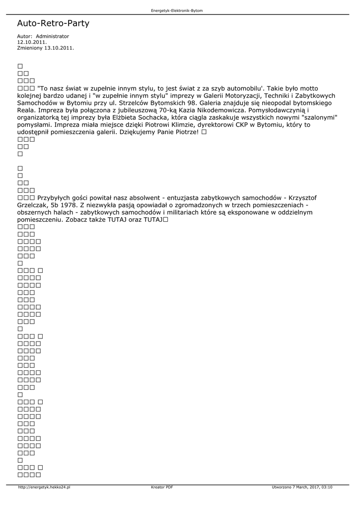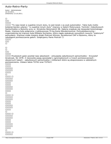 Energetyk-Elektronik-Bytom Auto-Retro-Party Autor: Administrator 12.10.2011. Zmieniony 13.10.2011. "To nasz świat w zupełnie innym stylu, to jest świat z za szyb automobilu'. Takie było motto kolejnej bardzo udanej i "w zupełnie innym stylu" imprezy w Galerii Motoryzacji, Techniki i Zabytkowych Samochodów w Bytomiu przy ul. Strzelców Bytomskich 98. Galeria znajduje się nieopodal bytomskiego Reala. Impreza była połączona z jubileuszową 70-ką Kazia Nikodemowicza. Pomysłodawczynią i organizatorką tej imprezy była Elżbieta Sochacka, która ciągla zaskakuje wszystkich nowymi "szalonymi" pomysłami. Impreza miała miejsce dzięki Piotrowi Klimzie, dyrektorowi CKP w Bytomiu, który to udostępnił pomieszczenia galerii. Dziękujemy Panie Piotrze! Przybyłych gości powitał nasz absolwent - entuzjasta zabytkowych samochodów - Krzysztof Grzelczak, 5b 1978. Z niezwykła pasją opowiadał o zgromadzonych w trzech pomieszczeniach obszernych halach - zabytkowych samochodów i militariach które są eksponowane w oddzielnym pomieszczeniu. Zobacz także TUTAJ oraz TUTAJ http://energetyk.hekko24.pl Kreator PDF Utworzono 7 March, 2017, 03:10 Energetyk-Elektronik-Bytom Zaproszeni goście usiedli przy stołach, które były rozmieszczone wśród zabytkowych samochodów. Specyficzną atmosferę dopełniały stroje w stylu retro... panie miały odpowiednie kreacje i kapelusze a panowie fraki i cylindry! Również koncert piosenek w wykonaniu Bożeny Związek z mężem, był w stylu retro- no może nie całkiem, ale z lat 70 i 80. Przerywnikiem imprezy był film z życia klubu przygotowany przez jubilata-Kazika. Przybyłych na imprezę przywitała Basia składając jednocześnie Kaziowi najlepsze życzenia urodzinowe wręczając mu specjalnie przygotowane na tą okazję laurki. Potem były życzenia przybyłych gości i ... wspólna biesiada. http://energetyk.hekko24.pl Kreator PDF Utworzono 7 March, 2017, 03:10 Energetyk-Elektronik-Bytom Niewątpliwą atrakcją był wniesiony duży tort z płonącą "fontanną" który następnie był sprawiedliwie podzielony i wszyscy mieli okazję poznać jego walory smakowe. Naprawdę był wyśmienity! Piotr Mankiewicz przyniósł i wręczył wszystkim nowe kalendarze na rok 2012. W międzyczasie kolejni goście składali Kazikowi życzenia. W pewnym momencie Kazik tak się wzruszył dziękując za życzenia... nie mógł dalej mówić tylko gestem wszystkim podziękował co zostało przyjęte aplauzem! http://energetyk.hekko24.pl Kreator PDF Utworzono 7 March, 2017, 03:10 Energetyk-Elektronik-Bytom No i zaczęła się zabawa. Wszyscy tańczyli wśród starych samochodów; coś zupełnie niesamowitego i niepowtarzalnego. W takiej scenerii nikt z obecnych jeszcze nie tańczył! A bawili się " W zupełnie innym stylu, jakby w świecie z za szyb automobilu" Zdjęcie zbiorowe uczestników imprezy AUTO-RETRO-PARTY Bardzo serdecznie dziękujemy Panu Piotrowi Klimzie, kochanemu Wiesiowi Wiśniewskiemu, Piotrowi Mankiewiczowi oraz Heniowi Wójcikowi z żoną Lodzią za wydatną pomoc przy organizacji imprezy! Więcej zdjęć możesz zobaczyć w naszej Galerii Zdjęć TUTAJ http://energetyk.hekko24.pl Kreator PDF Utworzono 7 March, 2017, 03:10 Energetyk-Elektronik-Bytom Tekst: Krystian Czerny Zdjęcia: Danuta Sochacka Kucharczyk Krystian Czerny Wiesław Lipka Stanisław Kuszpit http://energetyk.hekko24.pl Kreator PDF Utworzono 7 March, 2017, 03:10