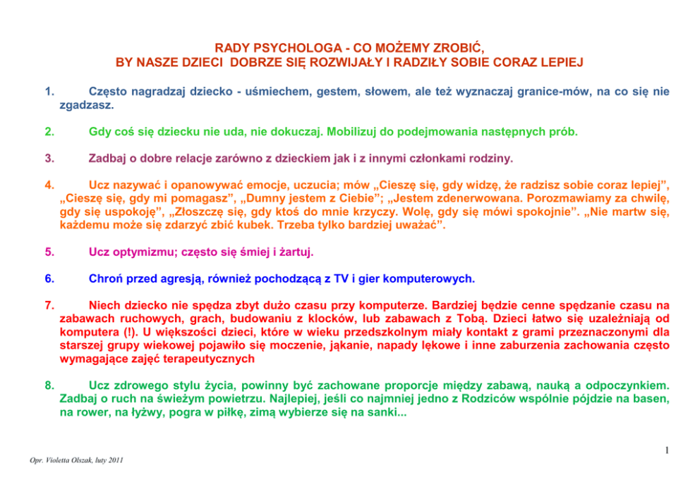 RADY PSYCHOLOGA - CO MOŻEMY ZROBIĆ, BY NASZE DZIECI DOBRZE SIĘ ROZWIJAŁY I RADZIŁY SOBIE CORAZ LEPIEJ 1. Często nagradzaj dziecko - uśmiechem, gestem, słowem, ale też wyznaczaj granice-mów, na co się nie zgadzasz. 2. Gdy coś się dziecku nie uda, nie dokuczaj. Mobilizuj do podejmowania następnych prób. 3. Zadbaj o dobre relacje zarówno z dzieckiem jak i z innymi członkami rodziny. 4. Ucz nazywać i opanowywać emocje, uczucia; mów „Cieszę się, gdy widzę, że radzisz sobie coraz lepiej”, „Cieszę się, gdy mi pomagasz”, „Dumny jestem z Ciebie”; „Jestem zdenerwowana. Porozmawiamy za chwilę, gdy się uspokoję”, „Złoszczę się, gdy ktoś do mnie krzyczy. Wolę, gdy się mówi spokojnie”. „Nie martw się, każdemu może się zdarzyć zbić kubek. Trzeba tylko bardziej uważać”. 5. Ucz optymizmu; często się śmiej i żartuj. 6. Chroń przed agresją, również pochodzącą z TV i gier komputerowych. 7. Niech dziecko nie spędza zbyt dużo czasu przy komputerze. Bardziej będzie cenne spędzanie czasu na zabawach ruchowych, grach, budowaniu z klocków, lub zabawach z Tobą. Dzieci łatwo się uzależniają od komputera (!). U większości dzieci, które w wieku przedszkolnym miały kontakt z grami przeznaczonymi dla starszej grupy wiekowej pojawiło się moczenie, jąkanie, napady lękowe i inne zaburzenia zachowania często wymagające zajęć terapeutycznych 8. Ucz zdrowego stylu życia, powinny być zachowane proporcje między zabawą, nauką a odpoczynkiem. Zadbaj o ruch na świeżym powietrzu. Najlepiej, jeśli co najmniej jedno z Rodziców wspólnie pójdzie na basen, na rower, na łyżwy, pogra w piłkę, zimą wybierze się na sanki... 1 Opr. Violetta Olszak, luty 2011 9. Zabieraj dziecko na spacery; nawet podczas wyjścia po pieczywo zwracaj mu uwagę na otaczające kolory, kształty, zapachy, smaki. 10. Zadbaj o dobre samopoczucie zarówno swoje jak dziecka. Szczęśliwa Mama i szczęśliwy Tato ma więcej cierpliwości dla swojego dziecka. Szczęśliwe dziecko będzie łatwiej uczyło się i radziło sobie w różnych sytuacjach. 11. Zapraszaj do wspólnych zajęć, np. do wspólnego majsterkowania, sprzątania, lepienia pierogów, robienia ciastek; takie wspólne zajęcia z Rodzicami są dla dzieci bardzo cenne. Nie wyręczaj. Taka nauka dla dziecka jest bardzo cenna. Chwal za podejmowane próby, to efekty będą coraz lepsze. 12. Zapewnij dziecku wiele okazji do różnorodnej zabawy i pracy twórczej – stwórz warunki do rysowania, malowania, lepienia, cięcia, przyklejania. 13. Jak najwcześniej oswajaj dziecko z książką, zabieraj na wyprawy do biblioteki, czytelni, księgarni. Zadbaj, by miało swoją ulubioną książkę. Czytaj dziecku na dobranoc. 14. Szanuj indywidualność dziecka, ucz je samodzielności. Mobilizuj, ale nie wyręczaj. 15. Dotrzymuj obietnic i zobowiązań. Jeśli coś stanęło na ich drodze, powiedz to dziecku. 16. Jeśli Rodzice mają różne zdanie, to lepiej żeby dzieci nie słyszały sporów i kłótni, bo boleśnie to przeżywają. Poza dzieckiem ustalcie jedno stanowisko wspólne. Jeśli jedna z osób nakłada jakieś ograniczenia, to ta osoba powinna je zdjąć. 17. Kupując zabawki unikaj lalek typu Barbie. Wybieraj bobasy, misie dobre do przytulania i przebierania. Naukowcy doszukują się związków wystąpienia zaburzeń żywienia typu anoreksja, bulimia u dojrzewających dziewczynek, które w dzieciństwie bawiły się Barbie. opr. Violetta Olszak, luty 2010 2 Opr. Violetta Olszak, luty 2011