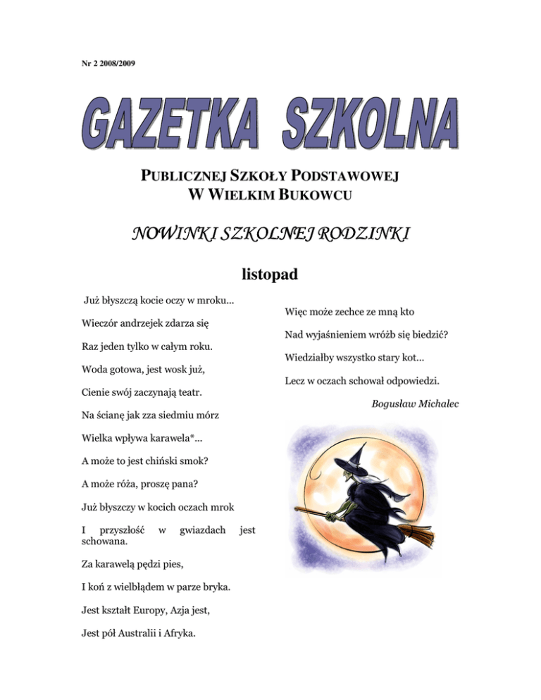 Nr 2 2008/2009 PUBLICZNEJ SZKOŁY PODSTAWOWEJ W WIELKIM BUKOWCU NOWINKI SZKOLNEJ RODZINKI listopad Już błyszczą kocie oczy w mroku... Więc może zechce ze mną kto Wieczór andrzejek zdarza się Nad wyjaśnieniem wróżb się biedzić? Raz jeden tylko w całym roku. Wiedziałby wszystko stary kot... Woda gotowa, jest wosk już, Lecz w oczach schował odpowiedzi. Cienie swój zaczynają teatr. Bogusław Michalec Na ścianę jak zza siedmiu mórz Wielka wpływa karawela*... A może to jest chiński smok? A może róża, proszę pana? Już błyszczy w kocich oczach mrok I przyszłość schowana. w gwiazdach Za karawelą pędzi pies, I koń z wielbłądem w parze bryka. Jest kształt Europy, Azja jest, Jest pół Australii i Afryka. jest Szkolna dyskoteka „POZNAJMY SIĘ” 30 października o godz1500 rozpoczęła się pierwsza w tym roku szkolnym dyskoteka. Na głównym holu p. dyrektor Katarzyna Błaszak i organizatorki - M. Pater i A. Lubawska powitały przybyłych uczniów. Na pierwszej dyskotece nastąpiło zaprzysiężenie przedstawiciesli Samorządu Uczniowskiego, którzy zostali wybrani w wolnych wyborach przez społeczność szkolną wybrane uczennice D. Świeczkowska, Patrycja Gapa i Patrycja Milkowska ślubowały przed swoimi kolegami: PRACOWAĆ DLA DOBRA SZKOŁY, ZASPAKAJAĆ POTRZEBY UCZNIÓW, GODNIE REPREZENTOWAĆ SWOICH WYBORCÓW I DBAĆ O HONOR SZKOŁY. Do zabawy zaproszono klasę IV. Klasy V i VI przygotowały zadania dla swoich młodszych kolegów. Po ich wykonaniu zostali „uczestnikami dyskoteki szkolnej.” • Konsumowanie czegoś kwaśnego ze „słodką minką”- owoc „rajskie jabłko” • Łamańce językowe-Karol Lorek........ - powtórzenie • Moczenie nosa w wodzie i mącesłodki poczęstunek. • Smaczne witaminki-jabłko na sznurku. • Święcenie wodą przez panią dyrektor. Po wykonaniu zadań wszyscy zostali przyjęci do braci dyskotekowej zabawy. Dyskoteki cieszą się wielką popularnością wśród uczniów. Konkursy dla klasy IV stały się tradycją naszej szkoły. Zadania mobilizują klasy starsze do szukania pomysłów i twórczego działania zarządu SU. Aktywizują uczniów i są doskonałą formą spędzania wolnego czasu Uczniowie biorą współodpowiedzialność za zorganizowanie dyskoteki szkolnej zgodnie z jej regulaminem. Uczniom naszej szkoły przygrywali starsi koledzy z gimnazjum: A.Gracz i Ł. Kowalski. „Święto kartofla” Dnia 3 października dzieci z oddziału zerowego PSP w Wielkim Bukowcu wybrały się do gospodarstwa p. Mazurowskich w Wielkim Bukowcu gdzie spędziły miłe przedpołudnie. W gospodarstwie obejrzały zwierzęta hodowlane, karmiły je oraz głaskały. Nazywały maszyny wykorzystywane w gospodarstwie. Przedszkolaki były na pastwisku i tam dowiedziały się o karmieniu i dojeniu krów. Na polu widziały kopiec buraków przywieziony z pola. Wszyscy chętnie przyglądali się pracy rolnika i z zaciekawieniem słuchali opowiadań. Gospodarz, brat p. Joanny pokazał i powiedział, jak przechowuje się ziemniaki na zimę. Dzieci samodzielnie owijały ziemniaki w folię, aby upiec je na ognisku. Ponadto wysłuchali informacji dotyczących tradycji zakończenia wykopek na Kociewiu. Następnie ziemniaki przysypano gorącym popiołem i przedszkolaki w czasie oczekiwania na pieczone danie bawiły się w znane zabawy „gorący kartofel, uciekaj myszko i chodzi lisek”. Gdy ziemniaki się upiekły, wszyscy zasiedli do stołu i spożywali wspólny posiłek. Chipsy, czekoladki, cukierki i ciasteczka znikały z talerzyków równie szybko jak pieczone kartofelki. Na zakończenie przedszkolaki zaśpiewały piosenkę, posprzątały po sobie i wróciły do szkoły. W drodze powrotnej opowiadały wrażenia z odbytej wycieczki. Małgorzata Pater 2 Akcja „ CIUSZEK” Dając czasami niewiele, dobre słowo i zrozumienieczynimy się nawzajem szczęśliwymi... Tradycyjnie na przełomie miesiąca września i października Samorząd Uczniowski pod opieką Alicja Lubawskiej i Małgorzaty Pater zorganizował przed nadchodzącą zimą akcję „Ciuszek”. Biorąc pod uwagę trudną sytuację materialną niektórych rodzin szkolnych zaczęto gromadzić używaną, czystą odzież w specjalnie do tego wyznaczonym pomieszczeniu. Zbiórka odzieży i obuwia przebiegała sprawnie, bo zaangażowało się w nią wiele osób wrażliwych na potrzeby drugiego człowieka. W dniu otwartym w szkole zorganizowano bezpłatny kiermasz odzieży używanej, który cieszył się dużym zainteresowaniem rodziców i uczniów. Pozostałą odzież przekazano do GOPS w Skórczu. Prowadzona kolejny raz akcja wykazała, że niesienie pomocy innym uważamy za swój moralny obowiązek. Dziękujemy darczyńcom! Alicja Lubawska Spotkanie integracyjne dzieci z oddziału zerowego Dnia 17.10.2008r. dzieci wraz z wychowawcami i rodzicami odwiedziły „Mini Zoo” w pobliskim Grabowie. Miały okazję zobaczyć zwierzęta egzotyczne takie jak: kangury i wielbłąda, zwierzęta z gospodarstwa domowego np. kozy, konie, świnki i różne gatunki królików oraz ptaki takie jak: kury, strusie, papużki itp. Mogły pojeździć sobie na kucyku. Na placu zabaw przygotowanym dla najmłodszych mogły się pobawić. Dzieci zjadły kiełbaski upieczone na ognisku i przygotowane przez rodziców smakołyki. Mamy zakupiły dzieciom upominki w sklepiku gospodyni. Mamusiom spodobało się to miejsce i na pewno wrócą tu na wiosnę lub w lecie, jak zwierzęta będą miały młode lub pozostaną na dłużej wynajmując domki letniskowe na terenie „mini zoo”. Po powrocie z wycieczki dzieci rysowały zwierzęta, które zobaczyły i karmiły koniczynką. Pytały czy pojedziemy tam jeszcze raz na wiosnę. Małgorzata Pater W Nadleśnictwie w Lubichowie 20 października 2008r. klasy I i IV wraz ze swoimi wychowawczyniami p. Alicją Lubawską i p. Dorotą Ciesielską były w Nadleśnictwie w Lubichowie. Tego dnia dzięki środkom finansowym z Unii Europejskiej odbywały się tam tzw. „z