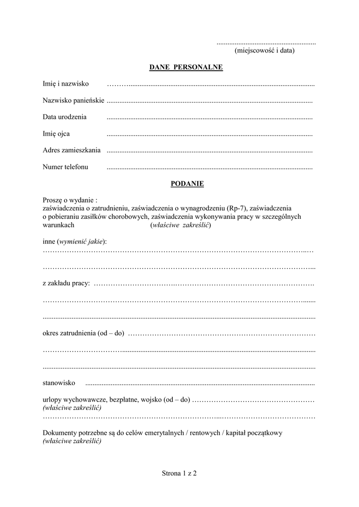 ....................................................... (miejscowość i data) DANE PERSONALNE Imię i nazwisko ………....................................................................................................... Nazwisko panieńskie .................................................................................................................. Data urodzenia .................................................................................................................. Imię ojca .................................................................................................................. Adres zamieszkania .................................................................................................................. Numer telefonu .................................................................................................................. PODANIE Proszę o wydanie : zaświadczenia o zatrudnieniu, zaświadczenia o wynagrodzeniu (Rp-7), zaświadczenia o pobieraniu zasiłków chorobowych, zaświadczenia wykonywania pracy w szczególnych warunkach (właściwe zakreślić) inne (wymienić jakie): ………………………………………………………………………………………………..… …………………………………………………………………………………………………... z zakładu pracy: …………………………….…………………………………………………. ………………………………………………………………………………………………....... ....................................................................................................................................................... okres zatrudnienia (od – do) …………………………………………………………………… ……………………………........................................................................................................... ....................................................................................................................................................... stanowisko ............................................................................................................................... urlopy wychowawcze, bezpłatne, wojsko (od – do) …………………………………………… (właściwe zakreślić) ………………………………………………………………...………………………………… Dokumenty potrzebne są do celów emerytalnych / rentowych / kapitał początkowy (właściwe zakreślić) Strona 1 z 2 Dokumenty proszę przesłać pocztą / odbiór osobisty (właściwe zakreślić). Do wniosku załączam: 1. ……………………………………………. 2. ……………………………………………. 3. ……………………………………………. Wyrażam zgodę na przetwarzanie moich danych osobowych zawartych we wniosku dla potrzeb niezbędnych dla realizacji sprawy zgodnie z ustawę o ochronie danych osobowych z dnia 29.08.1997 r. (Dz.U. 2002 r. Nr 101 poz. 926 z późn. zm.). .................................................................... ( podpis składającego wniosek) Uwaga: Prosimy o czytelne wypełnienie wszystkich rubryk. Brak istotnych danych może uniemożliwić pozytywne załatwienie podania. Strona 2 z 2