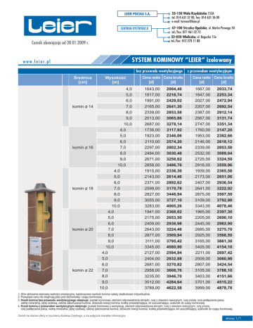 LEIER POLSKA S.A. CENTRUM DYSTRYBUCJI Cennik obowi¹zuje od 28.01.2009 r. 33-150 Wola Rzêdziñska 155A tel. 014 631 37 00, fax: 014 631 36 00 e-mail: [email protected] 47-100 Strzelce Opolskie, ul. Marka Prawego 50 tel./fax: 077 461 32 73 32-020 Wieliczka, ul. Bogucka 15a tel./fax: 012 278 11 88 SYSTEM KOMINOWY ”LEIER” izolowany w w w . l e i e r. p l bez przewodu wentylacyjnego Œrednica [cm] komin komin komin komin komin Wysokoœæ [m] Cena netto Cena brutto [z³] [z³] 4,0 1643,00 2004,46 1667,00 2033,74 5,0 1817,00 2216,74 1847,00 2253,34 6,0 1991,00 2429,02 2027,00 2472,94 7,0 2165,00 2641,30 2207,00 2692,54 8,0 2339,00 2853,58 2387,00 2912,14 9,0 2513,00 3065,86 2567,00 3131,74 10,0 2687,00 3278,14 2747,00 3351,34 4,0 1736,00 2117,92 1760,00 2147,20 5,0 1923,00 2346,06 1953,00 2382,66 6,0 2110,00 2574,20 2146,00 2618,12 7,0 2297,00 2802,34 2339,00 2853,58 8,0 2484,00 3030,48 2532,00 3089,04 9,0 2671,00 3258,62 2725,00 3324,50 10,0 2858,00 3486,76 2918,00 3559,96 4,0 1915,00 2336,30 1939,00 2365,58 5,0 2143,00 2614,46 2173,00 2651,06 6,0 2371,00 2892,62 2407,00 2936,54 7,0 2599,00 3170,78 2641,00 3222,02 8,0 2827,00 3448,94 2875,00 3507,50 9,0 3055,00 3727,10 3109,00 3792,98 10,0 14 16 18 3283,00 4005,26 3343,00 4078,46 4,0 1941,00 2368,02 1965,00 2397,30 5,0 2175,00 2653,50 2205,00 2690,10 6,0 2409,00 2938,98 2445,00 2982,90 7,0 2643,00 3224,46 2685,00 3275,70 8,0 2877,00 3509,94 2925,00 3568,50 9,0 3111,00 3795,42 3165,00 3861,30 10,0 3345,00 4080,90 3405,00 4154,10 4,0 2127,00 2594,94 2211,00 2697,42 5,0 2404,00 2932,88 2509,00 3060,98 6,0 2681,00 3270,82 2807,00 3424,54 7,0 2958,00 3608,76 3105,00 3788,10 8,0 3235,00 3946,70 3403,00 4151,66 9,0 3512,00 4284,64 3701,00 4515,22 10,0 3789,00 4622,58 3999,00 4878,78 20 22 Cena netto Cena brutto [z³] [z³] z przewodem wentylacyjnym 1. W/w obliczenia stanowi¹ wartoœci orientacyjne, ka¿dorazowo wartoœæ komina nale¿y skalkulowaæ indywidualnie. 2. Powy¿sze ceny nie obejmuj¹ p³yty pod obmurówkê i czapy kominowej. 3. Koszt komina bez przewodu wentylacyjnego obejmuje: pustaki kominowe, element odprowadzania skroplin, rurê z otworem rewizyjnym, rurê prosta, rurê pod³¹czenia pieca, we³nê mineraln¹, p³ytê czo³ow¹, os³onê zakoñczenia komina, drzwiczki rewizji komina, kratkê przewietrzaj¹ca, kit uszczelniaj¹cy, szalunek do czapy kominowej. 4. Koszt komina z przewodem wentylacyjnym obejmuje: pustaki kominowe z wentylacj¹, element odprowadzania skroplin, rurê z otworem rewizyjnym, rurê prosta, rurê pod³¹czenia pieca, we³nê mineralna, p³ytê czo³ow¹, os³onê zakoñczenia komina, drzwiczki rewizji komina, kratkê przewietrzaj¹ca, kit uszczelniaj¹cy, szalunek do czapy kominowej. Cennik nie stanowi oferty w rozumieniu Kodeksu Cywilnego, a ma wy³¹cznie charakter informacyjny. strona 1/1