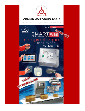 CENNIK WYROBÓW 1/2015 WAŻNY OD 29 CZERWCA 2015 ROKU; CENY NETTO (OBOWIĄZUJE PODATEK VAT Cennik wyrobów 1/2015 2 z 32 LUBELSKIE FABRYKI WAG FAWAG S.A. I SYSTEMY WAGOWE - SMARTwag II WAGI SKLEPOWE 1. Wagi kalkulacyjne 2. Wagi bez funkcji kalkulacyjnych 3. Wagi pomostowe III WAGI OSOBOWO-LEKARSKIE I NIEMOWLĘCE IV WAGI POCZTOWE 1. Wagi listowe 2. Wagi paczkowe V WAGI TECHNICZNE I LICZĄCE 1. Wagi techniczne TM 2. Wagi techniczne TM Plus 3. Wagi liczące VI WAGI POMOSTOWE 1. Wagi 1-przetwornikowe TP 2. Wagi 1-przetwornikowe TM 3. Wagi 4-przetwornikowe TP ECO i ECO-N 4. Wagi 4-przetwornikowe TM ECO i ECO-N 5. Wagi 4-przetwornikowe TP 6. Wagi 4-przetwornikowe TM 7. Wagi najazdowe TP 8. Wagi najazdowe TM 9. Wagi paletowe i płozowe TP 10. Wagi paletowe i płozowe TM VII WAGI DLA PRZEMYSŁU MIĘSNEGO 1. Wagi 4-przetwornikowe z otwieranym pomostem TP 2. Wagi 4-przetwornikowe z otwieranym pomostem TM 3. Wagi inwentarzowe TP 4. Wagi inwentarzowe TM 5. Waga hakowa do ważenia półtusz TP 6. Waga hakowa do ważenia półtusz TM 7. Waga podwieszana kolejkowa do ważenia półtusz TP 8. Waga podwieszana kolejkowa do ważenia półtusz TM VIII WAGI DO WYZNACZANIA SKROBI IX WAGI DO WAŻENIA ZWIERZĄT X WAGI SAMOCHODOWE 1. Wagi stacjonarne z pomostami betonowymi 2. Wagi przenośne z pomostami stalowymi 3. Wagi mobilne XI WAGI ZBIORNIKOWE XII WAGI AUTOMATYCZNE XIII WAGI DO KONTROLI TOWARÓW PACZKOWANYCH XIV ZESTAWY ETYKIETUJĄCE XV PROGRAMY KOMPUTEROWE XVI WYPOSAŻENIE DODATKOWE XVII MATERIAŁY EKSPLOATACYJNE XVIII MIERNIKI I TERMINALE WAGOWE XIX USŁUGI TRANSPORTOWE Cennik wyrobów 1/2015 3 z 32 5 6 6 6 6 7 7 7 7 8 8 8 8 9 9 10 11 12 13 14 15 16 17 17 18 18 19 19 20 20 20 21 21 21 22 23 23 24 25 26 26 27 27 28 28 28 29-30 31 LUBELSKIE FABRYKI WAG FAWAG S.A. Cennik wyrobów 1/2015 4 z 32 LUBELSKIE FABRYKI WAG FAWAG S.A. I SYSTEMY WAGOWE - SMARTwag SMARTwag SMARTwag - nowoczesny miernik wagowy oparty na ekranach dotykowych oraz kompleksowym systemem ważenia. SMART to unikalna koncepcja połączenia miernika wagowego oraz minikomputera. Innowacją jest możliwość elastycznej wymiany oprogramowania, w zależności od wersji zainstalowanego oprogramowania może służyć do zarządzania dowolnymi procesami produkcyjnymi związanymi z pomiarem masy. M Œ • 7 calowy kolorowy ekran dotykowy • RS-232 • USB • miernik w obudowie ze stali nierdzewnej o stopniu ochrony IP 66/67 • RS-232 • USB • transmisja danych za pomocą sieci Ethernet lub WiFi Aplikacje SMART: • elastyczne oprogramowanie dostosowane do wymogów użytkownika Wersja ewidencyjna • indywidualna baza produktów: kod EAN, skład surowcowy, tabela wartości odżywczych, Wersja kontrolna cena, zakres masy dopuszczalnej (MIN-OPT-MAX), data ważności, data przydatności do Wersja etykietująca spożycia, tara opakowań i inne • wizualizacja procesu ważenia Wersja kalkulacyjna • wydruk etykiet Wersja recepturująca • swobodna wymiana oprogramowania bez konieczności modyfikacji urządzenia • nadawanie uprawnień użytkownikom, logowanie za pomocą hasła • zapis pomiarów do bazy, generowanie raportów • bogate oprogramowanie wspomagajace: edycja kartotek, systemy raportowania, edytor etykiet, współpraca z MS Excel • elastyczne oprogramowanie dostosowane do wymogów użytkownika • współpraca z urządzeniami zewnętrznymi: drukarka, skaner kodów kreskowych oraz RFID, nośniki pamięci USB, kamery, klawiatura oraz mysz komputerowa, zewnętrzny przycisk. C. netto zł Typ SMARTwag 3S * w zależności od zastosowanej aplikacji do induwidualnej kalkulacji * Przykłady aplikacji Przykłady tworzonych wydruków i raportów Cennik wyrobów 1/2015 5 z 32 LUBELSKIE FABRYKI WAG FAWAG S.A. II WAGI SKLEPOWE 1 Wagi kalkulacyjne • dwuwalutowość (PLN i EURO) • RS-232 • 2 wyświetlacze masy, ceny i należności • współpraca z kasami fiskalnymi • zasilanie sieciowe, bateryjne* i akumulatorowe* • 250 PLU • 20 PLU szybkiego wyboru * baterie i akumulatory nie występują w wyposażeniu standardowym wag M Œ AMBER EURO Wagi legalizowane. Legalizacja w cenie wagi. Typ Max 15 kg AGAT EURO C. netto zł 990 e=d 5g Wym. szalki 235x342 mm 6/15 kg 2/5g 235x342 mm 1 045 AGAT EURO (LCD) 15 kg 5g 235x342 mm 1 035 AMBER EURO 15 kg 5g 235x342 mm 1 035 6/15 kg 2/5g 235x342 mm 1 045 dopłata 40 AGAT EURO (2-zakres.) AMBER EURO (2-zakres.) Akumulator do wag AMBER EURO i AGAT EURO AGAT EURO 2 Wagi bez funkcji kalkulacyjnych • 2 wyświetlacze masy LED (od strony klienta i sprzedawcy) • RS-232 • współpraca z kasami fiskalnymi, m.in.: ELZAB, OPTIMUS, SHARP • funkcja liczenia sztuk • zasilanie sieciowe, bateryjne* i akumulatorowe* * baterie i akumulatory nie występują w wyposażeniu standardowym wag M Œ Wagi legalizowane. Legalizacja w cenie wagi. Max Typ e=d Wym. szalki 15 kg 5g 235x342 mm 920 6 / 15 kg 2/5g 235x342 mm 950 dopłata 40 Turkus 2 Turkus 2 (2-zakres.) Akumulator do wag TURKUS 2 C. netto zł TURKUS 2 3 Wagi pomostowe • wyświetlacz masy LED • RS-232 • funkcja liczenia sztuk • miernik na kolumnie wys. 500 mm • nierdzewna blacha pomostu • funkcja liczenia sztuk • zasilanie sieciowe, bateryjne* i akumulatorowe* * baterie i akumulatory nie występują w wyposażeniu standardowym wag M Œ Wagi legalizowane. Legalizacja w cenie wagi. Max Typ e=d Wym. szalki Rubin Plus 60 60 kg 20 g 450x400 mm C. netto zł 990 Rubin Plus 150 150 kg 50 g 450x400 mm 990 RUBIN Cennik wyrobów 1/2015 6 z 32 LUBELSKIE FABRYKI WAG FAWAG S.A. III WAGI OSOBOWO-LEKARSKIE I NIEMOWLĘCE • wyznaczanie współczynnika BMI • automatyczne zerowanie masy pustego pomostu • pomiar wzrostu (dla w. WTL II AW) • zasilanie sieciowe, bateryjne* i akumulatorowe* * baterie i akumulatory nie występują w wyposażeniu standardowym wag M Œ Wagi legalizowane. Legalizacja w cenie wagi. Typ TP 150 WTL II B miernik na przewodzie TP 150 WTL II D miernik mocowany do pomostu TP 200 WTL II B miernik na przewodzie TP 200 WTL II D miernik mocowa