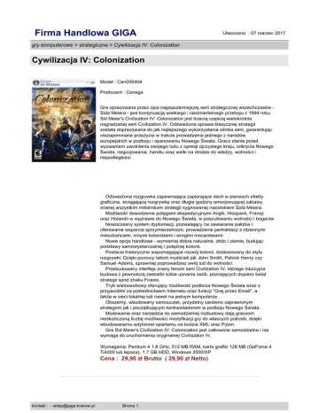 Firma Handlowa GIGA Utworzono : 07 marzec 2017 gry komputerowe > strategiczne > Cywilizacja IV: Colonization Cywilizacja IV: Colonization Model : Cen000404 Producent : Cenega Gra opracowana przez ojca najpopularniejszej serii strategicznej wszechczasów Sida Meiera - jest kontynuacją wielkiego i nieśmiertelnego przeboju z 1994 roku. Sid Meier's Civilization IV: Colonization jest trzecią częścią wielokrotnie nagradzanej serii Civilization IV. Odświeżona oprawa klasycznej strategii została dopracowana do jak najlepszego wykorzystania silnika serii, gwarantując niezapomniane przeżycia w trakcie prowadzenia jednego z narodów europejskich w podboju i opanowaniu Nowego Świata. Gracz stanie przed wyzwaniem uwolnienia swojego ludu z opresji ojczystego kraju, odkrycia Nowego Świata, negocjowania, handlu oraz walki na drodze do władzy, wolności i niepodległości. Odświeżona rozgrywka zapewniająca zapierające dech w piersiach efekty graficzne, wciągającą rozgrywkę oraz długie godziny emocjonującej zabawy, znanej wszystkim miłośnikom strategii sygnowanej nazwiskiem Sida Meiera. Możliwość dowodzenia potęgami ekspedycyjnymi Anglii, Hiszpanii, Francji oraz Holandii w wyprawie do Nowego Świata, w poszukiwaniu wolności i bogactw. Nowoczesny system dyplomacji, pozwalający na zawieranie paktów i oferowanie wsparcia sprzymierzeńcom, prowadzenie pertraktacji z rdzennymi mieszkańcami, innymi kolonistami i wrogimi mocarstwami. Nowe opcje handlowe - wymieniaj dobra naturalne, złoto i ziemie, budując podstawy samowystarczalnej i potężnej kolonii. Postacie historyczne wspomagające rozwój kolonii, dostosowany do stylu rozgrywki. Dzięki pomocy takich myślicieli jak John Smith, Patrick Henry czy Samuel Adams, sprawniej poprowadzisz swój lud do wolności. Przebudowany interfejs znany fanom serii Civilization IV, którego intuicyjna budowa z pewnością zaskarbi sobie uznanie osób, poznających dopiero świat strategii spod znaku Firaxis. Tryb wieloosobowy oferujący możliwość podbicia Nowego Świata wraz z przyjaciółmi za pośrednictwem Internetu oraz funkcji "Graj przez Email", a także w sieci lokalnej lub nawet na jednym komputerze. Obszerny, wbudowany samouczek, przydatny zarówno zaprawionym strategom jak i początkującym konkwistadorom w podboju Nowego Świata. Modowanie oraz narzędzia do samodzielnej rozbudowy dają graczom nieskończoną liczbę możliwości modyfikacji gry do własnych potrzeb, dzięki wbudowanemu edytorowi opartemu na kodzie XML oraz Pyton. Gra Sid Meier's Civilization IV: Colonization jest całkowicie samodzielna i nie wymaga do uruchomienia oryginalnej Civilization IV. Wymagania: Pentium 4 1.8 GHz, 512 MB RAM, karta grafiki 128 MB (GeForce 4 Ti4200 lub lepsza), 1.7 GB HDD, Windows 2000/XP Cena : 29,90 zł Brutto ( 29,90 zł Netto) kontakt : - [email protected] Strona 1