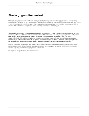 Igołomia-Wawrzeńczyce Ptasia grypa - Komunikat W związku z wystąpieniem na terytorium Rzeczypospolitej Polskiej, wysoce zjadliwej grypy ptaków wywoływanej wirusem grypy A podtyp H5 i H7, Minister Rolnictwa i Rozwoju Wsi w dniu 20 grudnia br. Rozporządzeniem (Poz. 2091) w sprawie zarządzenia środków związanych z wystąpieniem wysoce zjadliwej grypy ptaków, wprowadza od dnia 28 grudnia 2016 r. na terenie całego kraju zakazy i nakazy powszechnie obowiązujące. W szczególności należy zwrócić uwagę na zakaz wynikający z § l pkt. 1 lit. a) tj. organizowania targów, wystaw, pokazów lub konkursów z udziałem żywych kur kaczek, gęsi indyków, przepiórek, perlic, strusi oraz innych bezgrzebieniowców, gołębi bażantów i kuropatw oraz nakaz z § 1 pkt. 2 lit. a) tj. odosobnienie drobiu lub innych ptaków w gospodarstwie, w szczególności zamkniętych obiektach budowlanych lub innych miejscach, w sposób uniemożliwiający kontakt z drobiem lub innymi ptakami utrzymywanymi w innych gospodarstwach oraz ograniczający ich kontakt z dzikimi ptakami. Minister Rolnictwa i Rozwoju Wsi oraz Główny Lekarz Weterynarii wystosowali apel, by bezwzględnie przestrzegać zasady bioasekuracji (Bioasekuracja – biologiczna ochrona fermy, program zdrowotny, działania zmierzające do ochrony populacji przed transmisją czynników zakaźnych) Szczegóły na fotografiach i w plikach do pobrania 1