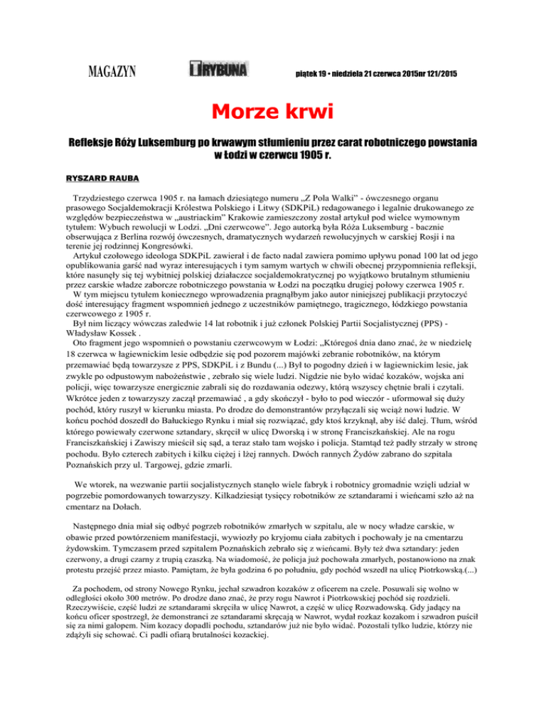MAGAZYN piątek 19 • niedziela 21 czerwca 2015nr 121/2015 Morze krwi Refleksje Róży Luksemburg po krwawym stłumieniu przez carat robotniczego powstania w Łodzi w czerwcu 1905 r. RYSZARD RAUBA Trzydziestego czerwca 1905 r. na łamach dziesiątego numeru „Z Pola Walki” - ówczesnego organu prasowego Socjaldemokracji Królestwa Polskiego i Litwy (SDKPiL) redagowanego i legalnie drukowanego ze względów bezpieczeństwa w „austriackim” Krakowie zamieszczony został artykuł pod wielce wymownym tytułem: Wybuch rewolucji w Lodzi. „Dni czerwcowe”. Jego autorką była Róża Luksemburg - bacznie obserwująca z Berlina rozwój ówczesnych, dramatycznych wydarzeń rewolucyjnych w carskiej Rosji i na terenie jej rodzinnej Kongresówki. Artykuł czołowego ideologa SDKPiL zawierał i de facto nadal zawiera pomimo upływu ponad 100 lat od jego opublikowania garść nad wyraz interesujących i tym samym wartych w chwili obecnej przypomnienia refleksji, które nasunęły się tej wybitniej polskiej działaczce socjaldemokratycznej po wyjątkowo brutalnym stłumieniu przez carskie władze zaborcze robotniczego powstania w Łodzi na początku drugiej połowy czerwca 1905 r. W tym miejscu tytułem koniecznego wprowadzenia pragnąłbym jako autor niniejszej publikacji przytoczyć dość interesujący fragment wspomnień jednego z uczestników pamiętnego, tragicznego, łódzkiego powstania czerwcowego z 1905 r. Był nim liczący wówczas zaledwie 14 lat robotnik i już członek Polskiej Partii Socjalistycznej (PPS) Władysław Kossek . Oto fragment jego wspomnień o powstaniu czerwcowym w Łodzi: „Któregoś dnia dano znać, że w niedzielę 18 czerwca w łagiewnickim lesie odbędzie się pod pozorem majówki zebranie robotników, na którym przemawiać będą towarzysze z PPS, SDKPiL i z Bundu (...) Był to pogodny dzień i w łagiewnickim lesie, jak zwykle po odpustowym nabożeństwie , zebrało się wiele ludzi. Nigdzie nie było widać kozaków, wojska ani policji, więc towarzysze energicznie zabrali się do rozdawania odezwy, którą wszyscy chętnie brali i czytali. Wkrótce jeden z towarzyszy zaczął przemawiać , a gdy skończył - było to pod wieczór - uformował się duży pochód, który ruszył w kierunku miasta. Po drodze do demonstrantów przyłączali się wciąż nowi ludzie. W końcu pochód doszedł do Bałuckiego Rynku i miał się rozwiązać, gdy ktoś krzyknął, aby iść dalej. Tłum, wśród którego powiewały czerwone sztandary, skręcił w ulicę Dworską i w stronę Franciszkańskiej. Ale na rogu Franciszkańskiej i Zawiszy mieścił się sąd, a teraz stało tam wojsko i policja. Stamtąd też padły strzały w stronę pochodu. Było czterech zabitych i kilku ciężej i lżej rannych. Dwóch rannych Żydów zabrano do szpitala Poznańskich przy ul. Targowej, gdzie zmarli. We wtorek, na wezwanie partii socjalistycznych stanęło wiele fabryk i robotnicy gromadnie wzięli udział w pogrzebie pomordowanych towarzyszy. Kilkadziesiąt tysięcy robotników ze sztandarami i wieńcami szło aż na cmentarz na Dołach. Następnego dnia miał się odbyć pogrzeb robotników zmarłych w szpitalu, ale w nocy władze carskie, w obawie przed powtórzeniem manifestacji, wywiozły po kryjomu ciała zabitych i pochowały je na cmentarzu żydowskim. Tymczasem przed szpitalem Poznańskich zebrało się z wieńcami. Były też dwa sztandary: jeden czerwony, a drugi czarny z trupią czaszką. Na wiadomość, że policja już pochowała zmarłych, postanowiono na znak protestu przejść przez miasto. Pamiętam, że była godzina 6 po południu, gdy pochód wszedł na ulicę Piotrkowską.(...) Za pochodem, od strony Nowego Rynku, jechał szwadron kozaków z oficerem na czele. Posuwali się wolno w odległości około 300 metrów. Po drodze dano znać, że przy rogu Nawrot i Piotrkowskiej pochód się rozdzieli. Rzeczywiście, część ludzi ze sztandarami skręciła w ulicę Nawrot, a część w ulicę Rozwadowską. Gdy jadący na końcu oficer spostrzegł, że demonstranci ze sztandarami skręcają w Nawrot, wydał rozkaz kozakom i szwadron puścił się za nimi galopem. Nim kozacy dopadli pochodu, sztandarów już nie było widać. Pozostali tylko ludzie, którzy nie zdążyli się schować. Ci padli ofiarą brutalności kozackiej. Rewolucja się rozszerzała i w odpowiedzi na masowe mordy partie socjalistyczne proklamowały strajk powszechny. 22 czerwca, od samego rana, stanęły wszystkie fabryki, tramwaje pozostały w remizach, a dorożkarze zjechali do domów. Cała ludność robotnicza wyległa na ulice ze szpadlami, siekierami i żelaznymi łomami. Wkrótce zaczęto rozbijać sklepy monopolowe, a znajdujące się tam wódki i spirytus wylewano do ścieków ulicznych. Konfiskowano też znajdującą się w sklepowej kasie gotówkę, pozostawiając w zamian pokwitowania. Inne grupy robotników rąbały i przewracały słupy telefoniczne,' przecinając przy tym druty i kable. Uzbrojeni w rewolwery bojowcy rozpędzali posterunki policyjne, tak że, tak że na kilka godzin Łódź była wolna od szpicli, policji i wojska, które pochowało się w koszarach i cyrkułach. Do późnego popołudnia trwało rozbijanie sklepów monopolowych i niszczenie łączności telefonicznej. Dopiero gdy do Łodzi przybyły nowe pułki wojska i sotnie kozaków, policjanci odważyli się wyjść na ulice i zaczęli strzelać do każdego napotkanego człowieka. Była 8 wieczór, gdy policji udało się oczyścić ulice z ludzi, a specjalne patrole chodziły od jednego do drugiego sklepu monopolowego i spisywały powstałe szkody. Na ulicach nie było żadnego cywila, tylko na chodnikach jechały konne patrole kozackie lub jezdnią przechodziła piechota. W ciągu całego dnia, aż do ciemnej nocy, słychać było częste strzały. Następnego dnia rozgorzały walki w kilku punktach miasta. Na ulicach było pełno wojska. Co kilka kroków stał patrol, który na widok przechodnia z dala już w