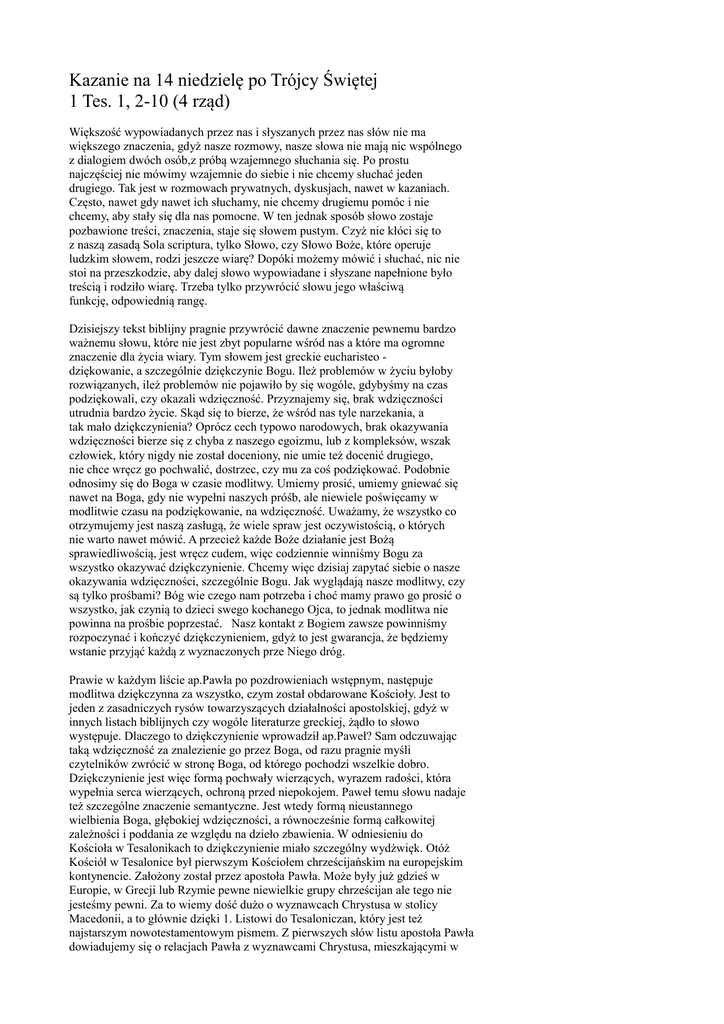 Kazanie na 14 niedzielę po Trójcy Świętej 1 Tes. 1, 2