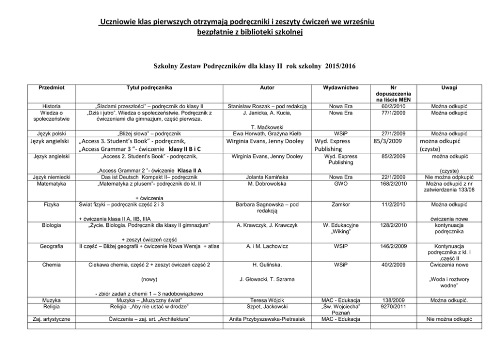Uczniowie klas pierwszych otrzymają podręczniki i zeszyty ćwiczeń we wrześniu bezpłatnie z biblioteki szkolnej Szkolny Zestaw Podręczników dla klasy II rok szkolny 2015/2016 Przedmiot Tytuł podręcznika Autor Wydawnictwo Historia Wiedza o społeczeństwie „Śladami przeszłości” – podręcznik do klasy II „Dziś i jutro”. Wiedza o społeczeństwie. Podręcznik z ćwiczeniami dla gimnazjum, część pierwsza. Stanisław Roszak – pod redakcją J. Janicka, A. Kucia, Nowa Era Nowa Era Język polski „Bliżej słowa” – podręcznik Język angielski „Access 3. Student’s Book” - podręcznik, „Access Grammar 3 ”- ćwiczenie klasy II B i C T. Maćkowski Ewa Horwath, Grażyna Kiełb Wirginia Evans, Jenny Dooley WSiP Wyd. Express Publishing Nr dopuszczenia na liście MEN 60/2/2010 77/1/2009 27/1/2009 85/3/2009 Uwagi Można odkupić Można odkupić Można odkupić można odkupić (czyste) Język angielski „Access 2. Student’s Book” - podręcznik, Wirginia Evans, Jenny Dooley Wyd. Express Publishing 85/2/2009 można odkupić Język niemiecki Matematyka „Access Grammar 2 ”- ćwiczenie Klasa II A Das ist Deutsch Kompakt II– podręcznik „Matematyka z plusem”- podręcznik do kl. II Jolanta Kamińska M. Dobrowolska Nowa Era GWO 22/1/2009 168/2/2010 (czyste) Nie można odpkupić Można odkupić z nr zatwierdzenia 133/08 Barbara Sagnowska – pod redakcją Zamkor 11/2/2010 Można odkupić A. Krawczyk, J. Krawczyk W. Edukacyjne „Wiking” 128/2/2010 ćwiczenia nowe kontynuacja podręcznika Fizyka Biologia + ćwiczenia Świat fizyki – podręcznik część 2 i 3 + ćwiczenia klasa II A, IIB, IIIA „Życie. Biologia. Podręcznik dla klasy II gimnazjum” Geografia + zeszyt ćwiczeń część II część – Bliżej geografii + ćwiczenie Nowa Wersja + atlas A. i M. Lachowicz WSIP 146/2/2009 Chemia Ciekawa chemia, część 2 + zeszyt ćwiczeń część 2 H. Gulińska, WSiP 40/2/2009 (nowy) J. Głowacki, T. Szrama Muzyka Religia - zbiór zadań z chemii 1 – 3 nadobowiązkowo Muzyka – „Muzyczny świat” Religia -„Aby nie ustać w drodze” Teresa Wójcik Szpet, Jackowski Zaj. artystyczne Ćwiczenia – zaj. art. „Architektura” Anita Przybyszewska-Pietrasiak Kontynuacja podręcznika z kl. I ,część II Ćwiczenia nowe „Woda i roztwory wodne” MAC - Edukacja „Św. Wojciecha” Poznań MAC - Edukacja 138/2009 9270/2011 Można odkupić. Nie można odkupić Szkolny Zestaw Podręczników dla klasy III rok szkolny 2015/2016 Przedmiot Tytuł podręcznika Autor Wydawnictwo Historia „Śladami przeszłości” – podręcznik kl. III St. Roszak, A. Łaszkiewicz Wychowanie obywatelskie Język polski Język niemiecki Język angielski „Dzis i jutro”- Wiedza o społeczeństwie – podręcznik z ćwiczeniami dla gimnazjum. Część druga. „Bliżej słowa” – podręcznik do klasy III. Das ist Deutsch – KOMPAKT cz. 3 “Egzamin gimnazjalny. Repetytorium. poziom podstawowy i rozszerzony”. J. Janicka, A. Janicki, A. Kucia, T. Mackowski Ewa Horwath, Grażyna Kiełb Jolanta Kamińska Wirginia Evans, Jenny Dooley Wydawnictwo Nowa Era Wydawnictwo Nowa Era WSiP Nowa Era Wyd. Express Publishing Nr dopuszczenia na liście MEN 60/3/2011 Uwagi można odkupić 77/2/2010 można odkupić 27/1/2009 22/1/2009 85/4/2009 można odkupić Nie można odkupić 168/03/2011 Można odkupić 40/2/2009 Podręcznik można odkupić, ćwiczenie nowe. Klasa III a – tylko repetytorium Matematyka klasa III b- ACCESS 4- podręcznik + repetytorium „Matematyka z plusem” - podręcznik do klasy III M. Dobrowolska Chemia Ciekawa chemia, część 3 + zeszyt ćwiczeń część 3 (nowy) H. Gulińska, Gdańskie Wyd. Oświatowe WSiP Informatyka Biologia Geografia - zbiór zadań z chemii 1 – 3 nadobowiązkowo Informatyka „Podstawowe tematy nie tylko dla gimnazjum” „Życie”. Biologia . Podręcznik dla kl. III i zeszyt ćwiczeń. „Bliżej geografii”- podręcznik część 3 J. Głowacki, T. Szrama Grażyna Koba A. Krawczyń, J. Krawczyk A. Lechowicz, M. Lechowicz Wyd. Szkolne PWN Wyd. Eduk. „Wiking” WSiP 146/2/2009 128/3/2010 146/3/2011 Podręcznik do kl I i III można odkupić Nowa wersja ćwiczeń Fizyka + zeszyt ćwiczeń część 3 + atlas Świat fizyki – część 3 Barbara Sagnowska – pod redakcją Zamkor 11/3/2010 można odkupić + ćwiczenia Ćwiczenia „Malarstwo, rzeźba” Małgorzata Czuj MAC - EDUKACJA Żyć w miłości Boga Szpot, Jackowski św. Wojciech Poznań „Zajęcia techniczne w gimnazjum” „Edukacja dla bezpieczeństwa” – podręcznik Urszula Białka B. Breitkopf, D. Czyżów OPERON WSIP Zajęcia artystyczne Religia Technika Edukacja dla bezpieczeństwa ćwiczenia nowe można odkupić 199/2009 2006/2009 Podręcznik do kl I i III