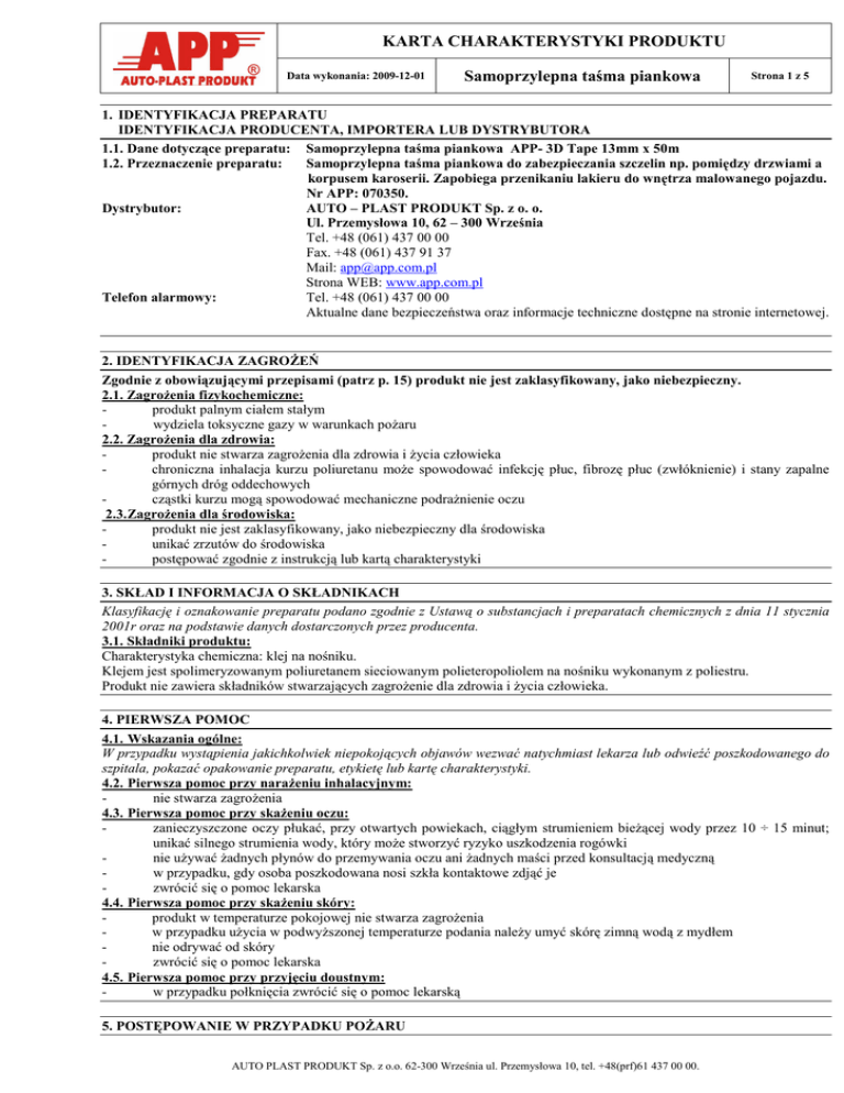 KARTA CHARAKTERYSTYKI PRODUKTU Data wykonania: 2009-12-01 Samoprzylepna taśma piankowa Strona 1 z 5 1. IDENTYFIKACJA PREPARATU IDENTYFIKACJA PRODUCENTA, IMPORTERA LUB DYSTRYBUTORA 1.1. Dane dotyczące preparatu: Samoprzylepna taśma piankowa APP- 3D Tape 13mm x 50m 1.2. Przeznaczenie preparatu: Samoprzylepna taśma piankowa do zabezpieczania szczelin np. pomiędzy drzwiami a korpusem karoserii. Zapobiega przenikaniu lakieru do wnętrza malowanego pojazdu. Nr APP: 070350. Dystrybutor: AUTO – PLAST PRODUKT Sp. z o. o. Ul. Przemysłowa 10, 62 – 300 Września Tel. +48 (061) 437 00 00 Fax. +48 (061) 437 91 37 Mail: [email protected] Strona WEB: www.app.com.pl Telefon alarmowy: Tel. +48 (061) 437 00 00 Aktualne dane bezpieczeństwa oraz informacje techniczne dostępne na stronie internetowej. 2. IDENTYFIKACJA ZAGROśEŃ Zgodnie z obowiązującymi przepisami (patrz p. 15) produkt nie jest zaklasyfikowany, jako niebezpieczny. 2.1. ZagroŜenia fizykochemiczne: produkt palnym ciałem stałym wydziela toksyczne gazy w warunkach poŜaru 2.2. ZagroŜenia dla zdrowia: produkt nie stwarza zagroŜenia dla zdrowia i Ŝycia człowieka chroniczna inhalacja kurzu poliuretanu moŜe spowodować infekcję płuc, fibrozę płuc (zwłóknienie) i stany zapalne górnych dróg oddechowych cząstki kurzu mogą spowodować mechaniczne podraŜnienie oczu 2.3. ZagroŜenia dla środowiska: produkt nie jest zaklasyfikowany, jako niebezpieczny dla środowiska unikać zrzutów do środowiska postępować zgodnie z instrukcją lub kartą charakterystyki 3. SKŁAD I INFORMACJA O SKŁADNIKACH Klasyfikację i oznakowanie preparatu podano zgodnie z Ustawą o substancjach i preparatach chemicznych z dnia 11 stycznia 2001r oraz na podstawie danych dostarczonych przez producenta. 3.1. Składniki produktu: Charakterystyka chemiczna: klej na nośniku. Klejem jest spolimeryzowanym poliuretanem sieciowanym polieteropoliolem na nośniku wykonanym z poliestru. Produkt nie zawiera składników stwarzających zagroŜenie dla zdrowia i Ŝycia człowieka. 4. PIERWSZA POMOC 4.1. Wskazania ogólne: W przypadku wystąpienia jakichkolwiek niepokojących objawów wezwać natychmiast lekarza lub odwieźć poszkodowanego do szpitala, pokazać opakowanie preparatu, etykietę lub kartę charakterystyki. 4.2. Pierwsza pomoc przy naraŜeniu inhalacyjnym: nie stwarza zagroŜenia 4.3. Pierwsza pomoc przy skaŜeniu oczu: zanieczyszczone oczy płukać, przy otwartych powiekach, ciągłym strumieniem bieŜącej wody przez 10 ÷ 15 minut; unikać silnego strumienia wody, który moŜe stworzyć ryzyko uszkodzenia rogówki nie uŜywać Ŝadnych płynów do przemywania oczu ani Ŝadnych maści przed konsultacją medyczną w przypadku, gdy osoba poszkodowana nosi szkła kontaktowe zdjąć je zwrócić się o pomoc lekarska 4.4. Pierwsza pomoc przy skaŜeniu skóry: produkt w temperaturze pokojowej nie stwarza zagroŜenia w przypadku uŜycia w podwyŜszonej temperaturze podania naleŜy umyć skórę zimną wodą z mydłem nie odrywać od skóry zwrócić się o pomoc lekarska 4.5. Pierwsza pomoc przy przyjęciu doustnym: w przypadku połknięcia zwrócić się o pomoc lekarską 5. POSTĘPOWANIE W PRZYPADKU POśARU AUTO PLAST PRODUKT Sp. z o.o. 62-300 Września ul. Przemysłowa 10, tel. +48(prf)61 437 00 00. KARTA CHARAKTERYSTYKI PRODUKTU Data wykonania: 2009-12-01 Samoprzylepna taśma piankowa Strona 2 z 5 5.1. ZagroŜenia poŜarowe: produkt palnym ciałem stałym wydziela toksyczne gazy w warunkach poŜaru 5.2. Polecane środki gaśnicze: ditlenek węgla (CO2) proszki gaśnicze piany odporne na alkohol woda - prądy rozproszone 5.3. ZagroŜenia specjalne: opakowania naraŜone na działanie ognia lub wysokiej temperatury chłodzić wodą z bezpiecznej odległości, a jeŜeli to moŜliwe usunąć je z obszaru zagroŜenia podczas spalania preparatu powstają dymy zawierające niebezpieczne dla zdrowia substancje chemiczne, m.in. tlenek i ditlenek węgla 5.4. Zalecenia ogólne: zaalarmować o poŜarze z obszaru zagroŜenia usunąć wszystkie osoby nie biorące udziału w akcji gaśniczej w razie potrzeby zarządzić ewakuację unikać wdychania dymu usunąć wszystkie źródła zapłonu stosować odzieŜ i sprzęt ochronny chronić układ oddechowy chłodzić wodą pojemniki naraŜone na kontakt z ogniem nie dopuścić do przedostania się wód gaśniczych do kanalizacji 5.5. Niebezpieczne produkty spalania: tlenki węgla toksyczne gazy i dymy 5.6. Środki ochrony osobistej: niezaleŜny aparat do oddychania i odzieŜ ochronna 6. POSTĘPOWANIE W PRZYPADKU NIEZAMIERZONEGO UWOLNIENIA DO ŚRODOWISKA 6.1. Zalecenia ogólne: nie stwarza zagroŜenia 6.2. Środki ochrony osobistej: nie stwarza zagroŜenia 6.3. Środki ostroŜności w zakresie ochrony środowiska: nie stwarza zagroŜenia 6.4. Metody oczyszczania: uwolniony materiał zebrać i przeznaczyć do powtórnego uŜycia lub utylizować zgodnie z punktem 13 7. POSTĘPOWANIE Z PREPARATEM I JEGO MAGAZYNOWANIE 7.1. Obchodzenie się z substancją: nie wolno spoŜywać posiłków, pić oraz palić tytoniu podczas pracy z preparatem z wyjątkiem miejsc do tego przeznaczonych; naleŜy myć ręce przed przerwami i po zakończeniu pracy, jeśli to potrzebne zastosować krem do rąk nie dopuścić do zanieczyszczenia oczu, skóry i odzieŜy 7.2. Magazynowanie: nie uŜywać ognia otwartego w pobliŜu składowanego produktu eliminować moŜliwość gromadzenia się ładunków elektrostatycznych. Stosować odpowiednie uziemienie zabezpieczyć produkt przed działaniem podwyŜszonej temperatury i bezpośredniego oddziaływania promieniowania słonecznego magazynować w temperaturze poniŜej 35oC zabezpieczyć przed wpływem wilgoci zapewnić wentylację przy składowaniu zabezpieczyć przed oddziaływaniem silnych utleniaczy i innych substancji reagujących z tworzywem zapewnić bezpieczne układanie jednostek paletyzowanych lub produktu w innych opakowaniach produkt naleŜy przechowywać w pomieszczeniach suchych, w orygina
