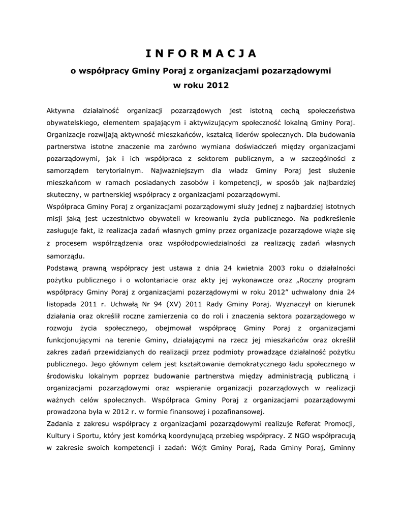 INFORMACJA o współpracy Gminy Poraj z organizacjami pozarządowymi w roku 2012 Aktywna działalność organizacji pozarządowych jest istotną cechą społeczeństwa obywatelskiego, elementem spajającym i aktywizującym społeczność lokalną Gminy Poraj. Organizacje rozwijają aktywność mieszkańców, kształcą liderów społecznych. Dla budowania partnerstwa istotne znaczenie ma zarówno wymiana doświadczeń między organizacjami pozarządowymi, jak i ich współpraca z sektorem publicznym, a w szczególności z samorządem terytorialnym. Najważniejszym dla władz Gminy Poraj jest służenie mieszkańcom w ramach posiadanych zasobów i kompetencji, w sposób jak najbardziej skuteczny, w partnerskiej współpracy z organizacjami pozarządowymi. Współpraca Gminy Poraj z organizacjami pozarządowymi służy jednej z najbardziej istotnych misji jaką jest uczestnictwo obywateli w kreowaniu życia publicznego. Na podkreślenie zasługuje fakt, iż realizacja zadań własnych gminy przez organizacje pozarządowe wiąże się z procesem współrządzenia oraz współodpowiedzialności za realizację zadań własnych samorządu. Podstawą prawną współpracy jest ustawa z dnia 24 kwietnia 2003 roku o działalności pożytku publicznego i o wolontariacie oraz akty jej wykonawcze oraz „Roczny program współpracy Gminy Poraj z organizacjami pozarządowymi w roku 2012” uchwalony dnia 24 listopada 2011 r. Uchwałą Nr 94 (XV) 2011 Rady Gminy Poraj. Wyznaczył on kierunek działania oraz określił roczne zamierzenia co do roli i znaczenia sektora pozarządowego w rozwoju życia społecznego, obejmował współpracę Gminy Poraj z organizacjami funkcjonującymi na terenie Gminy, działającymi na rzecz jej mieszkańców oraz określił zakres zadań przewidzianych do realizacji przez podmioty prowadzące działalność pożytku publicznego. Jego głównym celem jest kształtowanie demokratycznego ładu społecznego w środowisku lokalnym poprzez budowanie partnerstwa między administracją publiczną i organizacjami pozarządowymi oraz wspieranie organizacji pozarządowych w realizacji ważnych celów społecznych. Współpraca Gminy Poraj z organizacjami pozarządowymi prowadzona była w 2012 r. w formie finansowej i pozafinansowej. Zadania z zakresu współpracy z organizacjami pozarządowymi realizuje Referat Promocji, Kultury i Sportu, który jest komórką koordynującą przebieg współpracy. Z NGO współpracują w zakresie swoich kompetencji i zadań: Wójt Gminy Poraj, Rada Gminy Poraj, Gminny Ośrodek Kultury im. Janusza Gniatkowskiego, Gminny Ośrodek Pomocy Społecznej, Gminna Komisja Rozwiązywania Problemów Alkoholowych. Obecnie na terenie Gminy Poraj działają: Stowarzyszenia: Towarzystwo Przyjaciół Żarek Letniska im. Stefanii hrabiny Raczyńskiej Ludowy Klub Sportowy „Polonia” Poraj Częstochowski Okręgowy Związek Żeglarski Stowarzyszenie Yacht Club „Zefir – Drakkar” Klub Żeglarski „Korsarz” Yacht Club Polski Częstochowa Wodne Ochotnicze Pogotowie Ratunkowe Porajskie Towarzystwo Krzewienia Kultury Fizycznej i Sportu w Poraju Stowarzyszenie Pomocy Dzieciom „ASPERA” Stowarzyszenie Miłośników Twórczości Janusza Gniatkowskiego „Apasjonata” Polski Związek Wędkarski w Poraju Związek Kombatantów i Byłych Więźniów Politycznych RP Związek Żołnierzy Wojska Polskiego Koło Nr 1 w Poraju Polski Związek Niewidomych w Poraju Stowarzyszenie Rozwoju Wsi Masłońskie Stowarzyszenie Abstynenckie „Feniks” Związek Harcerstwa Polskiego w Poraju Polski Związek Łowiecki Uczniowski Klub Sportowy „Hetman” Częstochowa Częstochowska Akademia Sztuk Walk Sportu i Rekreacji "Uechi-Ryu” Uczniowski Klub Sportowy przy Gimnazjum im. Kazimierza Górskiego w Poraju Grupa Inicjatywna „Mieszkańcy dla bezpieczeństwa” Polski Związek Emerytów, Rencistów i Inwalidów – Koło Terenowe w Poraju Polski Związek Emerytów, Rencistów i Inwalidów – Koło Terenowe w Żarkach Letnisku Polski Związek Emerytów, Rencistów i Inwalidów – Koło Terenowe w Choroniu Polski Związek Emerytów, Rencistów i Inwalidów – Koło Terenowe w Jastrzębiu Polski Związek Pszczelarski – Koło Terenowe w Poraju Polski Związek Pszczelarski – Koło Terenowe w Choroniu; Pozostałe organizacje tj. działające na zasadach zbliżonych do organizacji pozarządowej, nie będące de facto organizacją pozarządową: Koło Gospodyń Wiejskich „Malwy” z Poraja Koło Gospodyń Wiejskich „Porajanki” z Poraja Koło Gospodyń Wiejskich „Choronianki” z Choronia Koło Gospodyń Wiejskich „Kalina” z Jastrzębia i Kuźnicy Klub „Natalinki” z Masłońskiego Jednostki ochotniczych straży pożarnych: Ochotnicza Straż Pożarna w Poraju Ochotnicza Straż Pożarna w Żarkach Letnisku Ochotnicza Straż Pożarna w Choroniu Ochotnicza Straż Pożarna w Jastrzębiu Ochotnicza Straż Pożarna w Kuźnicy Starej Ochotnicza Straż Pożarna w Gęzynie Klub Globtroterów „Siedmiomilowe buty” Amatorski Klub Sportowy „Leśne Ludki” Gmina Poraj wspiera lokalne organizacje pozarządowe, które wraz z rozwojem demokracji i społeczeństwa obywatelskiego w naszym Państwie, skutecznie odgrywają w codziennym życiu coraz większą rolę. Obszary współpracy 1. Upowszechnianie kultury fizycznej Celem współpracy było upowszechnianie kultury fizycznej i realizacja programów sportowych dla dzieci i młodzieży poprzez stwarzanie warunków organizacyjnych dla rozwoju kultury fizycznej i sportu, doskonalenie uzdolnień i sprawności fizycznej oraz organizacja zajęć i współzawodnictwa sportowego w następujących dyscyplinach: piłka nożna, piłka siatkowa, piłka siatkowa plażowa, piłka koszykowa, tenis stołowy, badminton, boks, sporty wodne żeglarstwo i inne dyscypliny sportowe. W tym celu Wójt Gminy Poraj ogłosił dwa konkursy ofert na realizację zadań w dziedzinie kultury fizycznej. W 2012 roku ogłoszono i rozstrzygnięto dwa konkursy na 
