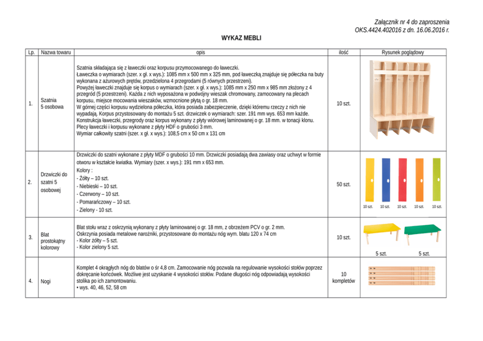 Załącznik nr 4 do zaproszenia OKS.4424.402016 z dn. 16.06.2016 r. WYKAZ MEBLI Lp. 1. 2. 3. 4. Nazwa towaru Szatnia 5 osobowa Drzwiczki do szatni 5 osobowej Blat prostokątny kolorowy Nogi opis ilość Szatnia składająca się z ławeczki oraz korpusu przymocowanego do ławeczki. Ławeczka o wymiarach (szer. x gł. x wys.): 1085 mm x 500 mm x 325 mm, pod ławeczką znajduje się półeczka na buty wykonana z ażurowych prętów, przedzielona 4 przegrodami (5 równych przestrzeni). Powyżej ławeczki znajduje się korpus o wymiarach (szer. x gł. x wys.): 1085 mm x 250 mm x 985 mm złożony z 4 przegród (5 przestrzeni). Każda z nich wyposażona w podwójny wieszak chromowany, zamocowany na plecach korpusu, miejsce mocowania wieszaków, wzmocnione płytą o gr. 18 mm. W górnej części korpusu wydzielona półeczka, która posiada zabezpieczenie, dzięki któremu rzeczy z nich nie wypadają. Korpus przystosowany do montażu 5 szt. drzwiczek o wymiarach: szer. 191 mm wys. 653 mm każde. Konstrukcja ławeczki, przegrody oraz korpus wykonany z płyty wiórowej laminowanej o gr. 18 mm. w tonacji klonu. Plecy ławeczki i korpusu wykonane z płyty HDF o grubości 3 mm. Wymiar całkowity szatni (szer. x gł. x wys.): 108,5 cm x 50 cm x 131 cm 10 szt. Drzwiczki do szatni wykonane z płyty MDF o grubości 10 mm. Drzwiczki posiadają dwa zawiasy oraz uchwyt w formie otworu w kształcie kwiatka. Wymiary (szer. x wys.): 191 mm x 653 mm. Kolory : - Żółty – 10 szt. - Niebieski – 10 szt. - Czerwony – 10 szt. - Pomarańczowy – 10 szt. - Zielony - 10 szt. 50 szt. Blat stołu wraz z oskrzynią wykonany z płyty laminowanej o gr. 18 mm, z obrzeżem PCV o gr. 2 mm. Oskrzynia posiada metalowe narożniki, przystosowane do montażu nóg wym. blatu 120 x 74 cm - Kolor żółty – 5 szt. - Kolor zielony 5 szt. 10 szt. Rysunek poglądowy 10 szt. 10 szt. 5 szt. Komplet 4 okrągłych nóg do blatów o śr 4,8 cm. Zamocowanie nóg pozwala na regulowanie wysokości stołów poprzez dokręcanie końcówek. Możliwe jest uzyskanie 4 wysokości stołów. Podane długości nóg odpowiadają wysokości stolika po ich zamontowaniu. • wys. 40, 46, 52, 58 cm 10 kompletów 10 szt. 10 szt. 5 szt. 10 szt. Załącznik nr 4 do zaproszenia OKS.4424.402016 z dn. 16.06.2016 r. WYKAZ MEBLI Lp. 5. Nazwa towaru Krzesło z regulowaną wysokością opis Krzesełko z regulowaną wysokością, na stelażu metalowym z siedziskiem i oparciem - Siedzisko i oparcie wykonane z lakierowanej sklejki bukowej . - Stelaż wykonany z rury płasko-owalnej o wym. 38 x 20 mm i 30 x 15 mm. - Siedzisko wyprofilowane, eliminujące ucisk pod kolanami w trakcie siedzenia. - Zaokrąglone oparcie - Podstawa w kształcie litery H - Zatyczki podstawie z tworzywa sztucznego chroniące podłogę przed zarysowaniem. - min. 3 stopki umieszczone pod siedziskiem, chroniące blat stołu przed zarysowanie - Możliwość sztaplowania krzeseł min. 3 szt. - Możliwość zawieszania na blacie stołu. Stelaż w kolorze żółtym - 25 szt., Sklejka bukowa siedziska i oparcia o gr. 6 mm. Regulacja krzesła w roz. 1-2 Produkt musi posiadać certyfikat za zgodność z normą: PN-EN 1729-1:2007, PN-EN 1729-2:2012, PN-F06009:2001 ilość 50 szt. Rysunek poglądowy 25szt. Stelaż w kolorze zielonym - 25 szt., Sklejka bukowa siedziska i oparcia o gr. 6 mm Regulacja krzesła w roz. 2-3 Produkt musi posiadać certyfikat za zgodność z normą: PN-EN 1729-1:2007, PN-EN 1729-2:2012, PN-F06009:2001 25szt. 6. Duża szafa Szafa z kolorową aplikacją drzewa z ptaszkiem na lewych drzwiach w kolorze brązowym, zielonym i żółtym. Dostosowana do przechowywania segregatorów. Wyposażona w przegrodę oraz 3 półeczki (4 przestrzenie) po każdej stronie. Szafa wykonana z płyty laminowanej o gr 18 mm w tonacji brzozy. Szafa umieszczona na cokole. Uchwyty do szaf okrągłe drewniane. - szer. drzwi prawych 34,5 cm, szer. drzwi lewych 43,5 cm, wym. 83 x 40 x 158 cm Aplikacje wykonane są wielowarstwowo z płyty MDF o gr. 12 mm ( płyty nałożone na siebie) dając efekt 3D, każdy kolor płyty to oddzielna warstwa. Aplikacja zajmuje 2/3 wysokości drzwi Produkt musi posiadać certyfikat za zgodność z normą: PN-EN 14073-2:2006, PN-F-06010-05:1990, PN-F-06009:2001 1 szt. Załącznik nr 4 do zaproszenia OKS.4424.402016 z dn. 16.06.2016 r. WYKAZ MEBLI Lp. 7. 8. Nazwa towaru opis ilość Szafka Szafa postawiona na cokole. Korpusy,ściany wykonane z płyty laminowanej o gr. 18 mm w kolorze brzozy, zabezpieczonej trwałym obrzeżem MULTIPLEX imitującym strukturę sklejki o gr. 2 mm. Plecy wykonane z płyty HDF o gr 3 mm w kolorze korpusu. Aplikacje wykonane są wielowarstwowo z płyty MDF o gr. 12 mm ( płyty nałożone na siebie) dając efekt 3D, mocowane do tylnej płyty szafki(za wyjątkiem aplikacji do drzwiczek, którą montuje się do frontu drzwiczek), każdy kolor płyty to oddzielna warstwa. Kontury motywów wykonane są za pomocą techniki frezowania. Drzwiczki wykonane z płyty MDF o gr. 12 mm. Szafka z drzwiczkami z aplikacją wiewiórki - Szafka dwudrzwiowa o wym. skrzyni 75 x 40 x 87 cm (+ aplikacja 51 cm) Aplikacja wiewiórki w kolorach- pomarańczowym, żółtym - 2 półki (3 przestrzenie), zamknięte dwuskrzydłowymi drzwiczkami w kolorze zielonym z aplikacją w kształcie liścia i żołędzia w kolorach czerwony, żółty i brązowy. Produkt musi posiadać certyfikat za zgodność z normą: PN-EN 14073-2:2006, PN-F-06010-05:1990, PN-F-06009:2001 1 szt. Szafka Szafka postawiona na cokole. Korpusy, ściany wykonane z płyty laminowanej o gr. 18 mm w kolorze brzozy, zabezpieczonej trwałym obrzeżem MULTIPLEX imitującym strukturę sklejki o gr. 2 mm. Plecy wykonane z płyty HDF o gr 3 mm w kolorze korpusu Aplikacje wykonane są wielowarstwowo z płyty MDF o gr. 12 mm ( płyty nałożone na siebie) dając efekt 3D, mocowane do tylnej płyty szafki ( za wyjątkiem aplikacji do drzwiczek, którą montuje się do frontu drzwiczek), każdy kolor płyty to oddzielna w