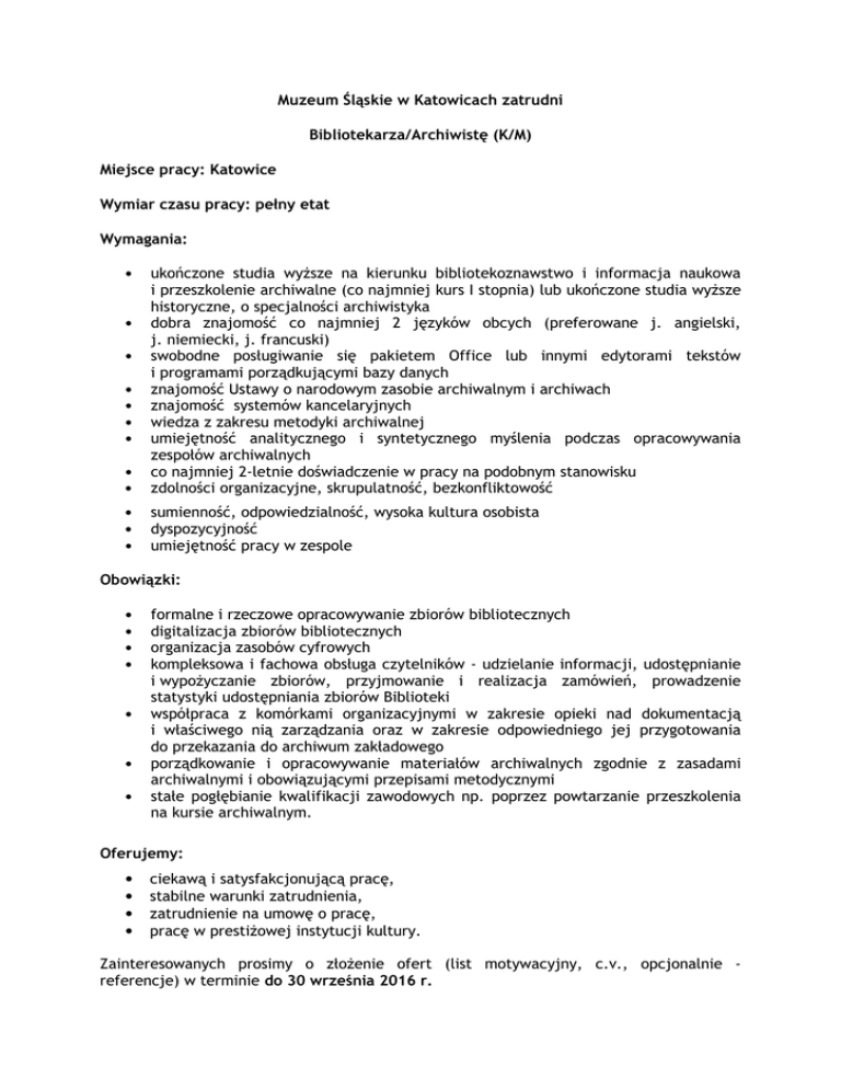 Muzeum Śląskie w Katowicach zatrudni Bibliotekarza/Archiwistę (K/M) Miejsce pracy: Katowice Wymiar czasu pracy: pełny etat Wymagania: • • ukończone studia wyższe na kierunku bibliotekoznawstwo i informacja naukowa i przeszkolenie archiwalne (co najmniej kurs I stopnia) lub ukończone studia wyższe historyczne, o specjalności archiwistyka dobra znajomość co najmniej 2 języków obcych (preferowane j. angielski, j. niemiecki, j. francuski) swobodne posługiwanie się pakietem Office lub innymi edytorami tekstów i programami porządkującymi bazy danych znajomość Ustawy o narodowym zasobie archiwalnym i archiwach znajomość systemów kancelaryjnych wiedza z zakresu metodyki archiwalnej umiejętność analitycznego i syntetycznego myślenia podczas opracowywania zespołów archiwalnych co najmniej 2-letnie doświadczenie w pracy na podobnym stanowisku zdolności organizacyjne, skrupulatność, bezkonfliktowość • • • sumienność, odpowiedzialność, wysoka kultura osobista dyspozycyjność umiejętność pracy w zespole • • • • • • • Obowiązki: • • • • • • • formalne i rzeczowe opracowywanie zbiorów bibliotecznych digitalizacja zbiorów bibliotecznych organizacja zasobów cyfrowych kompleksowa i fachowa obsługa czytelników - udzielanie informacji, udostępnianie i wypożyczanie zbiorów, przyjmowanie i realizacja zamówień, prowadzenie statystyki udostępniania zbiorów Biblioteki współpraca z komórkami organizacyjnymi w zakresie opieki nad dokumentacją i właściwego nią zarządzania oraz w zakresie odpowiedniego jej przygotowania do przekazania do archiwum zakładowego porządkowanie i opracowywanie materiałów archiwalnych zgodnie z zasadami archiwalnymi i obowiązującymi przepisami metodycznymi stałe pogłębianie kwalifikacji zawodowych np. poprzez powtarzanie przeszkolenia na kursie archiwalnym. Oferujemy: • • • • ciekawą i satysfakcjonującą pracę, stabilne warunki zatrudnienia, zatrudnienie na umowę o pracę, pracę w prestiżowej instytucji kultury. Zainteresowanych prosimy o złożenie ofert (list motywacyjny, c.v., opcjonalnie referencje) w terminie do 30 września 2016 r. Oferty mogą być składane osobiście lub za pośrednictwem poczty pod adresem: Muzeum Śląskie Dział Kadr ul. T. Dobrowolskiego 1 40-205 Katowice z dopiskiem: Bibliotekarz/Archiwista lub przesłane drogą elektroniczną na adres: [email protected] Muzeum zaznacza sobie prawo do kontaktu z wybranymi osobami. Na zgłoszeniu należy dopisać zgodę na „przetwarzanie przez Muzeum Śląskie moich danych osobowych zawartych w ofercie pracy dla potrzeb niezbędnych do realizacji procesu rekrutacji” (Ustawa z dn. 29 sierpnia 1997 o ochronie danych osobowych, Dz. U. Nr 133, poz. 883 ze zm.).