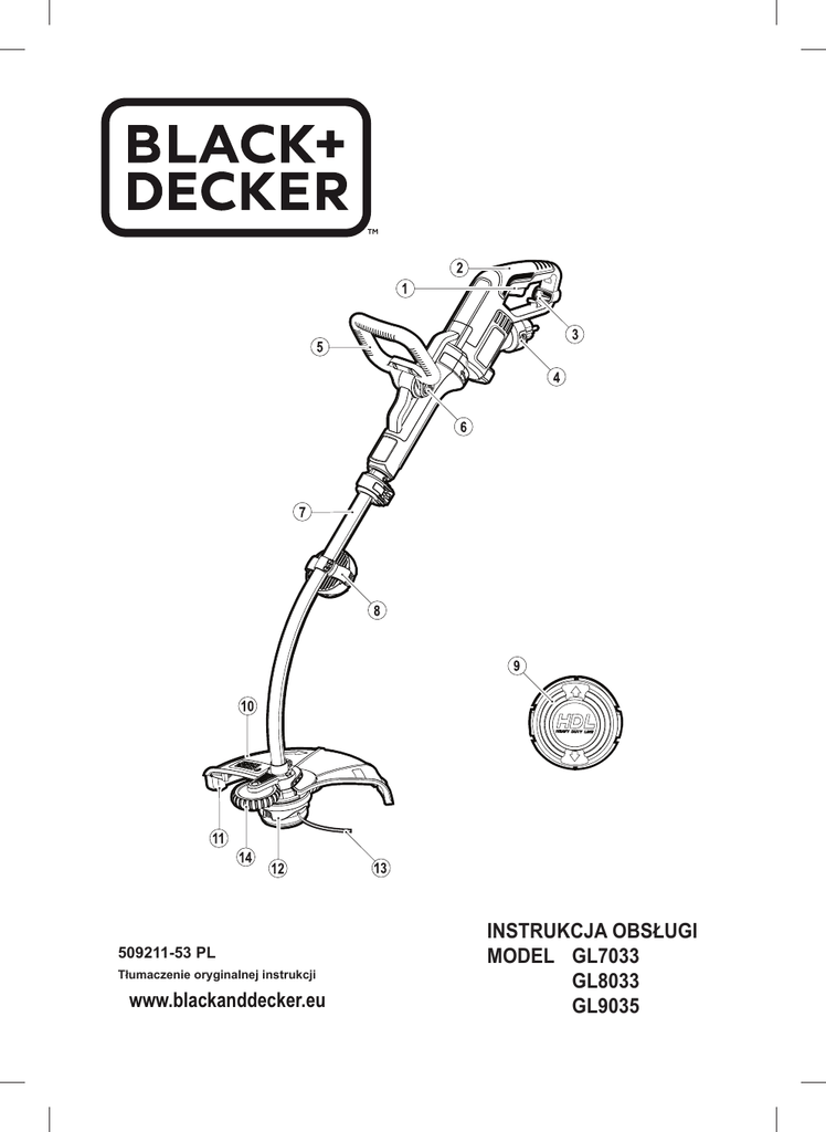 509211-53 PL Tłumaczenie oryginalnej instrukcji www.blackanddecker.eu INSTRUKCJA OBSŁUGI MODEL GL7033 GL8033 GL9035 2 3 4 POLSKI Zastosowanie zgodne z przeznaczeniem Kosiarka żyłkowa BLACK+DECKER jest przeznaczona do koszenia trawy na brzegach trawników i w trudno dostępnych miejscach. Narzędzie to nie jest przystosowane do celów profesjonalnych. ♦ ♦ Wskazówki dotyczące bezpieczeństwa Pozostałe zagrożenia Uwaga! Przy korzystaniu z elektronarzędzi dokładnie przestrzegaj wskazówek zawartych w tej instrukcji i podstawowych przepisów bhp, by zminimalizować ryzyko pożaru, porażenia prądem elektrycznym, doznania urazu ciała i szkód rzeczowych. Uwaga! Przy korzystaniu z elektronarzędzi dokładnie przestrzegaj reguł bezpieczeństwa. Przeczytaj niniejszą instrukcję dla własnego bezpieczeństwa i pewności oraz osób znajdujących się w pobliżu. Zachowaj tę instrukcję dla przyszłego użytkowania. ♦ Przed uruchomieniem kosiarki dokładnie przeczytaj niniejszą instrukcję. ♦ W instrukcji tej opisano zastosowanie zgodne z przeznaczeniem. Używanie innych przystawek i akcesoriów niż zalecane w tej instrukcji lub wykonywanie prac niezgodnych z przeznaczeniem narzędzia może doprowadzić do wypadku. ♦ Przechowuj niniejszą instrukcję na wypadek, gdyby znów była kiedyś potrzebna. Przy korzystaniu z kosiarki mogą zaistnieć dodatkowe zagrożenia nieuwzględnione w przepisach bezpieczeństwa. Z reguły zachodzą one w przypadku niewłaściwego lub zbyt długiego używania narzędzia. Nawet przy przestrzeganiu odnośnych przepisów bezpieczeństwa i stosowaniu wszystkich urządzeń zabezpieczających nadal występują pewne zagrożenia. Zaliczają się do nich: ♦ Obrażenia ciała wskutek dotknięcia obracających się/ruchomych elementów. ♦ Skaleczenia, jakich można doznać przy wymianie elementów, noży i akcesoriów. ♦ Narażenie zdrowia przy dłuższym używaniu elektronarzędzia. W takich sytuacjach rób regularne przerwy w pracy. ♦ Pogorszenie słuchu. ♦ Upośledzenie zdrowia wskutek wdychania pyłu (np. powstającego podczas obróbki drewna, a zwłaszcza dębu, buku i MDF). Zastosowanie kosiarki Po użyciu Przy korzystaniu z kosiarki cały czas zachowuj ostrożność. ♦ Zawsze zakładaj okulary ochronne ♦ Zabraniaj używania kosiarki dzieciom ani osobom, które nie zapoznały się z tą instrukcją. ♦ Nie dopuszczaj dzieci ani zwierząt do miejsca pracy i pilnuj, by nikt nie dotykał kosiarki ani kabla sieciowego. ♦ Gdy kosisz w pobliżu dzieci, zachowuj szczególną ostrożność. ♦ Zabrania się używania kosiarki młodocianym i słabym osobom bez nadzoru doświadczonego użytkownika. ♦ Kosiarka ta nie jest zabawką. ♦ Używaj kosiarki tylko za dnia lub przy bardzo dobrym sztucznym oświetleniu. ♦ Nie wystawiaj kosiarki na działanie deszczu. Nie używaj jej też w wilgotnym ani mokrym otoczeniu. ♦ Nie zanurzaj kosiarki w wodzie. ♦ Nie otwieraj obudowy kosiarki. Nie ma w niej żadnych elementów podlegających konserwacji przez użytkownika. ♦ Nie używaj kosiarki w otoczeniu zagrożonym wybuchem, w którym znajdują się palne ciecze, gazy lub pyły. ♦ Nigdy nie ciągnij za kabel, by wyjąć wtyczkę z gniazda sieciowego. Grozi to uszkodzeniem wtyczki i kabla. ♦ ♦ ♦ Nieużywaną kosiarkę przechowuj w suchym, niedostępnym dla dzieci miejscu. Dzieci nie powinny mieć dostępu do przechowywanego urządzenia. Gdy kosiarka ma być transportowana w samochodzie, zabezpiecz ją w bagażniku, by nie mogła się przemieścić w razie nagłej zmiany prędkości lub kierunku ruchu pojazdu. Kontrola i naprawy ♦ ♦ ♦ ♦ ♦ Odłączaj kosiarkę od sieci zanim rozpoczniesz jej przegląd, czyszczenie, i jeśli jest w użytkowaniu. Przed użyciem sprawdź kosiarkę, czy nie jest uszkodzona, czy jakieś elementy nie są pęknięte i czy jakieś inne usterki nie zakłócają prawidłowej pracy narzędzia. Nie używaj kosiarki, gdy jakaś jej część jest niesprawna. Naprawy lub wymiany wadliwych części zlecaj tylko jednemu z naszych warsztatów serwisowych. Nigdy nie próbuj wyjmować ani wymieniać jakichkolwiek elementów, jeżeli nie przewiduje tego niniejsza instrukcja obsługi. Zastosowanie przedłużacza Używaj tyko takiego przedłużacza, który został dopuszczony do eksploatacji i wytrzymuje pobór mocy przez elektronarzędzie (patrz: Dane techniczne). Musi on nadawać się do pracy na wolnym powietrzu i być odpowiednio oznakowany. Kabel HO5VV-F o przekroju 1,5 mm² i długości 30 m nie powoduje zauważalnego spadku mocy. Przed zastosowaniem sprawdź przedłu- Bezpieczeństwo innych osób ♦ niedoświadczonych, chyba że znajdują się pod nadzorem odpowiedzialnego za bezpieczeństwo fachowca. Pilnuj dzieci, by nie bawiły się tym urządzeniem. Zatrzymaj urządzenie, jeśli w pobliżu są inne osoby, szczególnie dzieci lub zwierzęta. Zabrania się używania tego elektronarzędzia przez dzieci i osoby o ograniczonej sprawności fizycznej, czuciowej lub umysłowej. To samo dotyczy osób 5 żacz, czy nie jest uszkodzony, zużyty i nie wykazuje objawów starzenia. Wadliwy przedłużacz wymień na nowy. Gdy korzystasz z bębna, zawsze całkowicie odwijaj z niego kabel. Przed uruchomieniem kosiarki przeczytaj niniejszą instrukcję. Dodatkowe przepisy bezpieczeństwa pracy kosiarek żyłkowych Na czas pracy zakładaj okulary ochronne. Uwaga! Po wyłączeniu kosiarki szpula z żyłką przez jakiś czas jeszcze się obraca. ♦ Zapoznaj się z elementami obsługi i zasadami prawidłowego użytkowania kosiarki. ♦ Przed użyciem sprawdź kabel sieciowy i przedłużacz, czy nie są uszkodzone lub zużyte. W razie uszkodzenia kabla natychmiast odłącz go od sieci. NIE DOTYKAJ KABLA, DOPÓKI JEST PRZYŁĄCZONY DO SIECI. ♦ Nie używaj kosiarki z uszkodzonym lub zużytym kablem. ♦ Dla ochrony stóp zakładaj solidne obuwie na szorstkiej podeszwie lub buty z cholewami. ♦ Dla ochrony nóg zakładaj dług